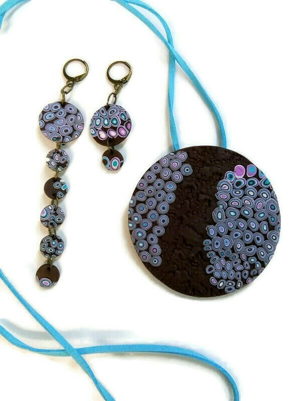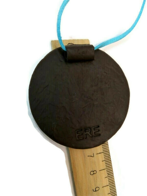 Χειροποίητο κολιέ μακρύ με δερμάτινο κορδόνι σε καφέ-γαλάζιο χρώμα από πολυμερικό πηλό. Ο πολυμερικός πηλός είναι μη – τοξικός. Δεν θα πρέπει να χρησιμοποιείτε αρώματα ή άλλα καλλυντικά, που μπορεί να οδηγήσουν σε μόνιμη φθορά του κοσμήματος. Συνιστάται να φυλάτε τα κοσμήματα με πολυμερικό πηλό, στο δικό τους κουτί. Ένα τόσο μοναδικό κόσμημα που σίγουρα θα εντυπωσιάσει! Ενα πολύ ιδιαίτερο δωράκι με μοναδικό σχέδιο! Μπορείτε να κάνετε σετ με παρόμοια σκουλαρίκια.