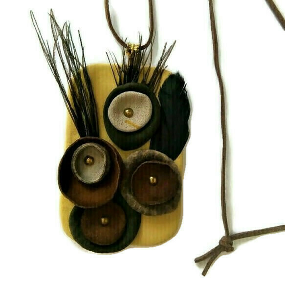 Δερμάτινο Κολιέ με Μακρύ Δερμάτινο Λουράκι, Μεταλλικά Στοιχεία και Φτερά