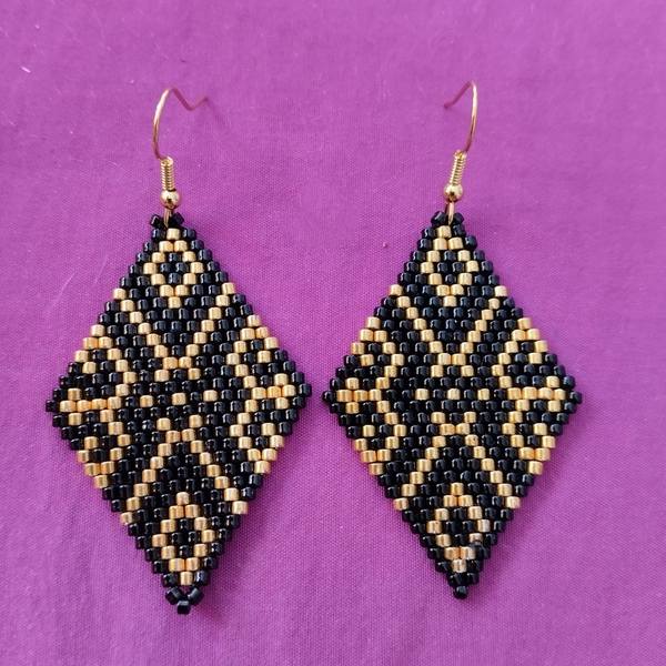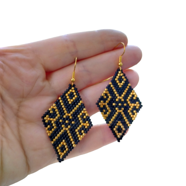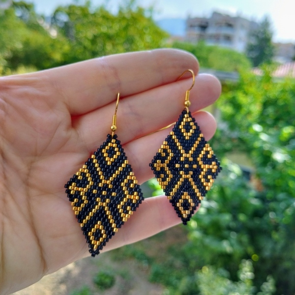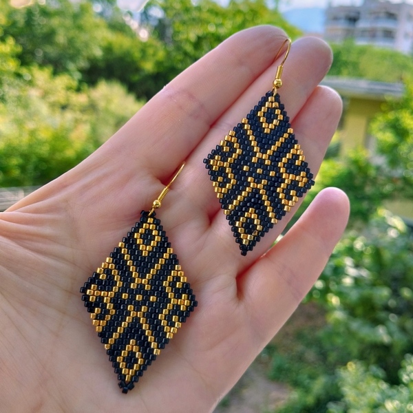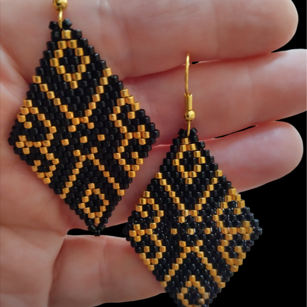 Αυτό το ζευγάρι σκουλαρίκια διαθέτει ένα κομψό σχέδιο διαμάντι, κατασκευασμένο από μαύρες και χρυσές χάντρες Miyuki των δύο χιλιοστών. Με διαστάσεις 5×3 εκ., αυτά τα σκουλαρίκια προσθέτουν μια ξεχωριστή πολυτέλεια σε κάθε εμφάνιση. Ο γάντζος και όλα τα μεταλλικά στοιχεία είναι από ανοξείδωτο ατσάλι, εξασφαλίζοντας ότι δεν μαυρίζουν και δεν προκαλούν αλλεργίες, προσφέροντας έτσι άνεση και διαχρονική κομψότητα.