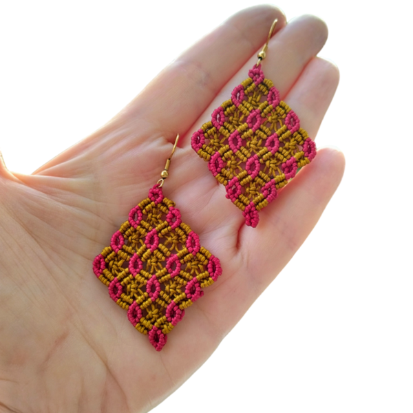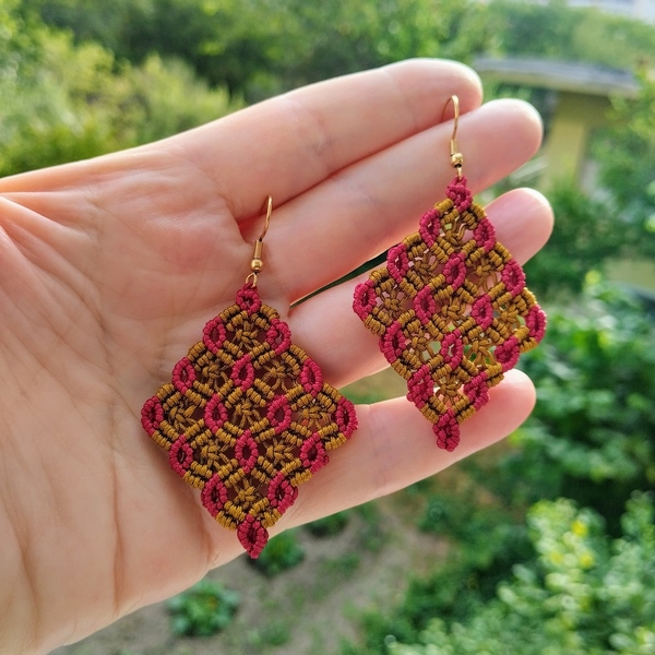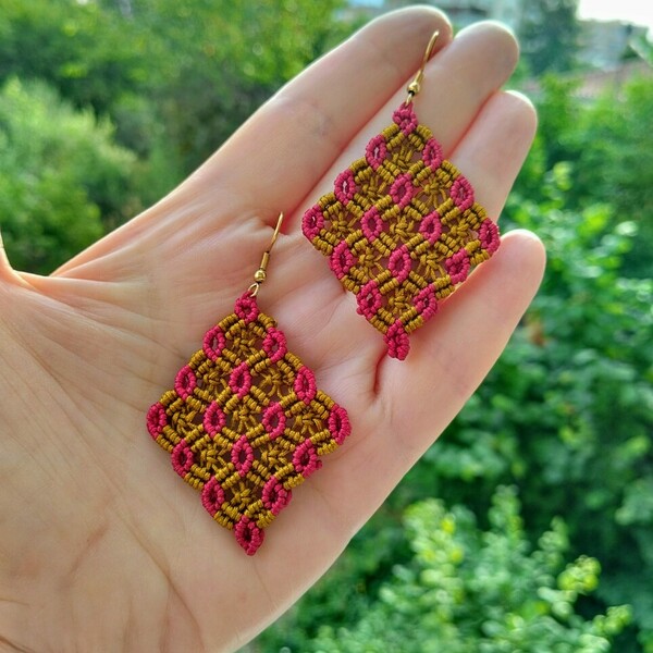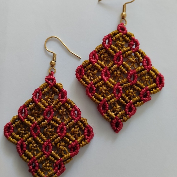 Ένα ζευγάρι boho σκουλαρίκια μακραμέ. Σε σχέδιο ρόμβου. Είναι με κερωμένη κλωστή ειδική για μακραμέ, στα χρώματα του χακί χρυσού και στο Μπορντό. Το σχέδιο του είναι πανέμορφο. Οι διαστάσεις του είναι 5×4 εκ. Ο γάντζος είναι χρυσός από ανοξείδωτο ατσάλι. Υπάρχει δυνατότητα να γίνουν και σε άλλα χρώματα.