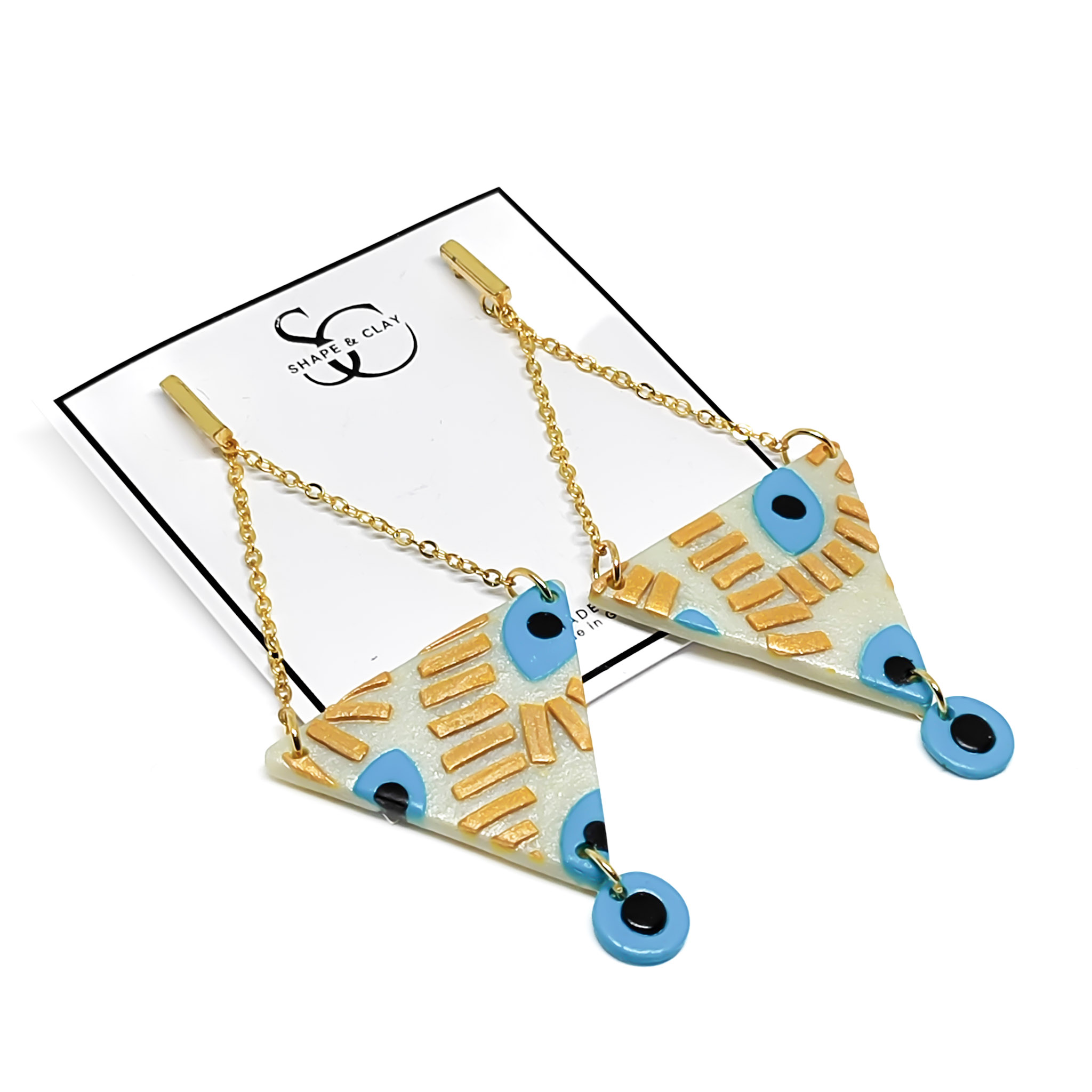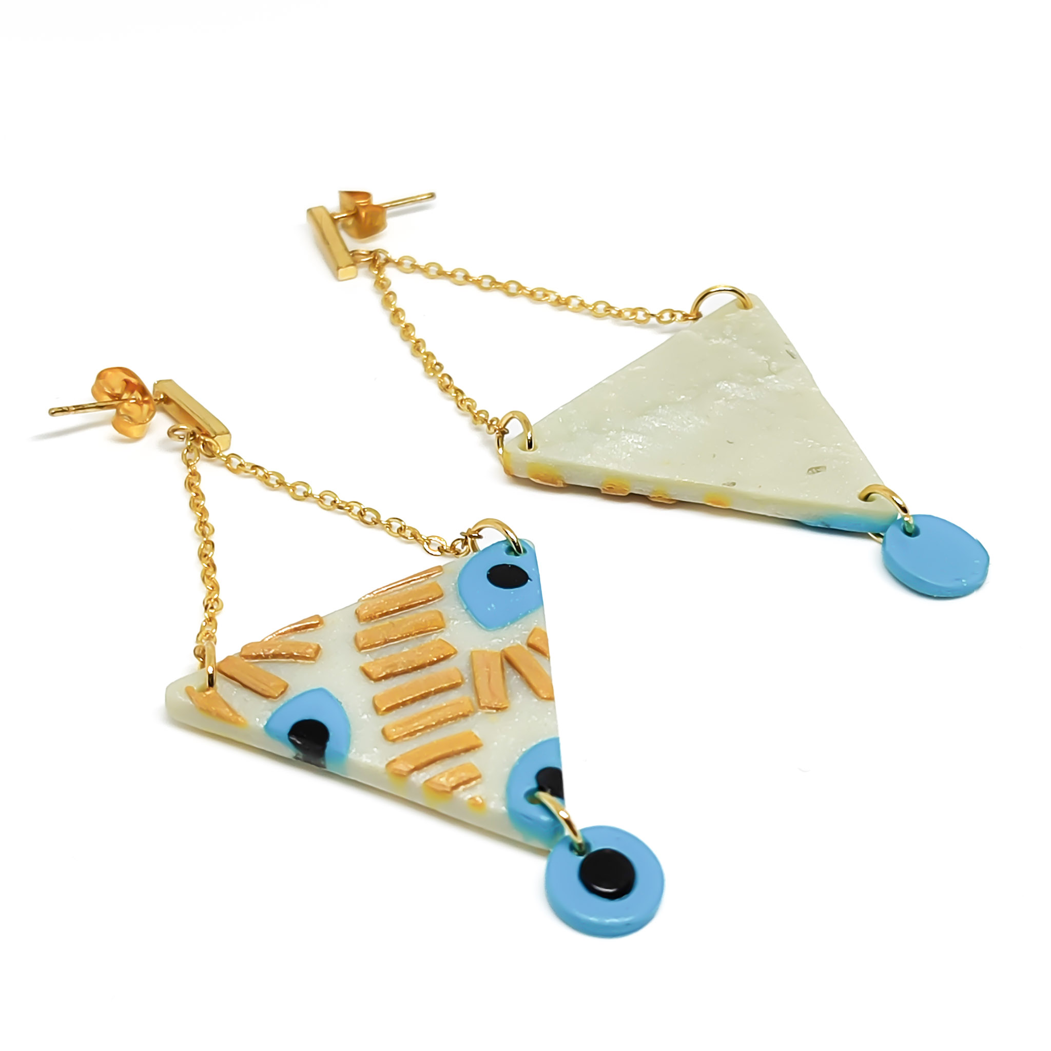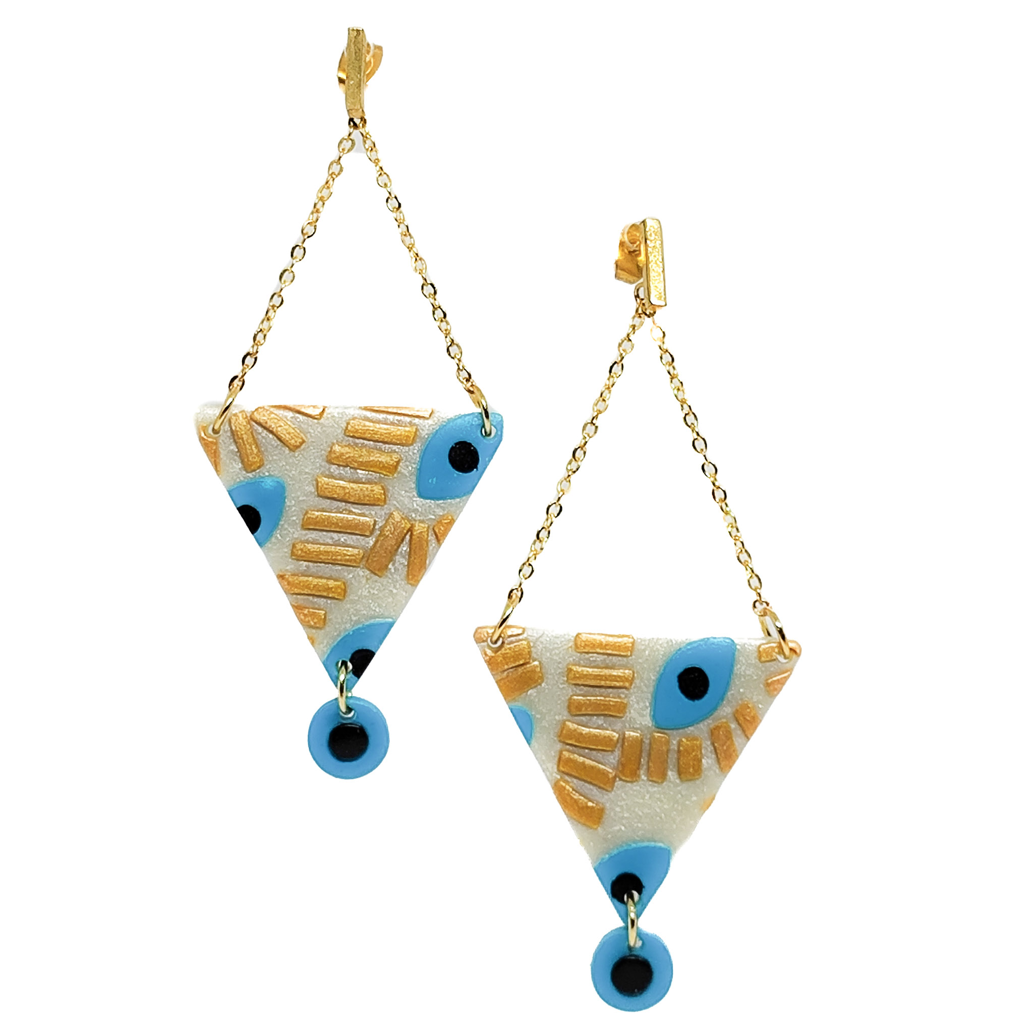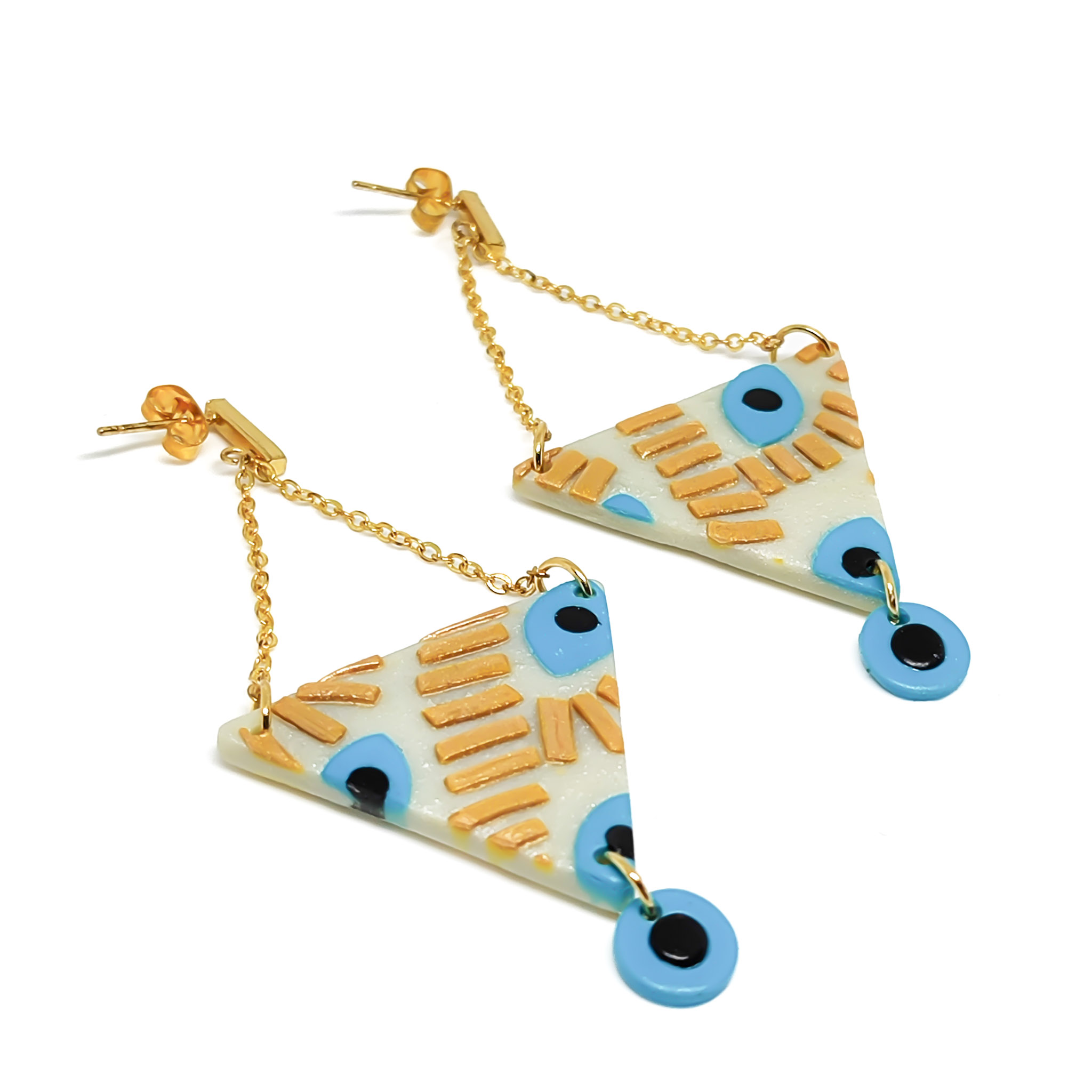 Χειροποίητα σκουλαρίκια από πολυμερικό πηλό, σε σχήμα τριγώνου με λευκό περλέ χρώμα και σχέδιο μάτι (evil eye). Οι χρυσές λεπτομέρειες είναι ζωγραφισμένες στο χέρι. Τα καρφάκια είναι από επιχρυσωμένο υποαλλεργικό ανοξείδωτο ατσάλι. Τα σκουλαρίκια έχουν βερνίκι gloss για προστασία και αντοχή. Ελαφριά και άνετα στη χρήση.