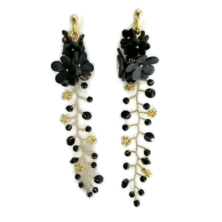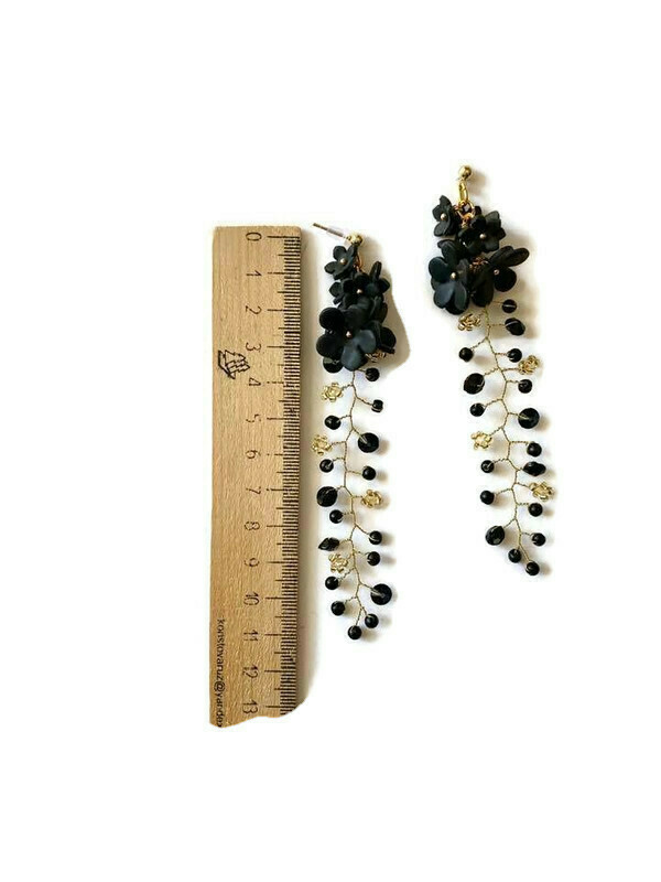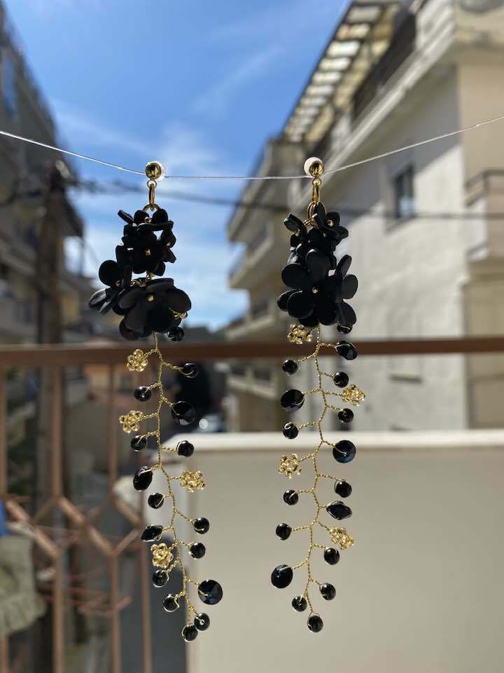Εντυπωσιακά καρφωτά σκουλαρίκια κατασκευασμένα από σύρμα και διακοσμημένα με μαύρα λουλούδια από πολυμερικό πηλό. Με μήκος 11 εκ., αυτά τα σκουλαρίκια συνδυάζουν το μοντέρνο στυλ με την κομψότητα. Το μαύρο χρώμα των λουλουδιών προσδίδει μια διακριτική αλλά εντυπωσιακή αισθητική, καθιστώντας τα ιδανικά για βραδινές εμφανίσεις ή για να προσθέσετε μια ξεχωριστή πινελιά στην καθημερινή σας εμφάνιση.