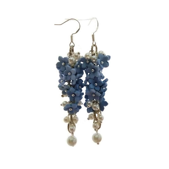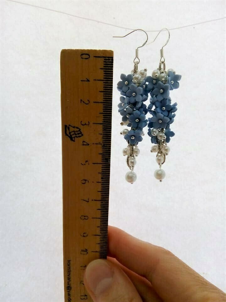 Σκουλαρίκια κρεμαστά γυναικεία χειροποίητα από πολυμερικό πηλό με γαλάζια λουλούδια. Σε δύο σχέδια. Μηκος 6 εκ. Η τιμή για ένα κομμάτι. Μεταλλικοί γάντζοι σκουλαρικιών ασημένιοι 925. Ο πολυμερικός πηλός είναι μη – τοξικός. Δεν θα πρέπει να χρησιμοποιείτε αρώματα ή άλλα καλλυντικά, που μπορεί να οδηγήσουν σε μόνιμη φθορά του κοσμήματος. Συνιστάται να φυλάσσονται τα κοσμήματα με πολυμερικό πηλό στο δικό τους κουτί. Ένα τόσο μοναδικό κόσμημα που σίγουρα θα εντυπωσιάσει! Είναι το καλύτερο δώρο για εσένα ή κάποιον αγαπημένο σου!