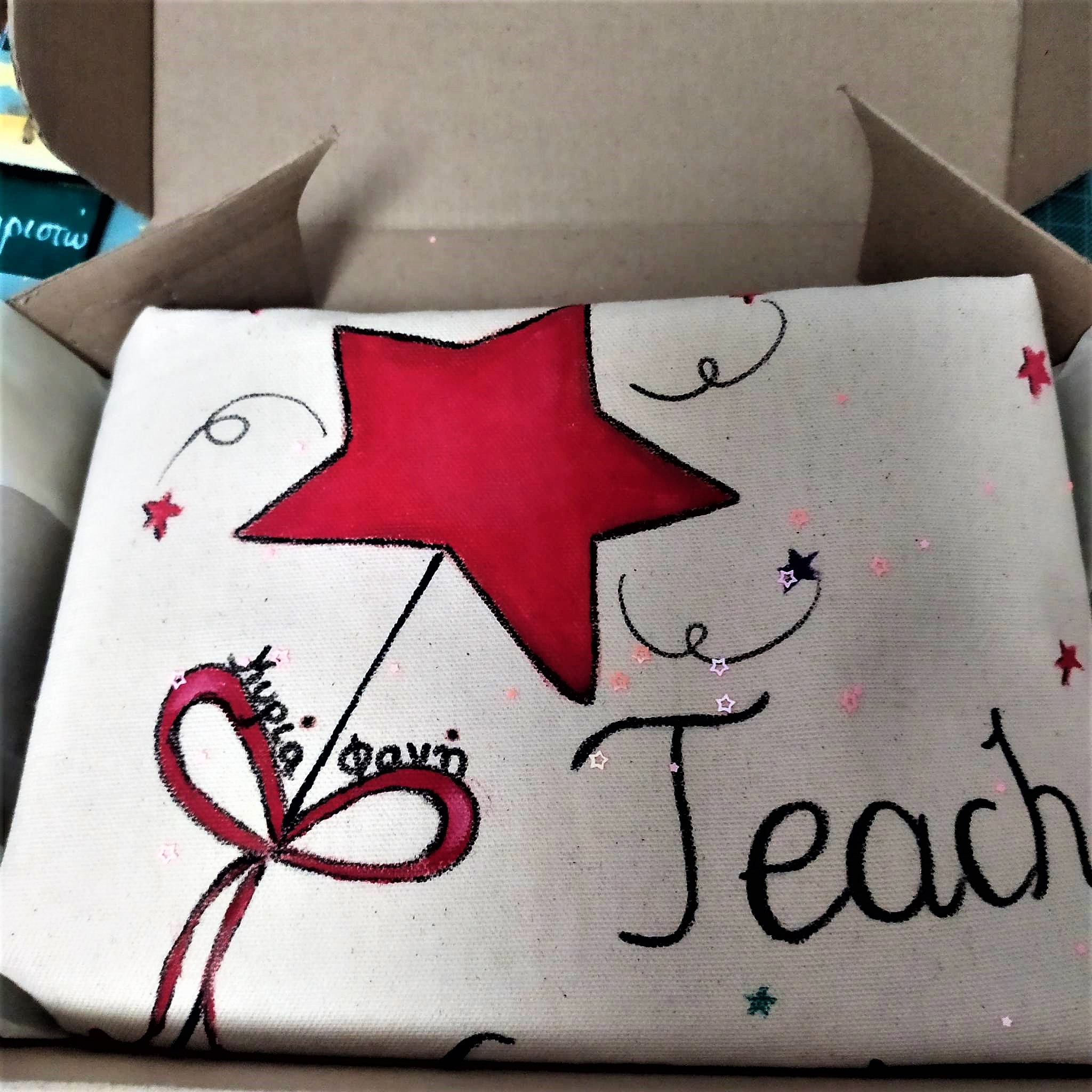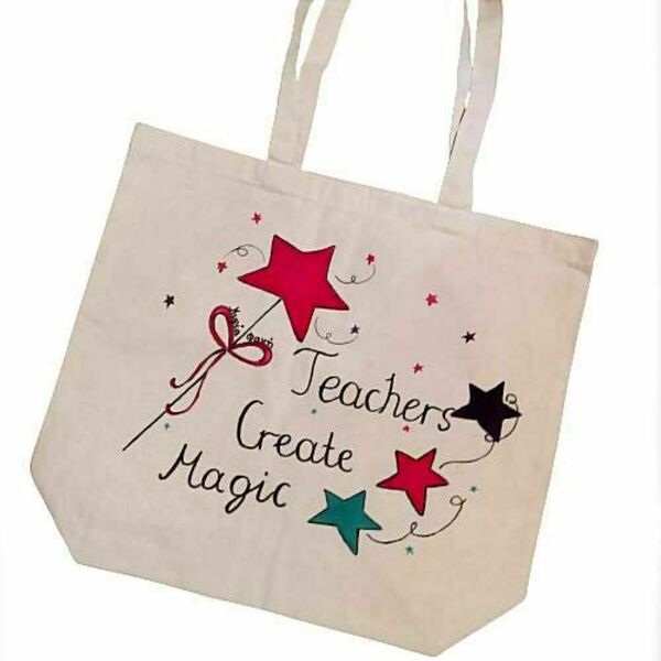 Τσάντα βαμβακερή 38*44 “magic” (tote bag) ζωγραφισμένη στο χέρι με ειδικά χρώματα για ύφασμα, ιδανική για δασκάλα .