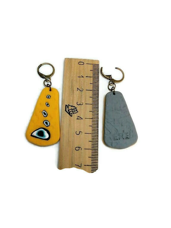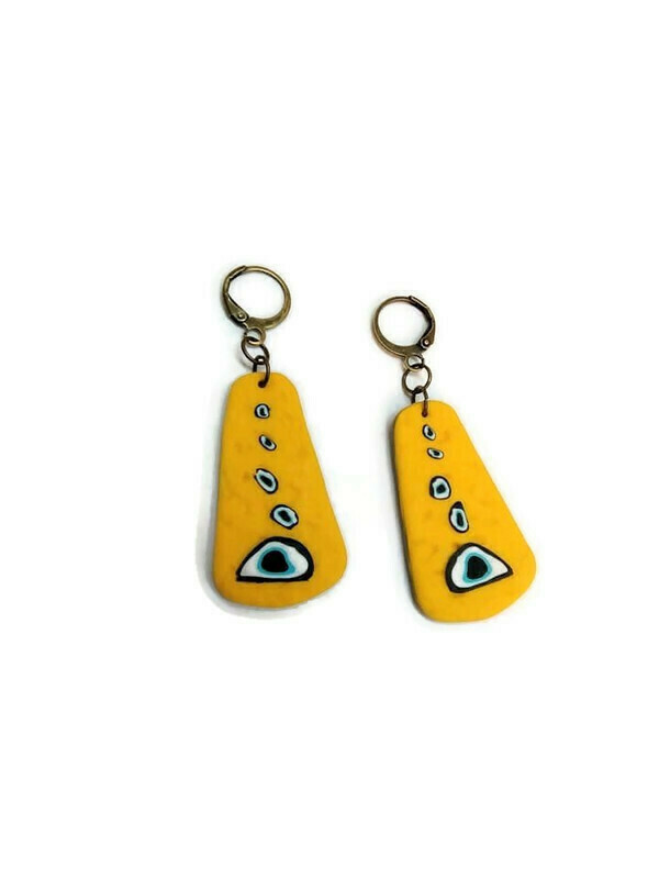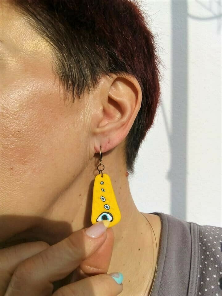 Γυναικεία, κρεμαστά, χειροποίητα, σκουλαρίκια σε κίτρινο χρώμα από πολυμερικό πηλό. Μοναδικό σχέδιο με γαλλικό κούμπωμα. Κοσμήματα με Ματάκια .Ο πολυμερικός πηλός είναι μη – τοξικός. Δεν θα πρέπει να χρησιμοποιείτε αρώματα ή άλλα καλλυντικά, που μπορεί να οδηγήσουν σε μόνιμη φθορά του κοσμήματος. Συνιστάται να φυλάσσονται τα κοσμήματα με πολυμερικό πηλό, στο δικό τους κουτί. Ένα τόσο μοναδικό κόσμημα που σίγουρα θα εντυπωσιάσει! Ενα πολύ ιδιαίτερο δωράκι με μοναδικό σχέδιο! Μπορείτε να κάνετε σετ με παρόμοιο κολιέ.