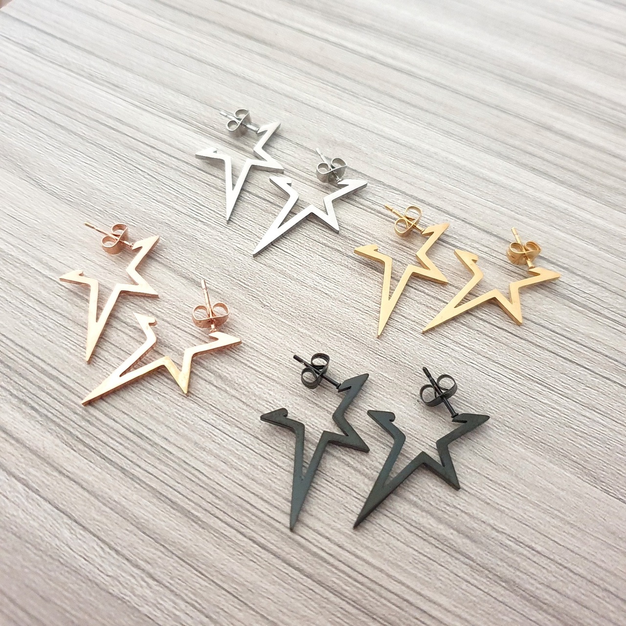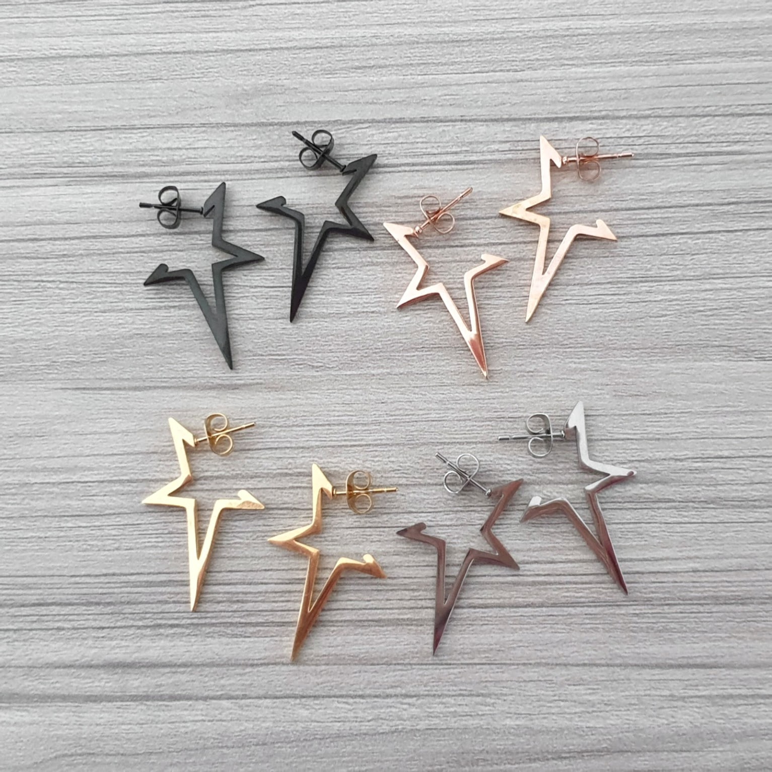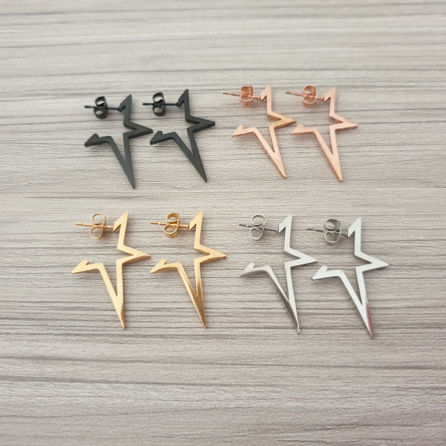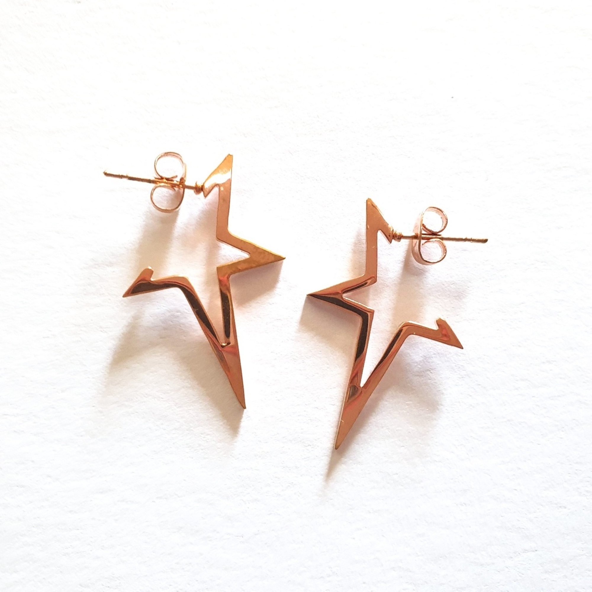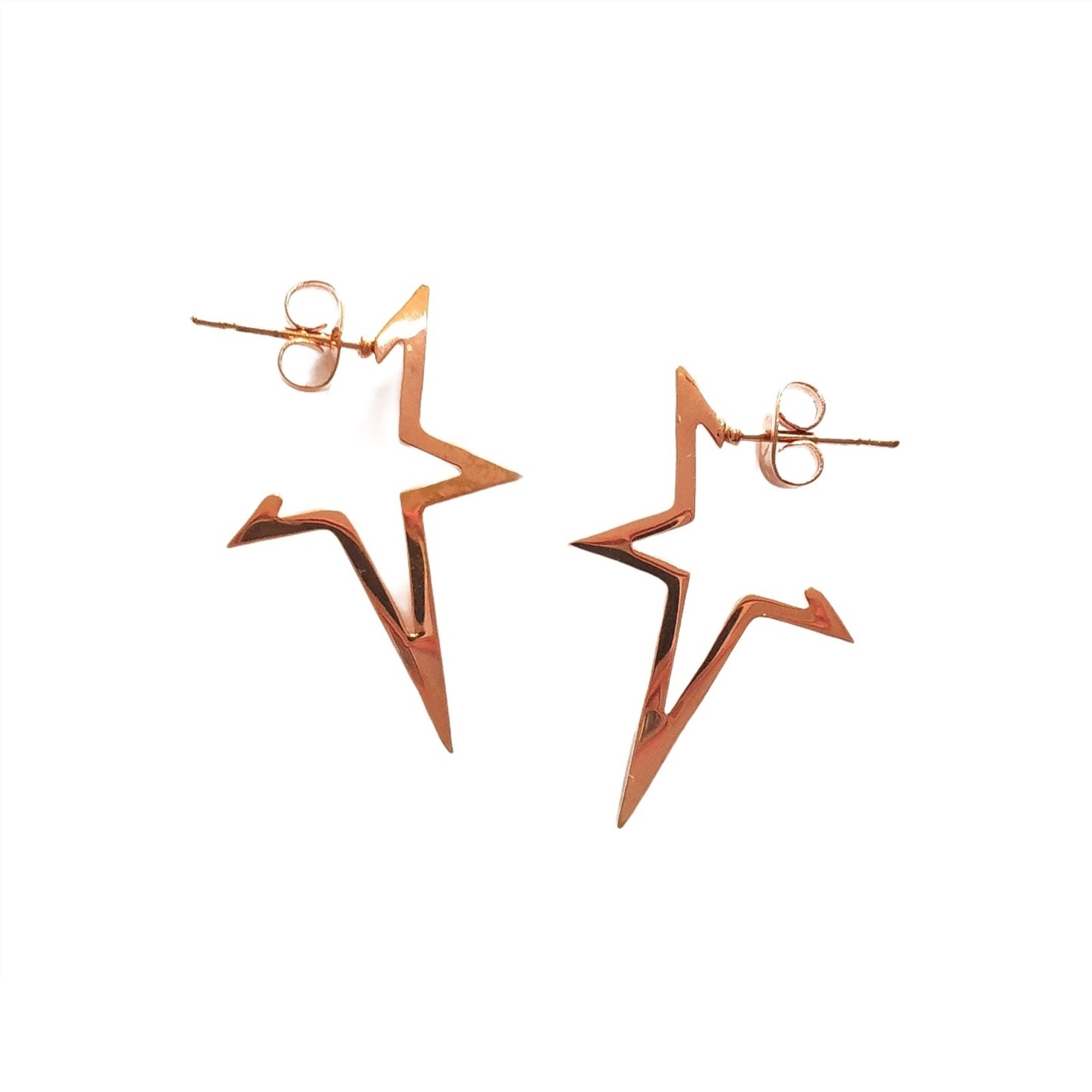 Σκουλαρίκια αστέρια κρίκοι από ανοξείδωτο ατσάλι σε ροζ-χρυσό χρώμα με γυαλιστερό φινίρισμα. Συνοδεύονται και με έξτρα κουμπώματα σιλικόνης.