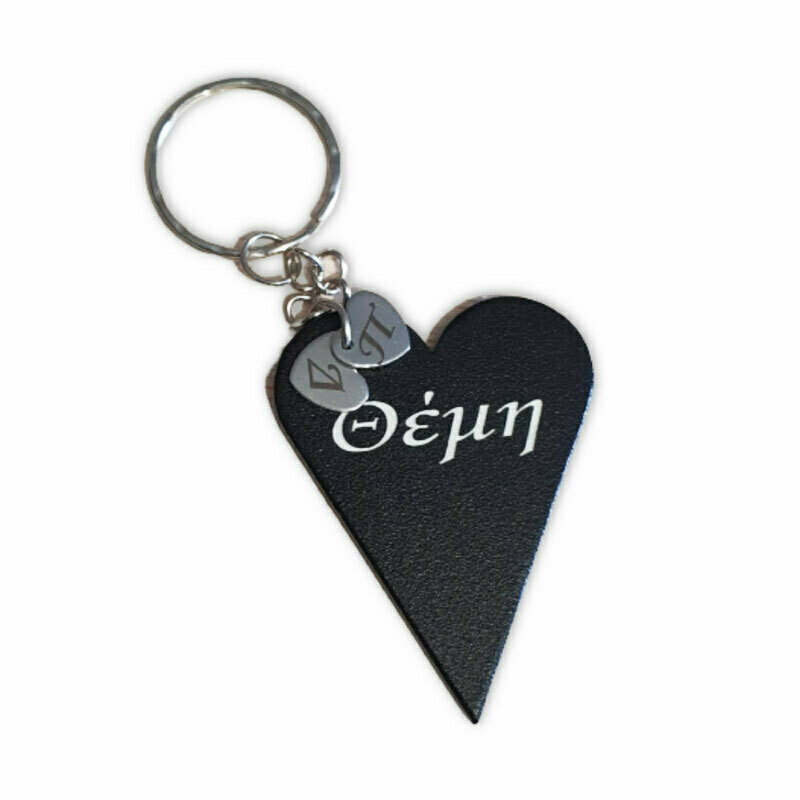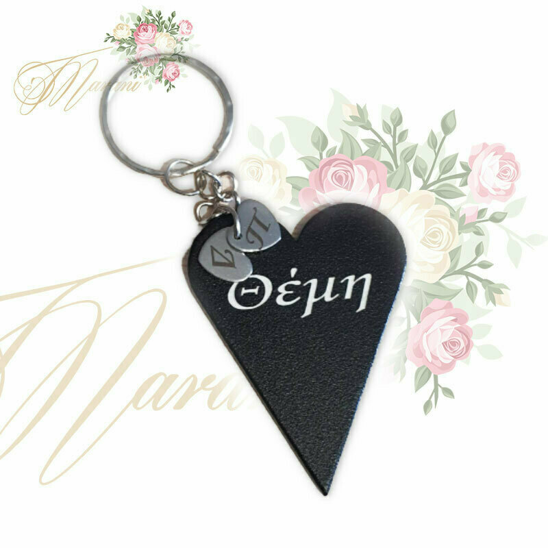 Πολυτελές μεταλλικό μπρελόκ καρδιά σε μαύρο χρώμα με χάραξη το όνομά σας και στις δυο μικρές καρδούλες τα αρχικά των παιδιών σας .