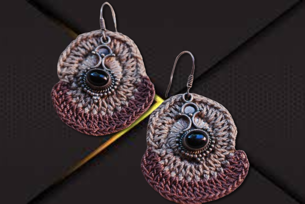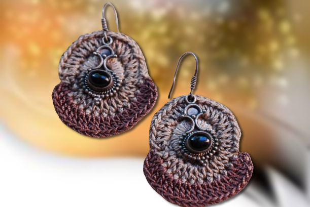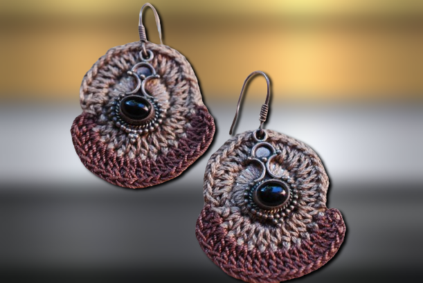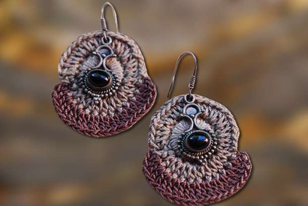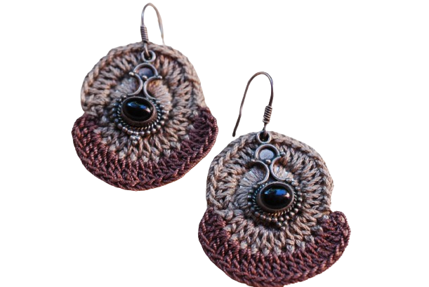 Χειροποίητα γυναικεία σκουλαρίκια, πλεγμένα με το βελονάκι με βαμβακερό νήμα σε γήινες αποχρώσεις, διακοσμημένα με vintage μεταλλικά στοιχεία. Ένα πολύ μοντέρνο αξεσουάρ για όλες τις ώρες. Συνδυάζεται σχεδόν με όλα τα στυλ ντυσίματος.