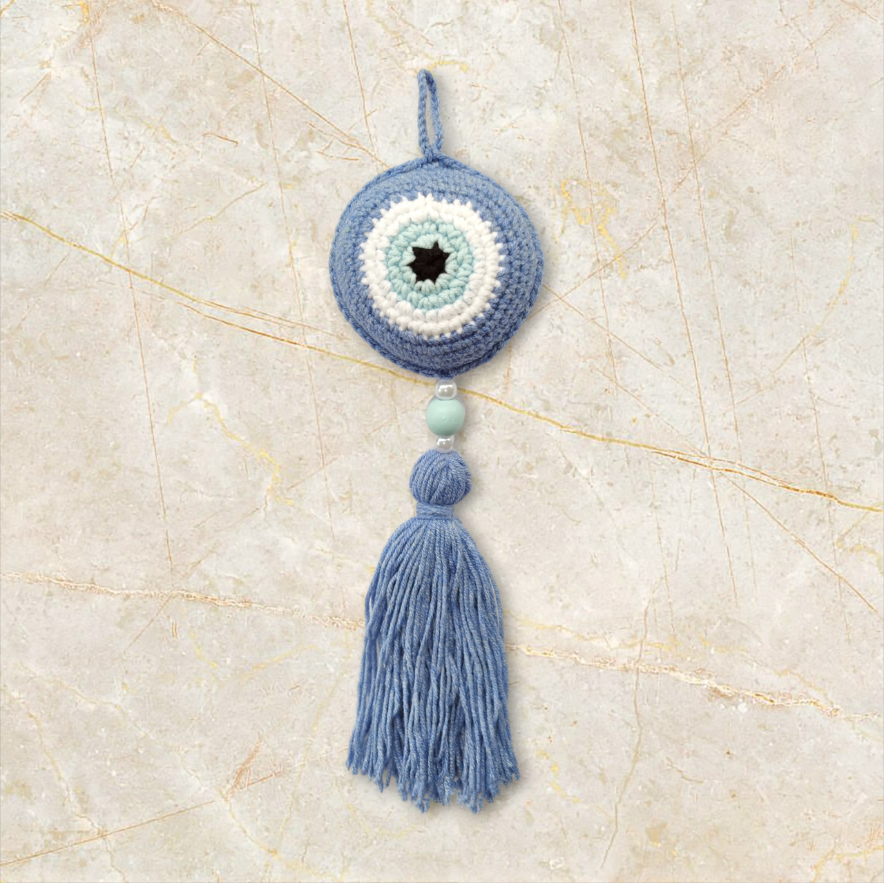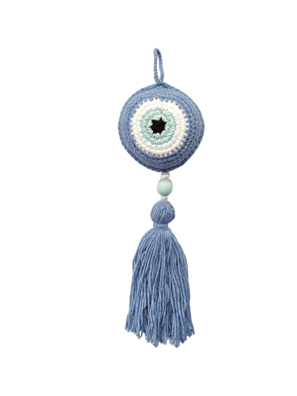 Χειροποίητο πλεκτό ματάκι σε μπλε τζιν με φούντα, και ξύλινη χάντρα και πέρλες. Το ιδανικό δώρο για νεογέννητο.