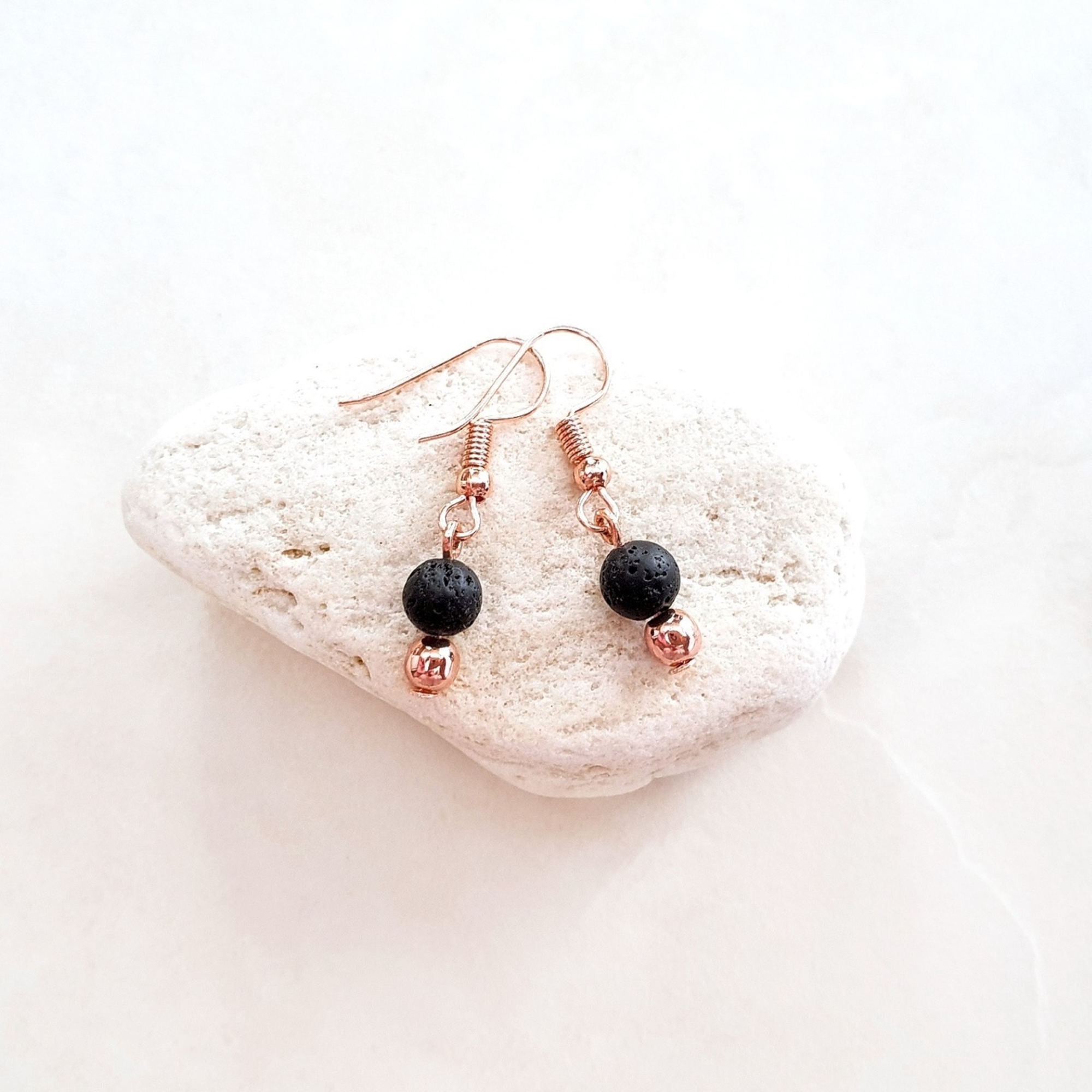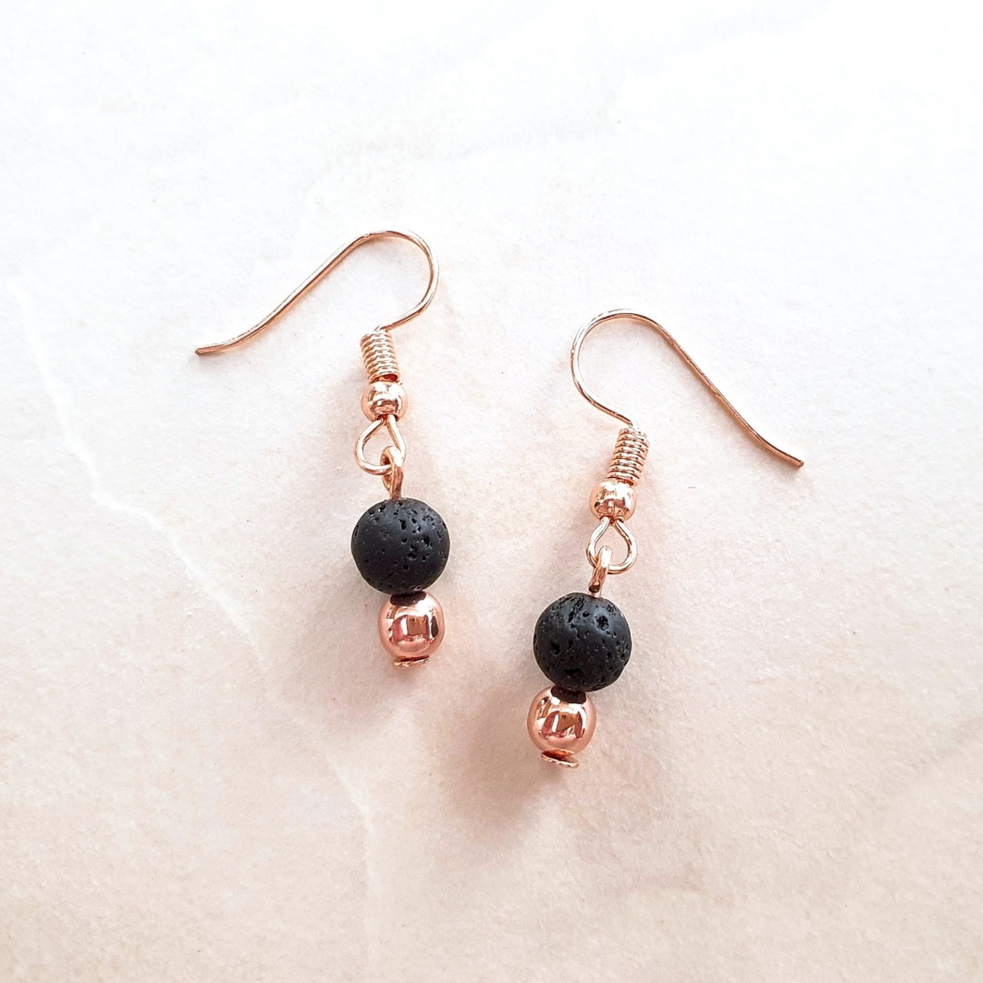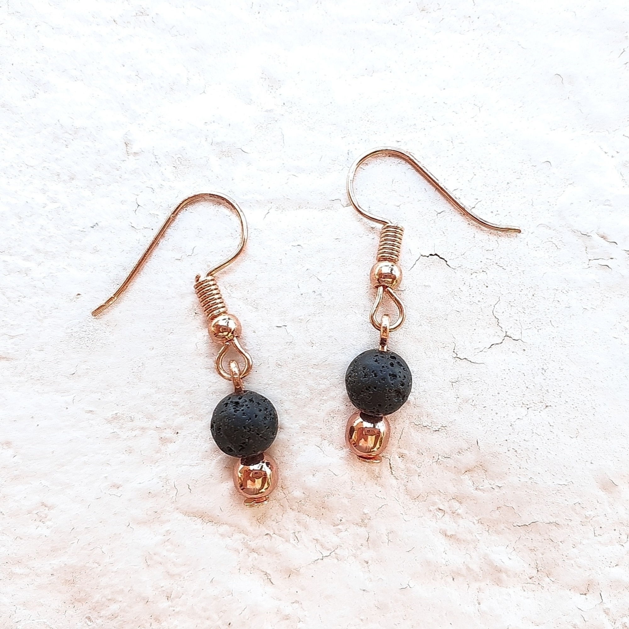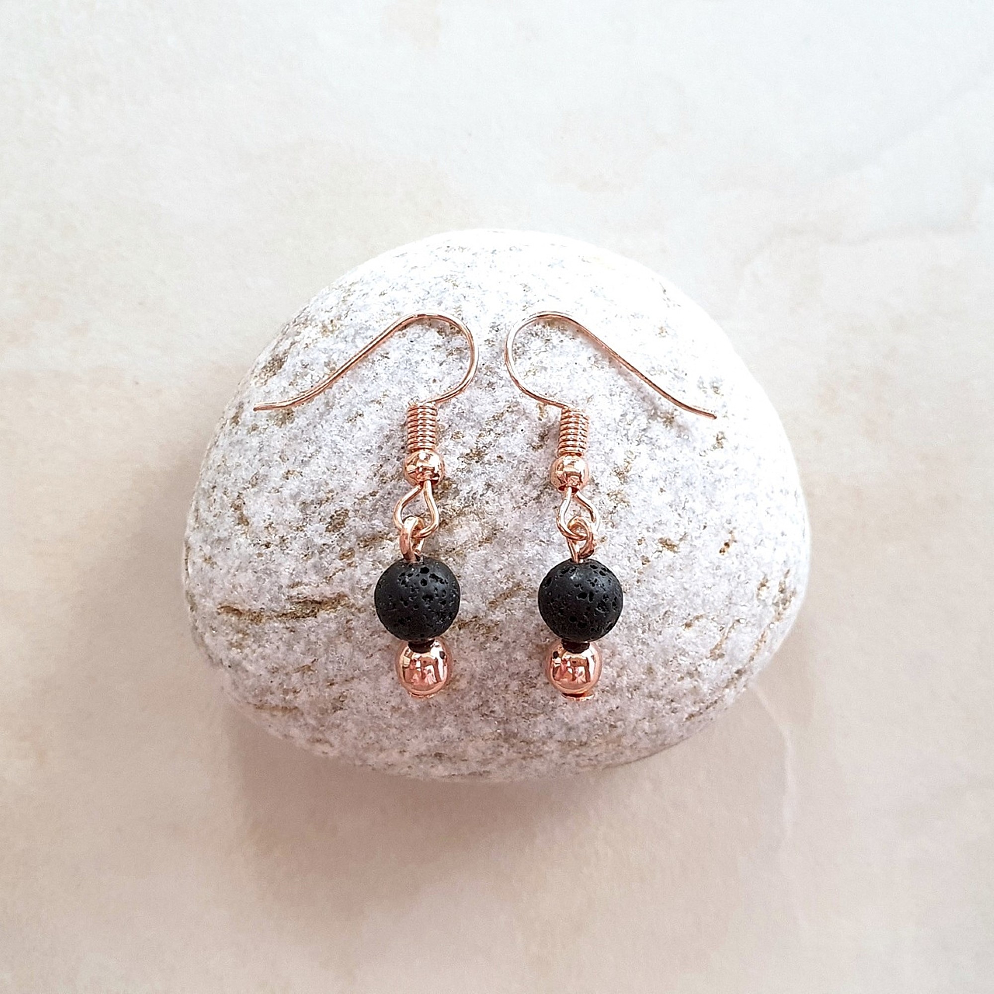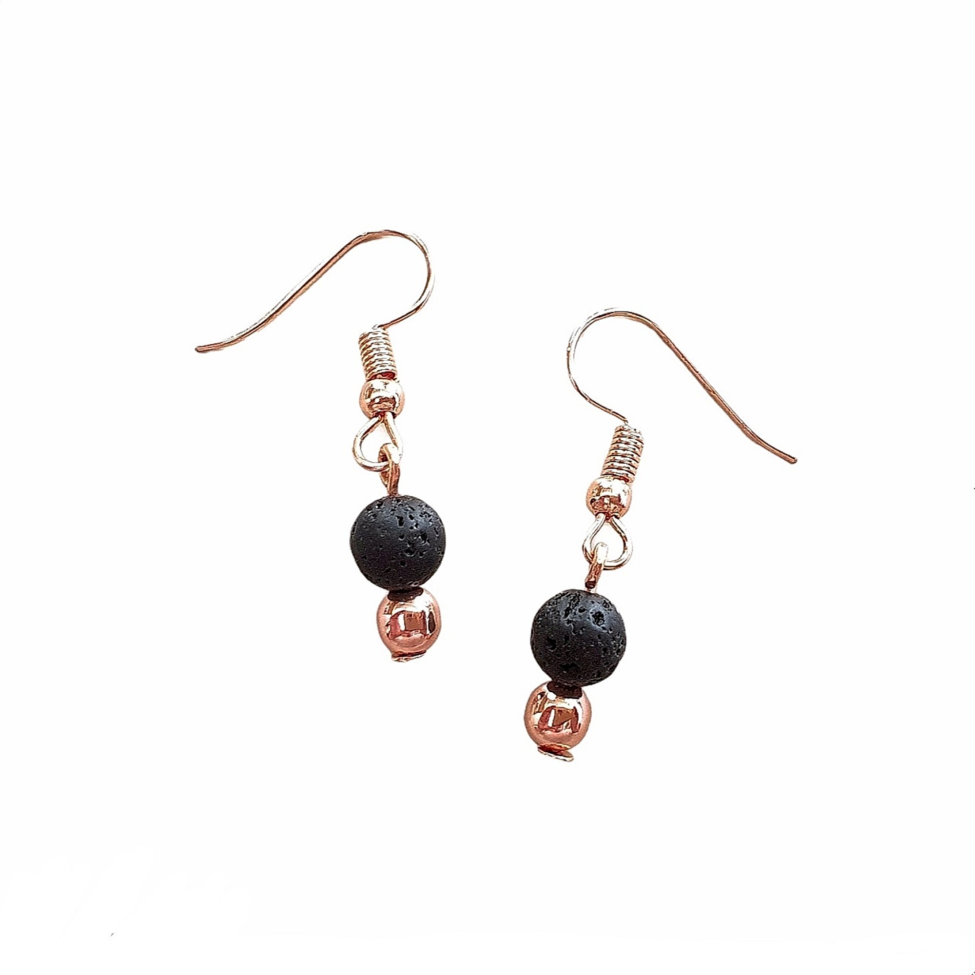 Μοναδικά σκουλαρίκια κρεμαστά χειροποίητα με πέτρες λάβα και αιματίτες σε ροζ χρυσό χρώμα.