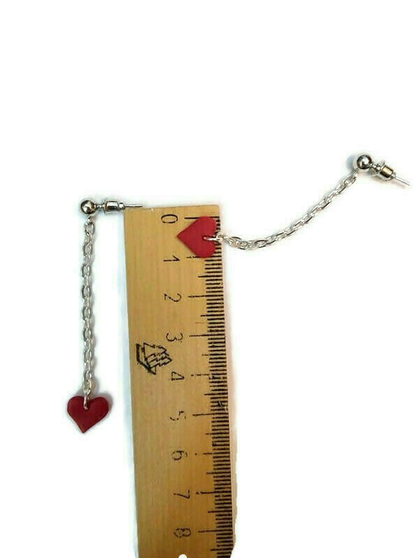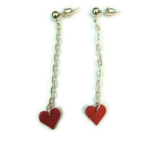Χειροποίητα,καρφωτά σκουλαρίκια με αλυσίδα και καρδιά στο τελείωμα. Σκουλαρίκια από πολυμερικό πηλό. Οι καρδιές είναι σε κόκκινο χρώμα. Ο πολυμερικός πηλός είναι μη – τοξικός. Δεν θα πρέπει να χρησιμοποιείτε αρώματα ή άλλα καλλυντικά, που μπορεί να οδηγήσουν σε μόνιμη φθορά του κοσμήματος. Συνιστάται να φυλάσσονται τα κοσμήματα με πολυμερικό πηλό στο δικό τους κουτί. Ένα τόσο μοναδικό κόσμημα που σίγουρα θα εντυπωσιάσει! Ένα πολύ ιδιαίτερο δωράκι με μοναδικό σχέδιο!