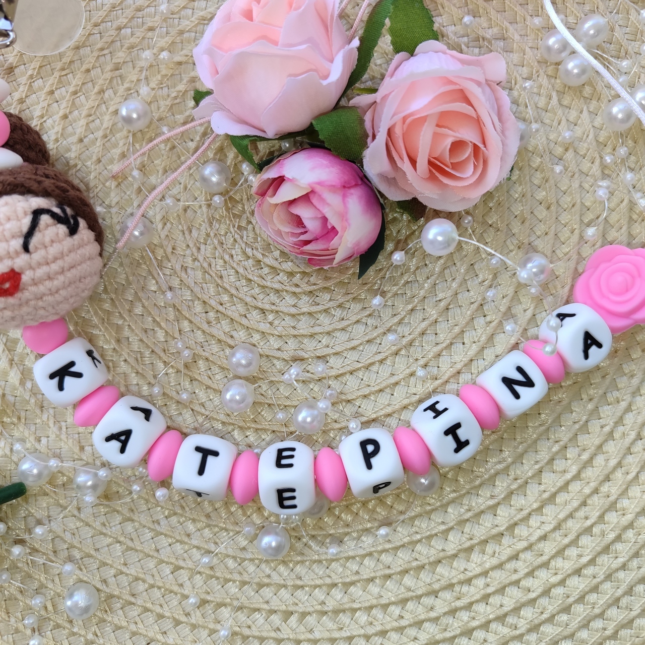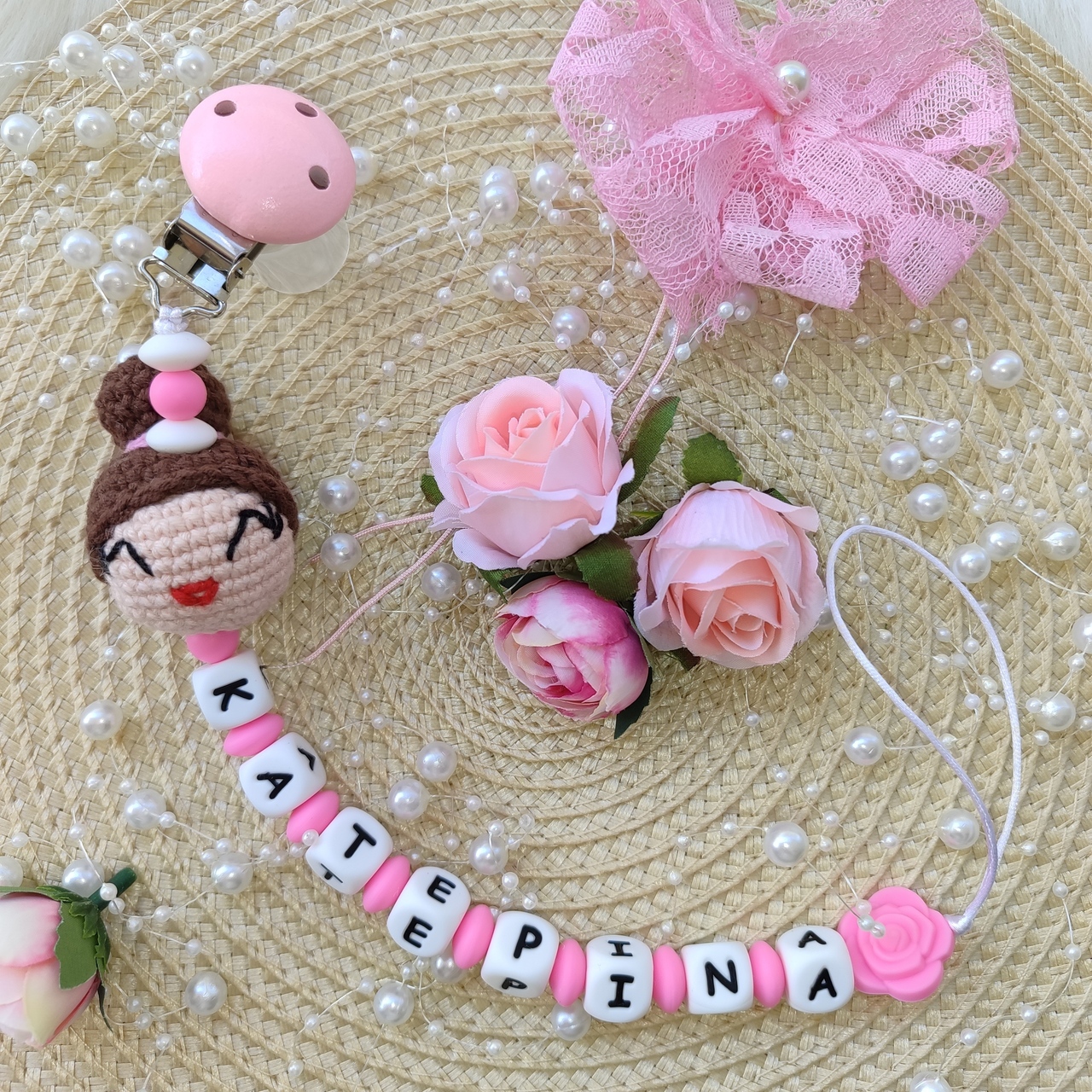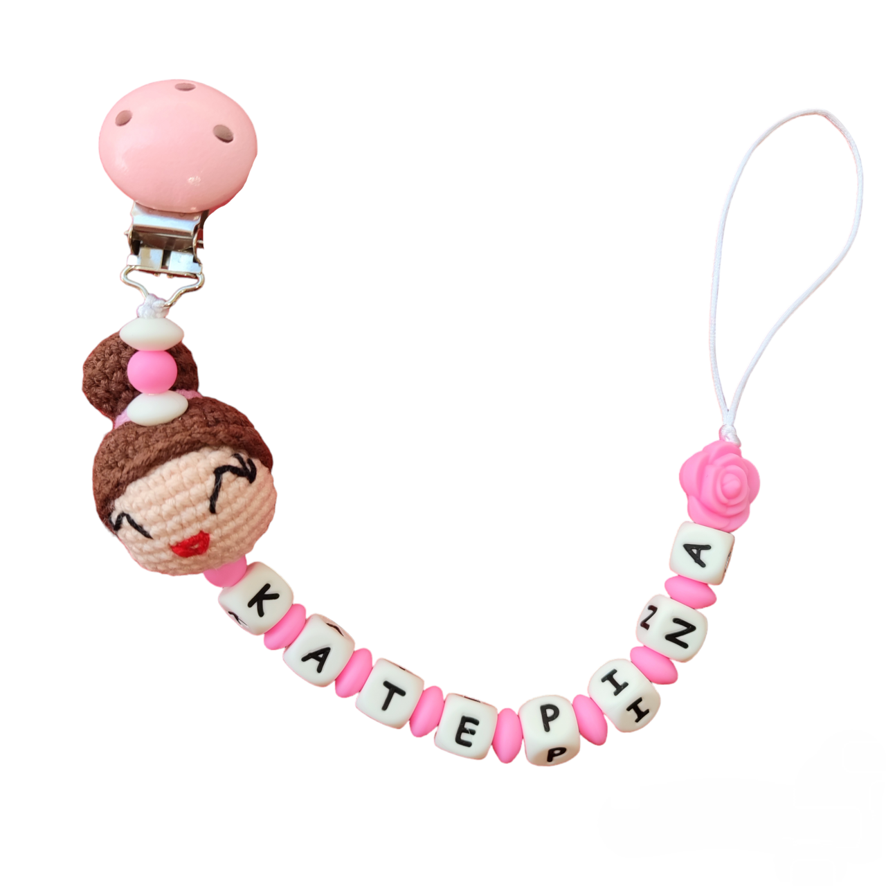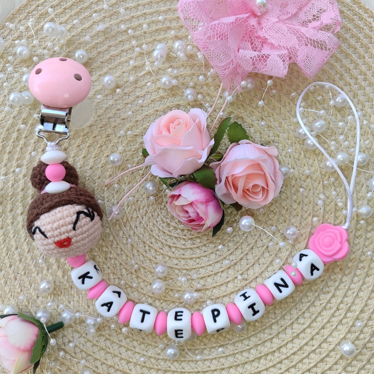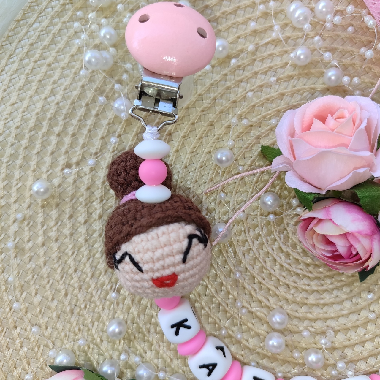 Χειροποίητο πλεκτό κλιπ πιπίλας με ξύλινο ροζ κλιπ και πλεκτό κεφαλάκι μπαλαρίνας με εντονο ροζ πλεκτή κορδελιτσα, μασητικες χάντρες σιλικόνης με το όνομα του μωρού και άλλες σε έντονο ροζ, λευκές και τριαντάφυλλο.