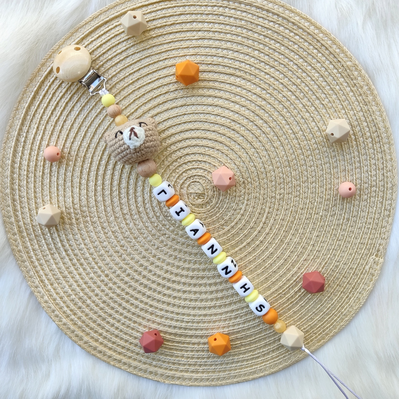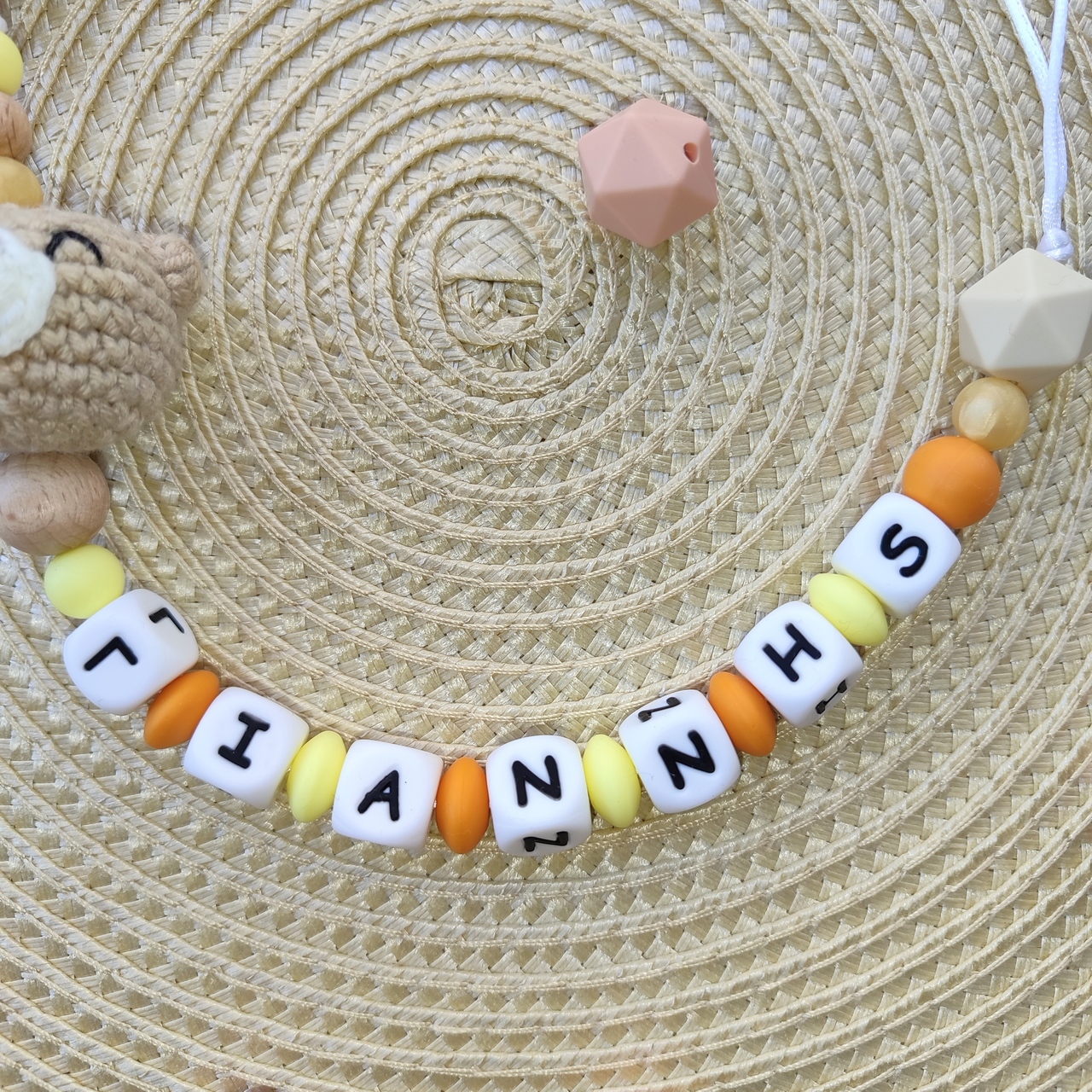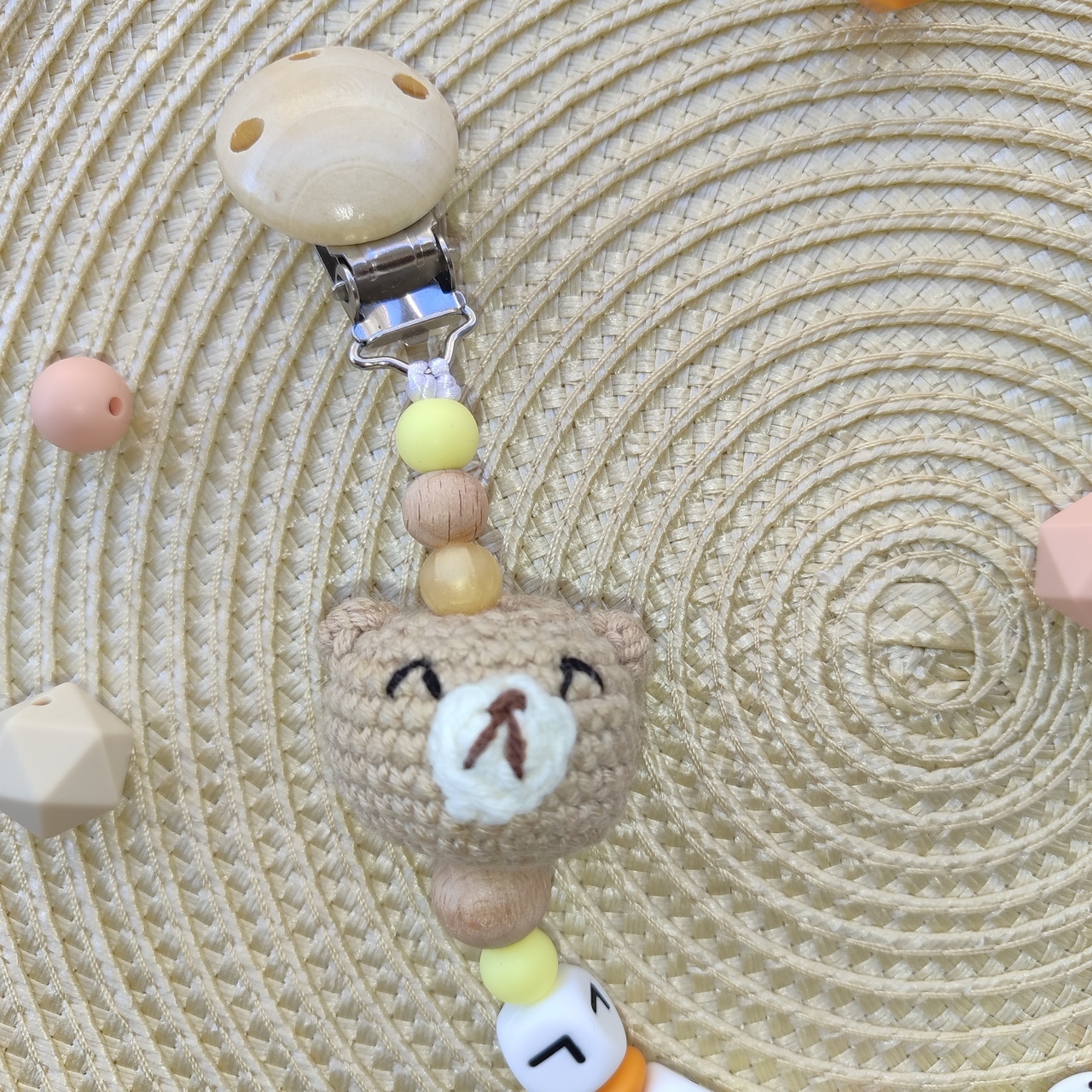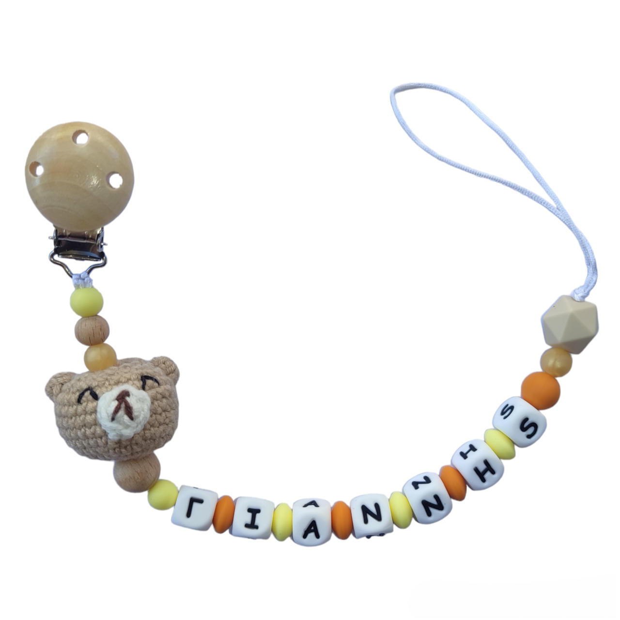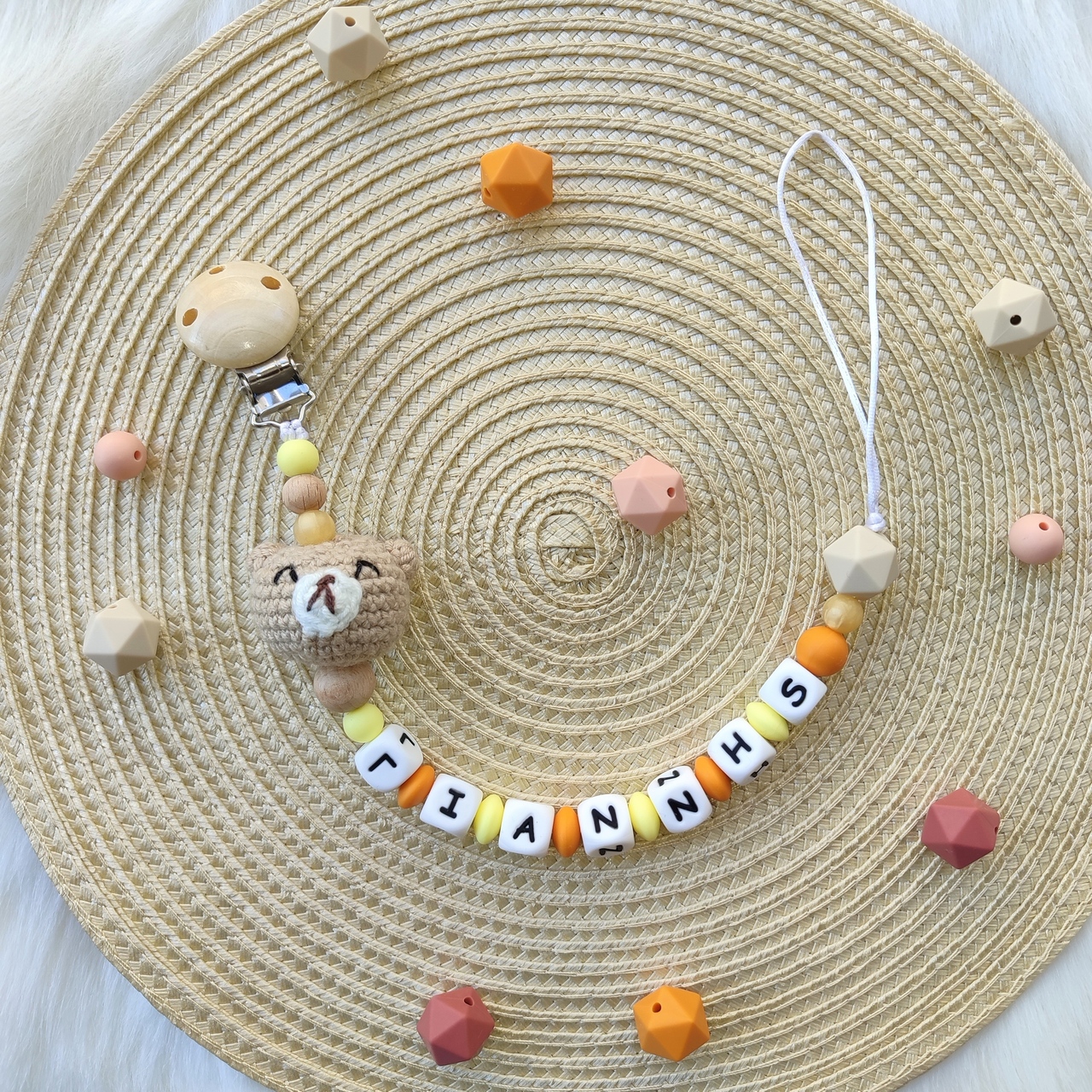 Χειροποίητο πλεκτό κλιπ πιπίλας με ξύλινο κλιπ, ανοιχτό καφέ αρκουδάκι και μασητικές χάντρες σιλικόνης που σχηματίζουν το όνομα του μωρού, και σε κίτρινο, πορτοκαλί, ιβουάρ και ξύλινες.
