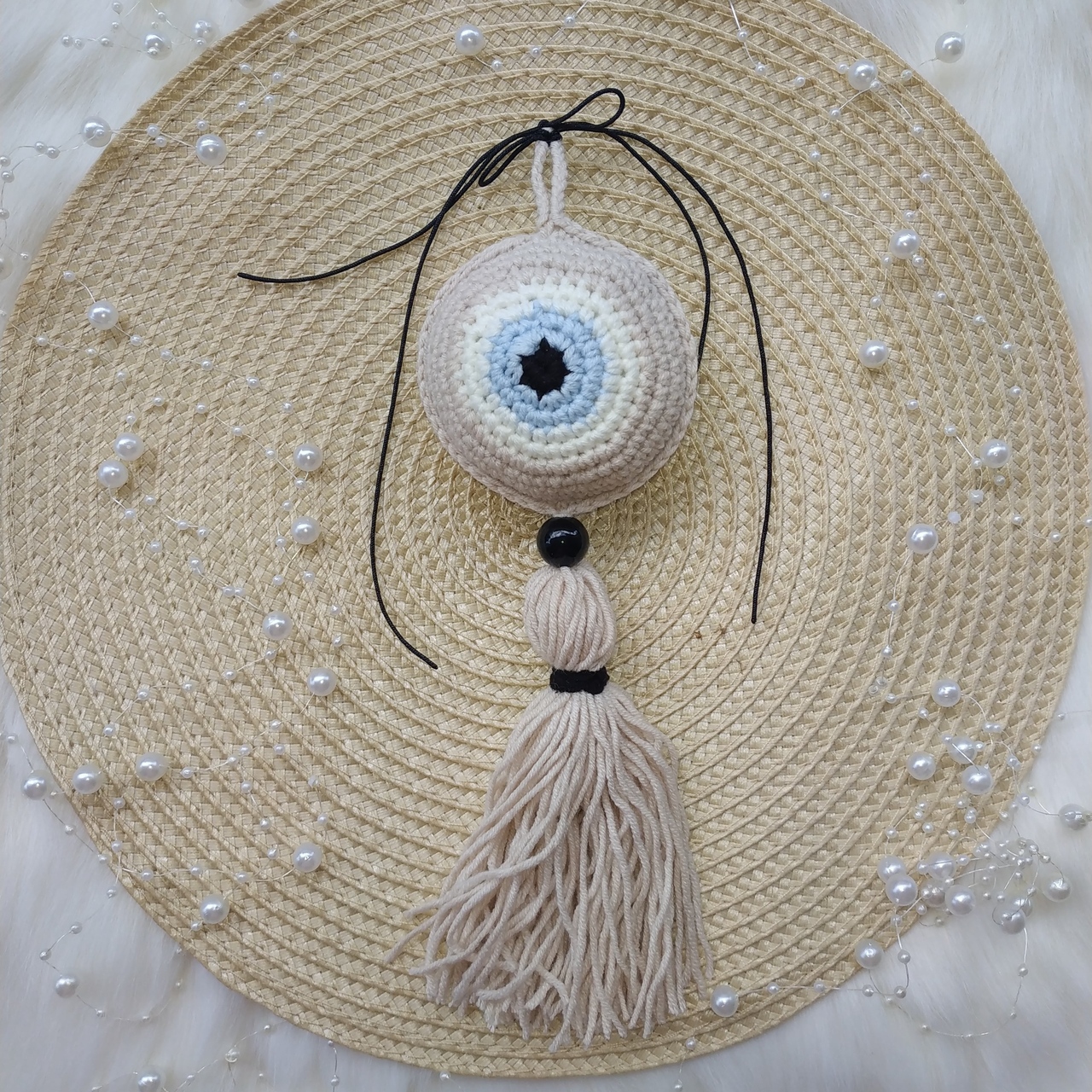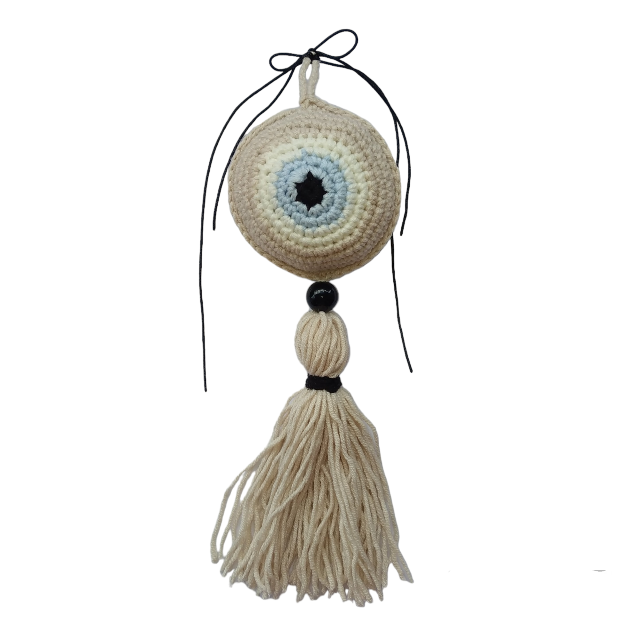 Χειροποίητο πλεκτό ματάκι σε ιβουάρ χρώμα, μαύρη χάντρα και μεγάλη φούντα με δέσιμο από μαύρη κλωστή.