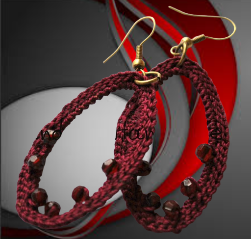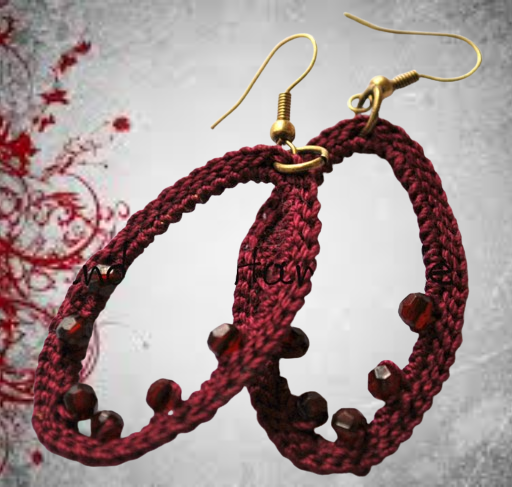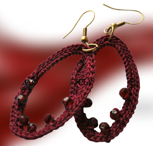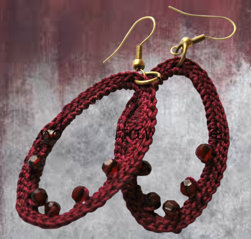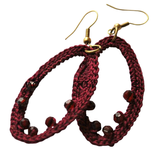 Χειροποίητα πλεκτά σκουλαρίκια, πλεγμένα με το βελονάκι, βαμβακερό νήμα σε μονό κρίκο σε οβάλ σχήμα. Εύκολο αξεσουάρ που ταιριάζει σχεδόν με όλα τα ντυσίματα. Διακοσμημένο με πέρλες σε μπορντό χρώμα.