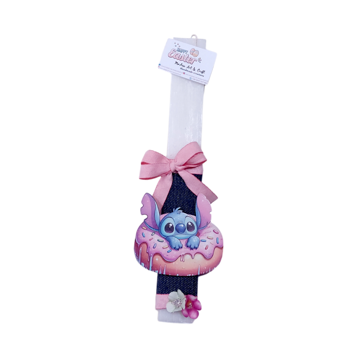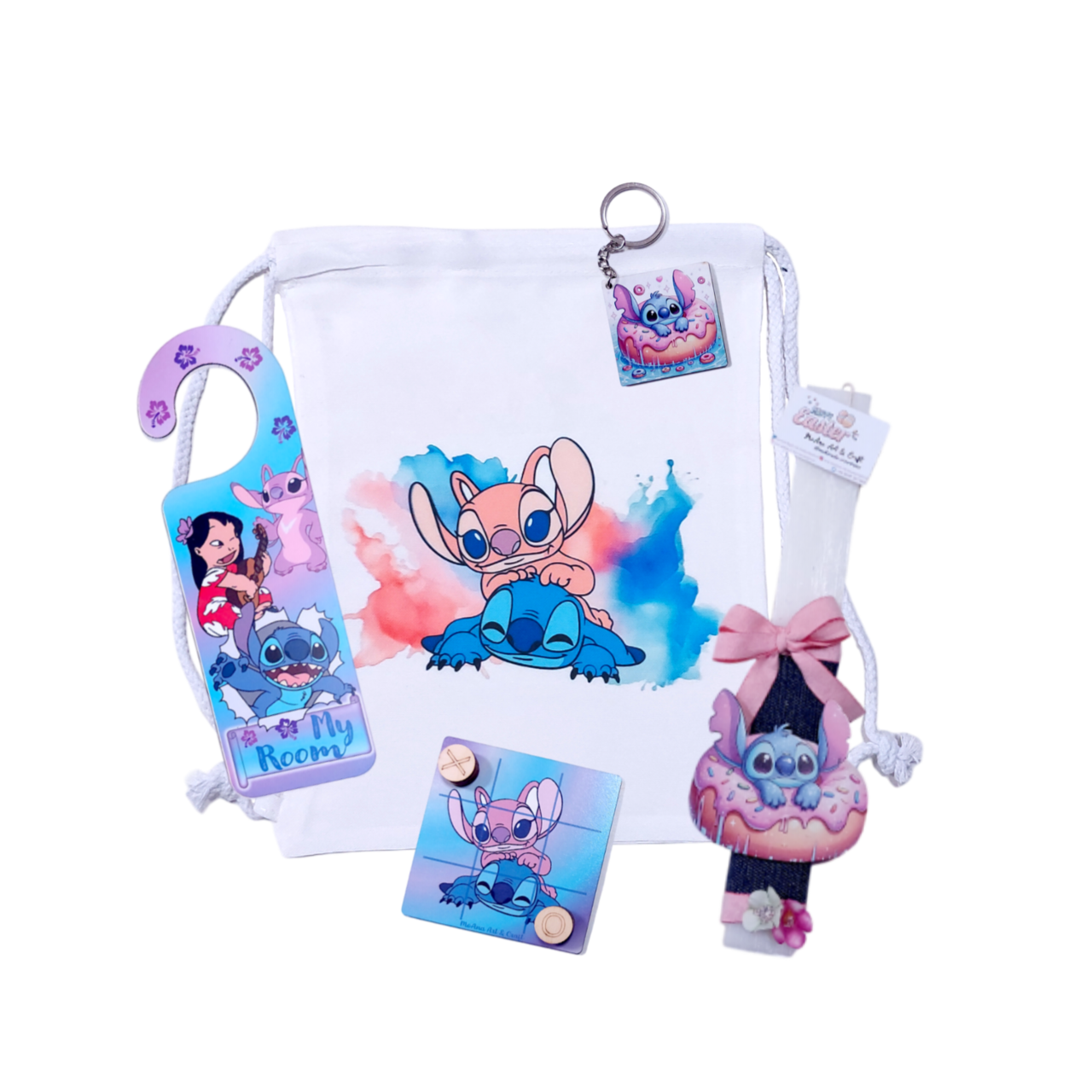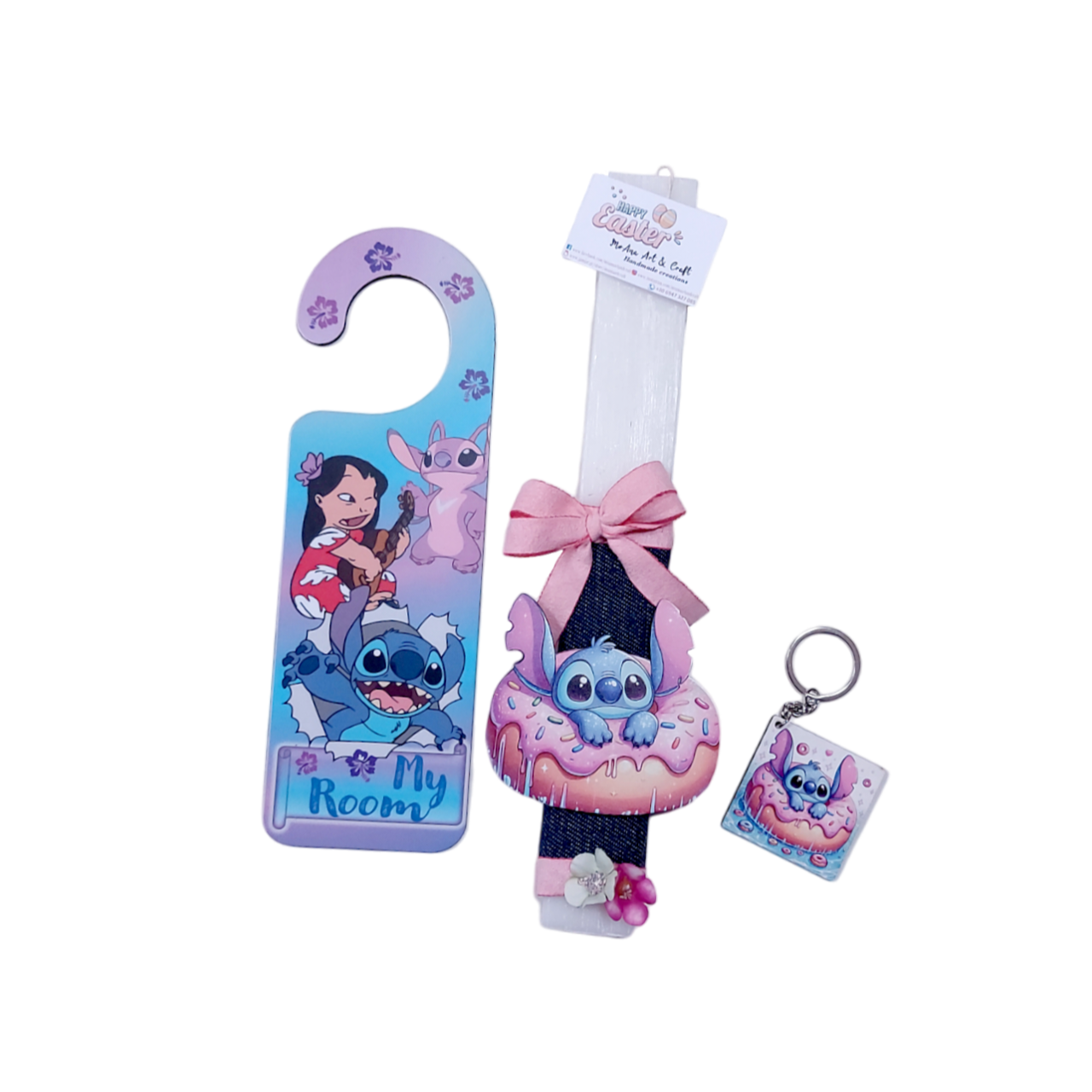 Λαμπάδα 30εκ. με ξύλινη διακοσμητική φιγούρα stitch 9εκ, προσωποποιημένο σακίδιο πλάτης 30×25εκ, κρεμάστρα 25×8 εκ. για την πόρτα του δωματίου, μπρελόκ 6εκ και τρίλιζα 10εκ.