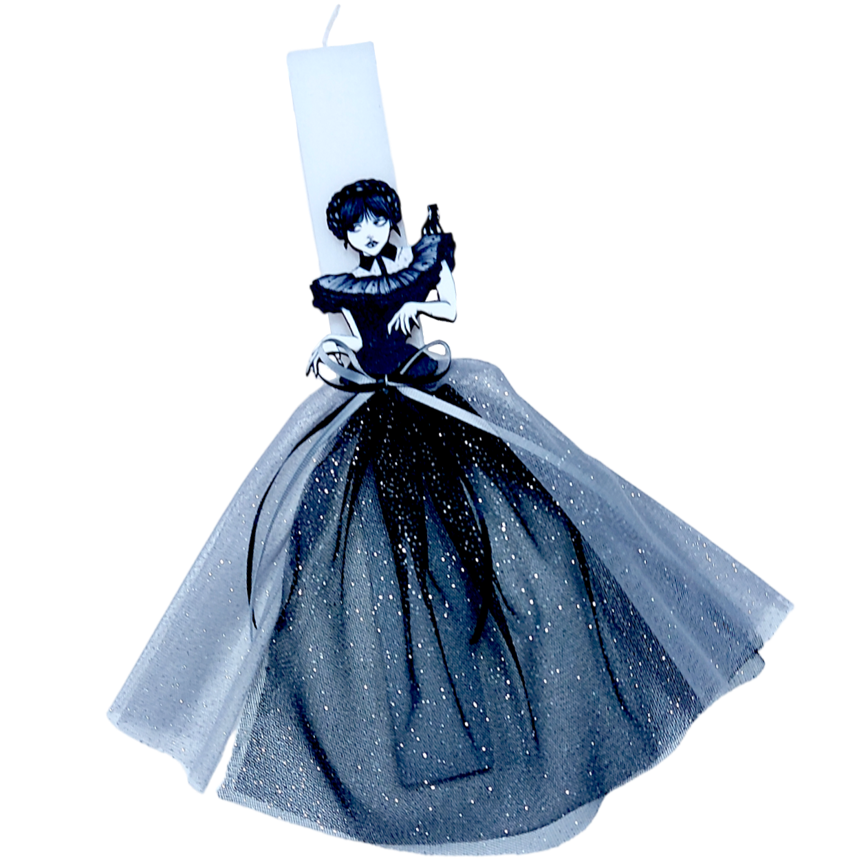Λαμπάδα 30εκ. με ξύλινη διακοσμητική φιγούρα 9εκ με τούλινη γκλιτεράτη φούστα (μαύρο και γκρι).
