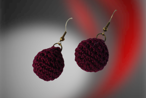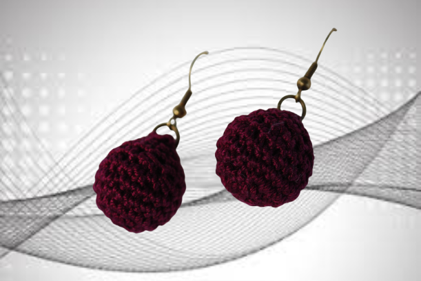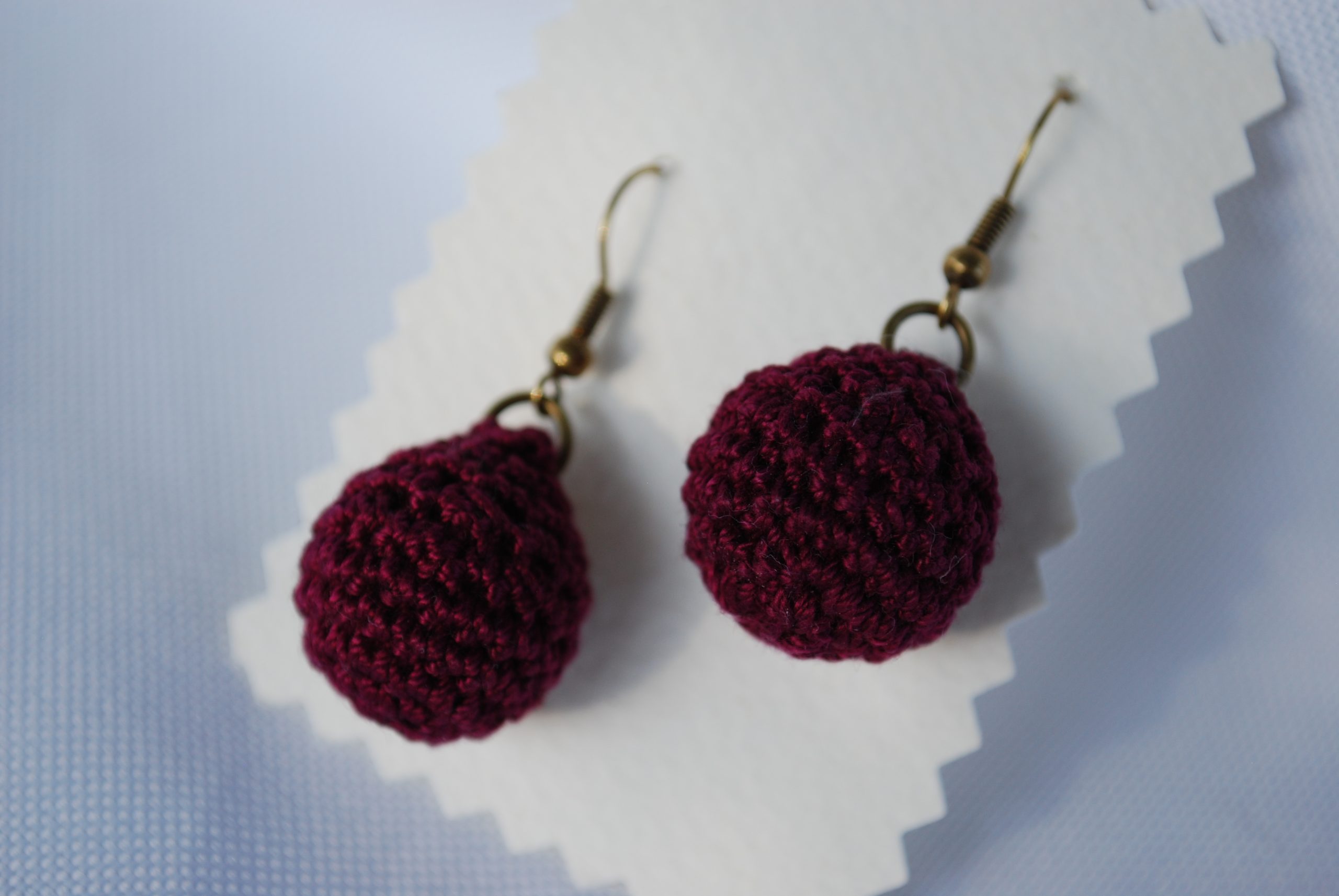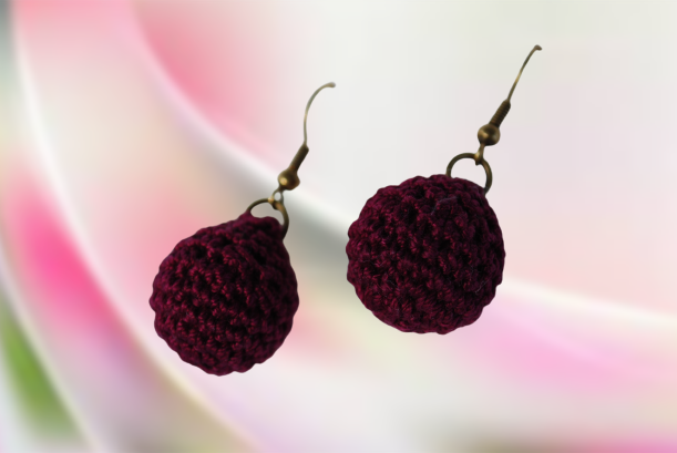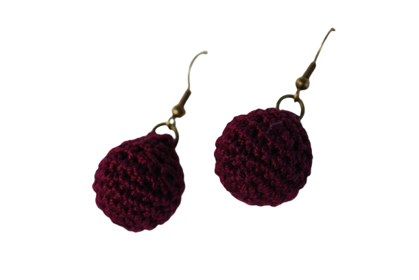 Χειροποίητα πλεκτά σκουλαρίκια, πλεγμένα με το βελονάκι σε στρογγυλό σχήμα. Σε μπορντό χρώμα και βαμβακερό νήμα. Ιδιαίτερο αξεσουάρ που φοριέται εύκολα και ταιριάζει σε όλους.