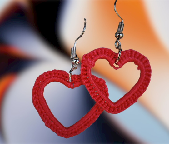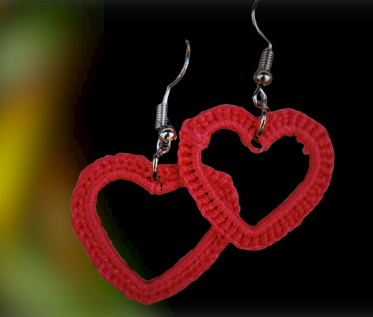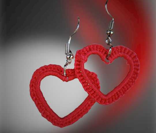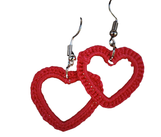Χειροποίητα πλεκτά σκουλαρίκια σε μονό κρίκο σε σχήμα καρδιάς, πλεγμένα με το βελονάκι και βαμβακερό νήμα σε κόκκινο χρώμα. Φοριούνται όλες τις ώρες της ημέρας και μπορούν να συνδυαστούν εύκολα με οποιοδήποτε στυλ ντυσίματος. Ταιριάζουν και σε νεαρότερες ηλικίες.