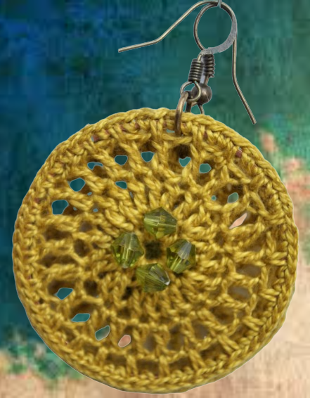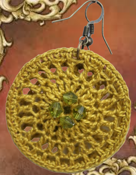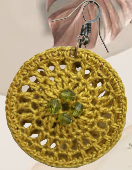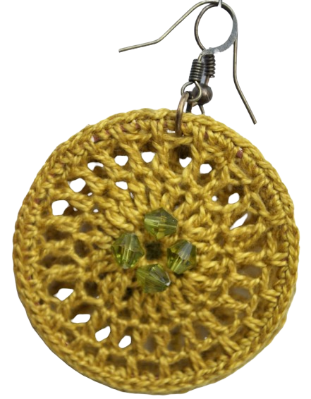 Γυναικεία σκουλαρίκια, χειροποίητα, πλεγμένα με το βελονάκι και βαμβακερό νήμα στο χρώμα της ώχρας. Ένα όμορφο σχέδιο, γεμάτο με μεγάλο κρίκο για τρυπημένα αυτιά. Διακοσμημένο με ταιριαστές διάφανες χάντρες.