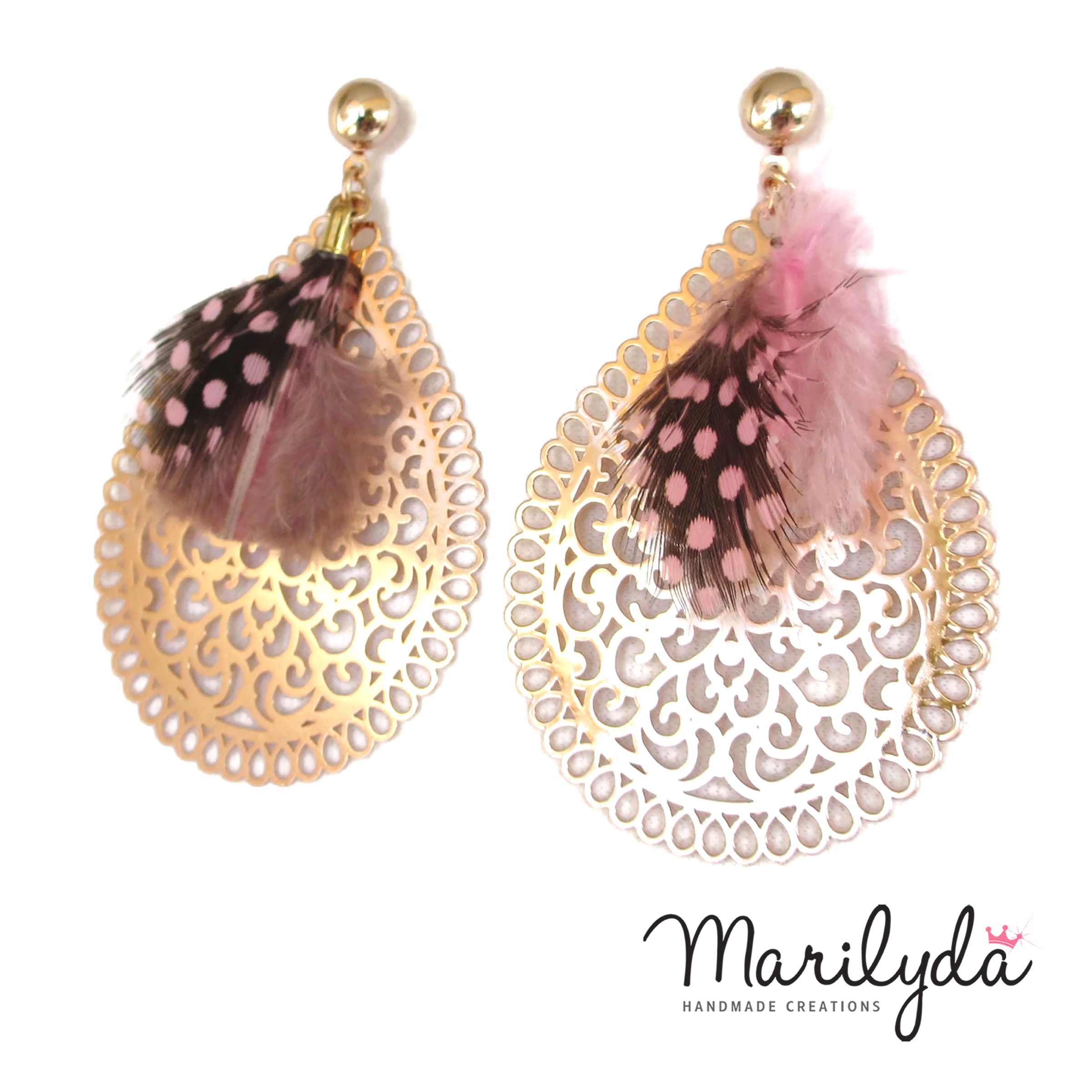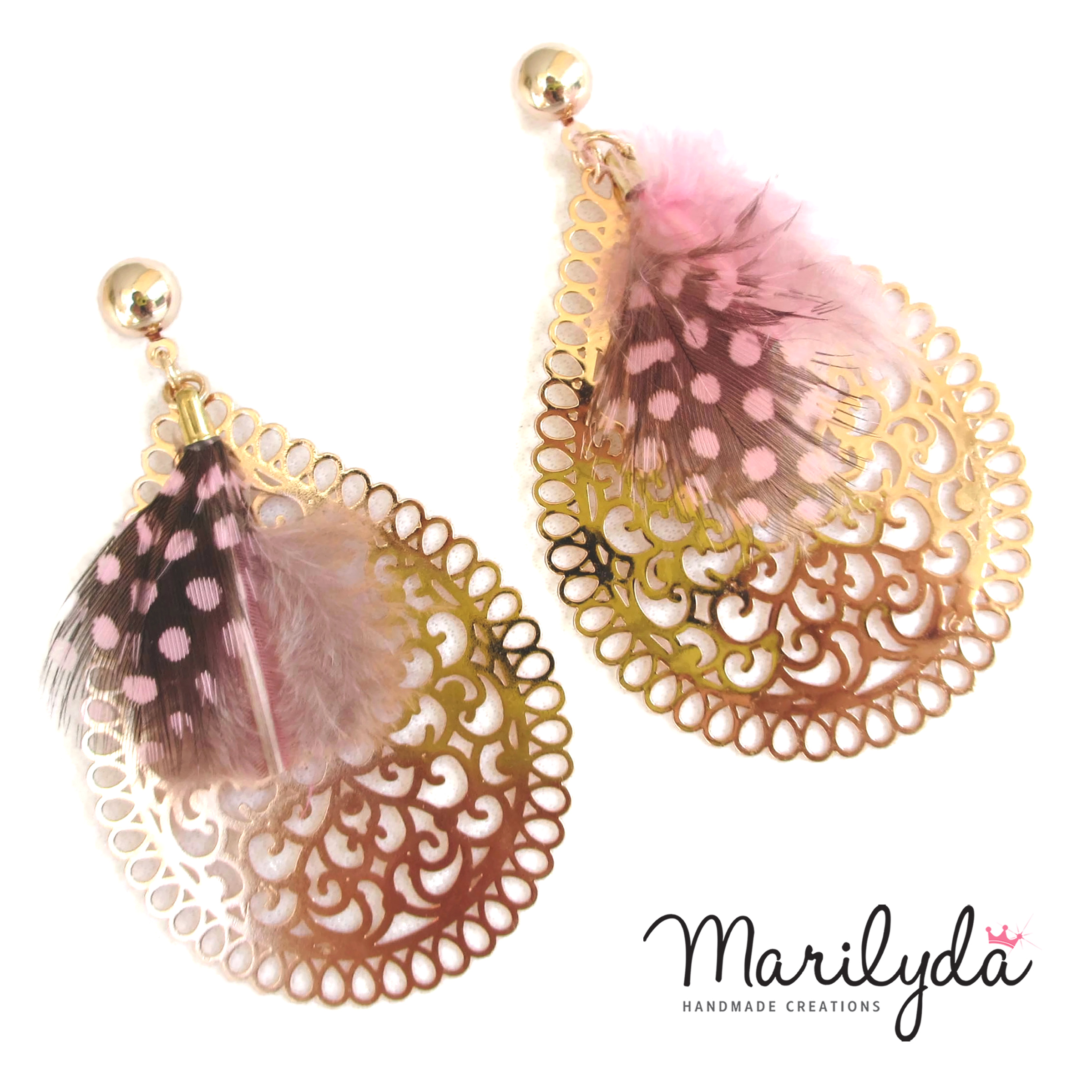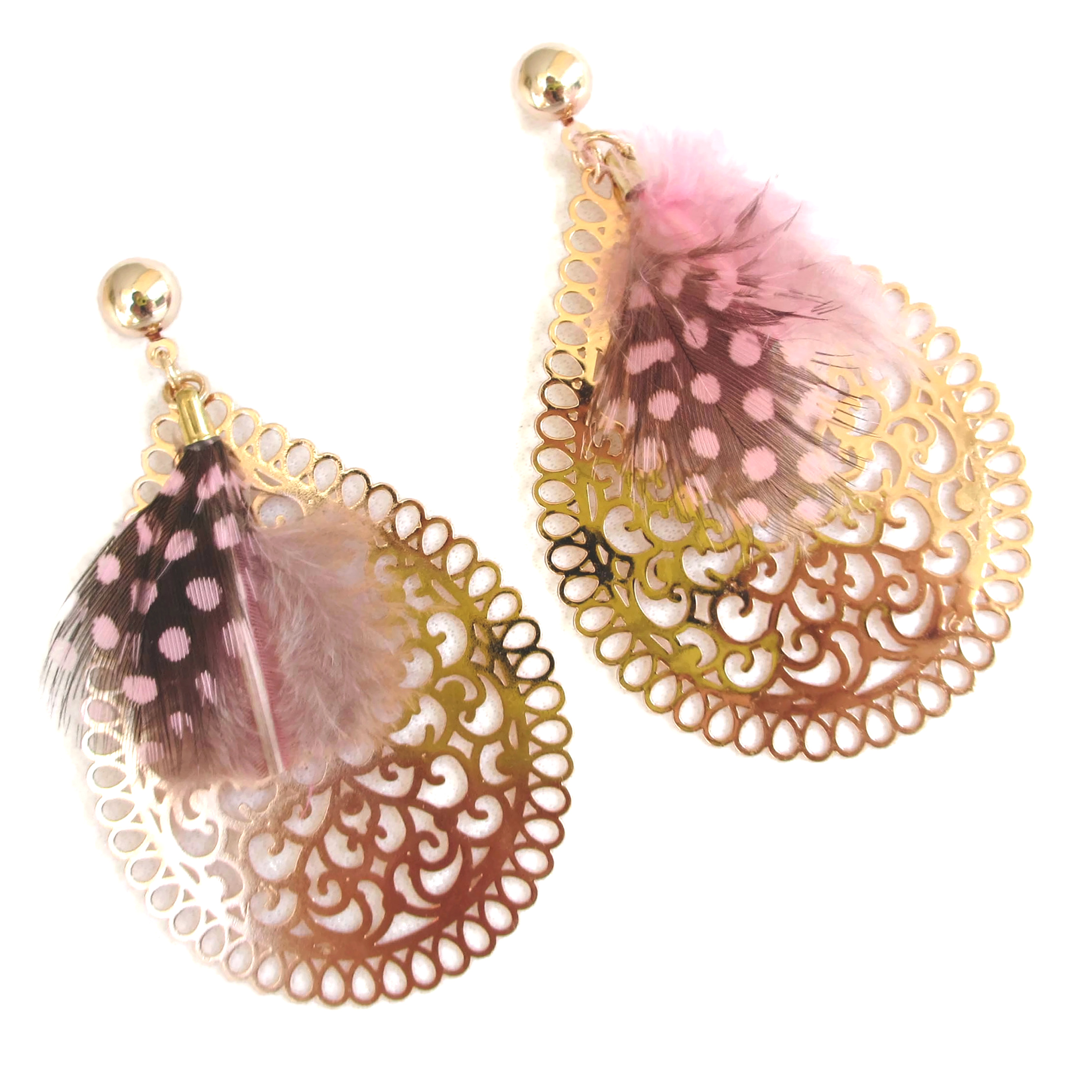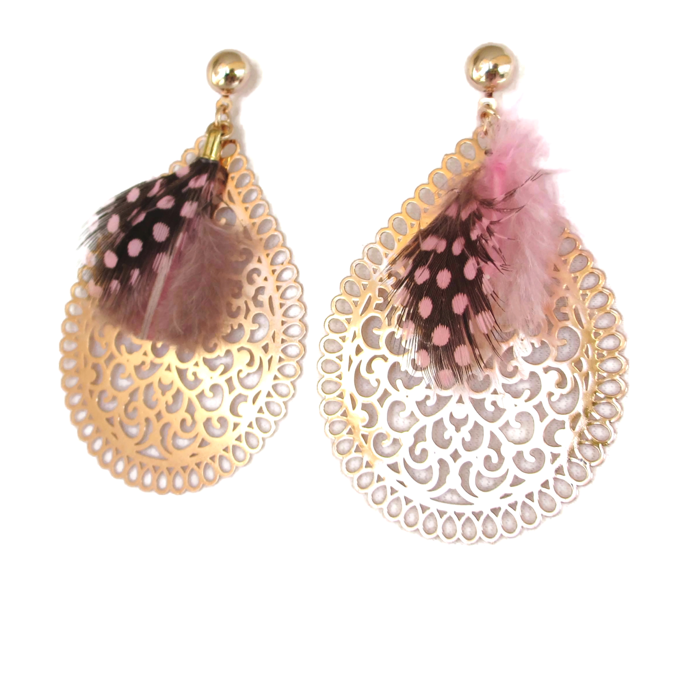 Σκουλαρίκια από ορειχάλκινο μέταλλο επιχρυσωμένο rose gold, με κοπή laser σαν δαντέλα και φτερό πετεινού σε εκπληκτικές ροζ αποχρώσεις!
