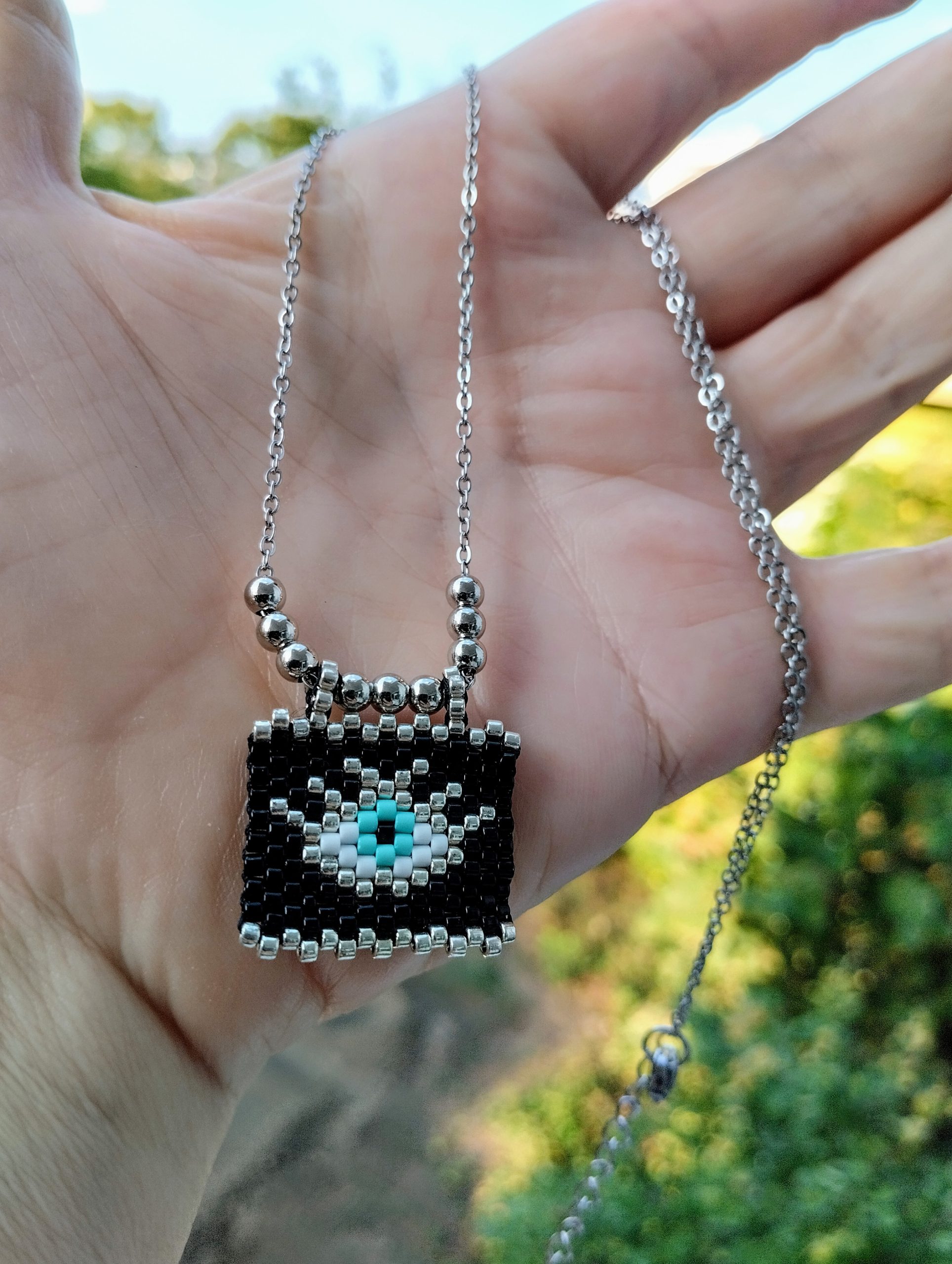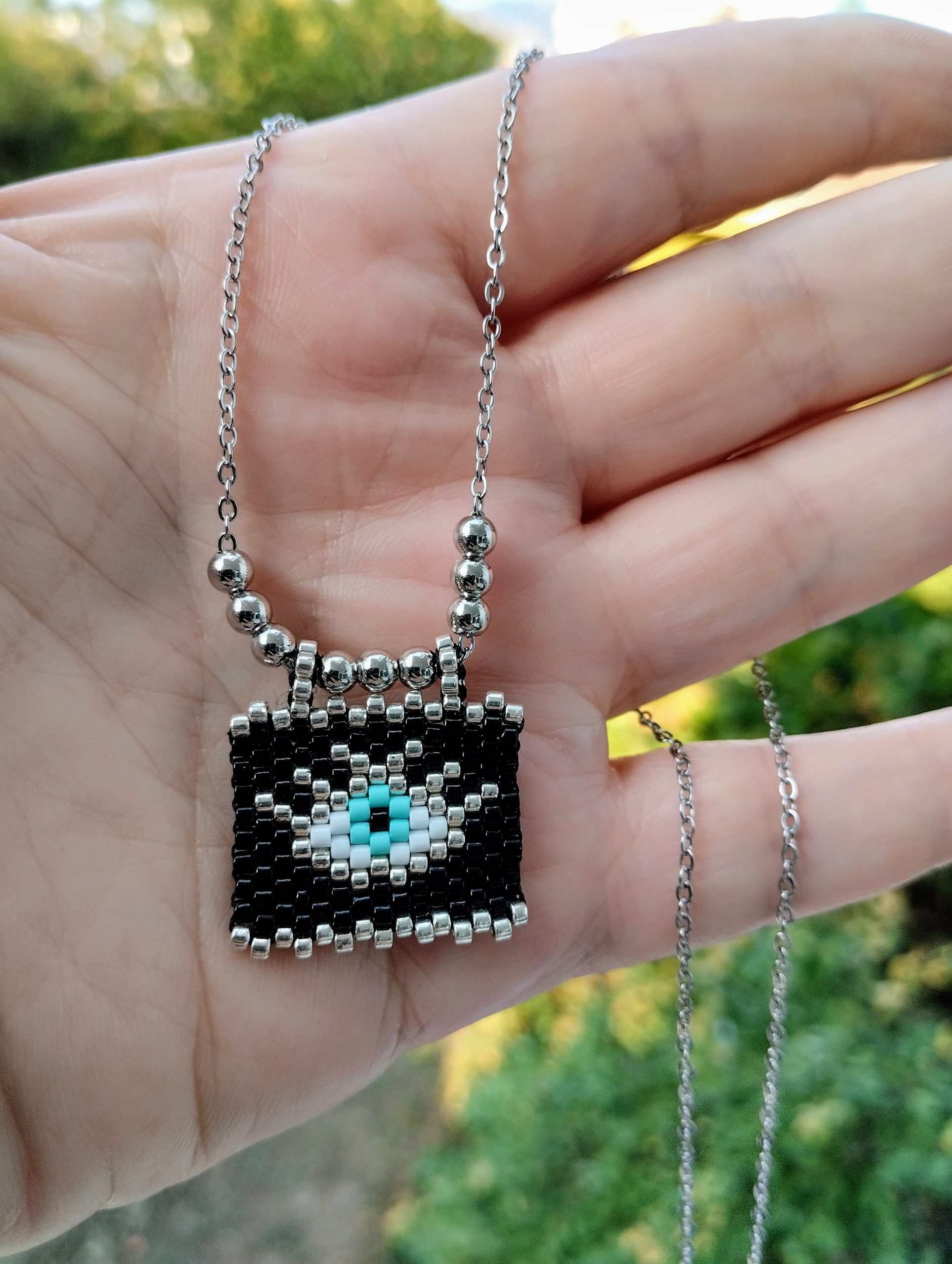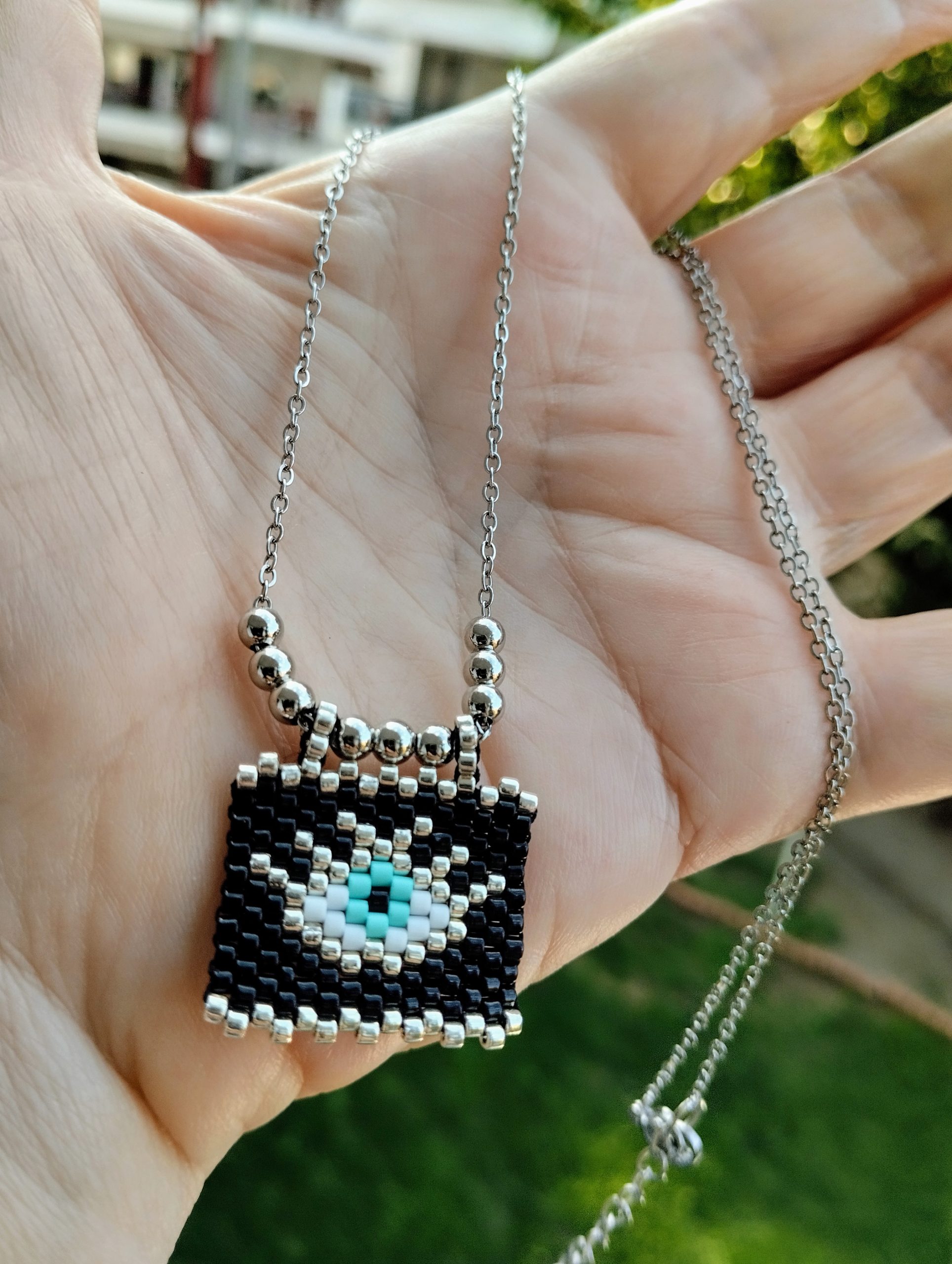 Είναι ένα υπέροχο ατσάλινο κολιέ μενταγιόν με ματάκι που είναι μέσα σε πλαίσιο…με χάντρες miyuki delica υψηλής ποιότητας στα χρώματα του μαύρου και του ασημί. Οι διαστάσεις του μενταγιόν είναι 2×2,5 εκ. Η αλυσίδα του είναι ατσάλινη. Διαθέτει κούμπωμα αυξομείωσης. Το μήκος της αλυσίδας είναι 40 +5 εκ η προέκταση της. Υπάρχει δυνατότητα να γίνει και σε χρυσό. Στα σχόλια της παραγγελίας σας σημειώστε το χρώμα που επιθυμείτε.