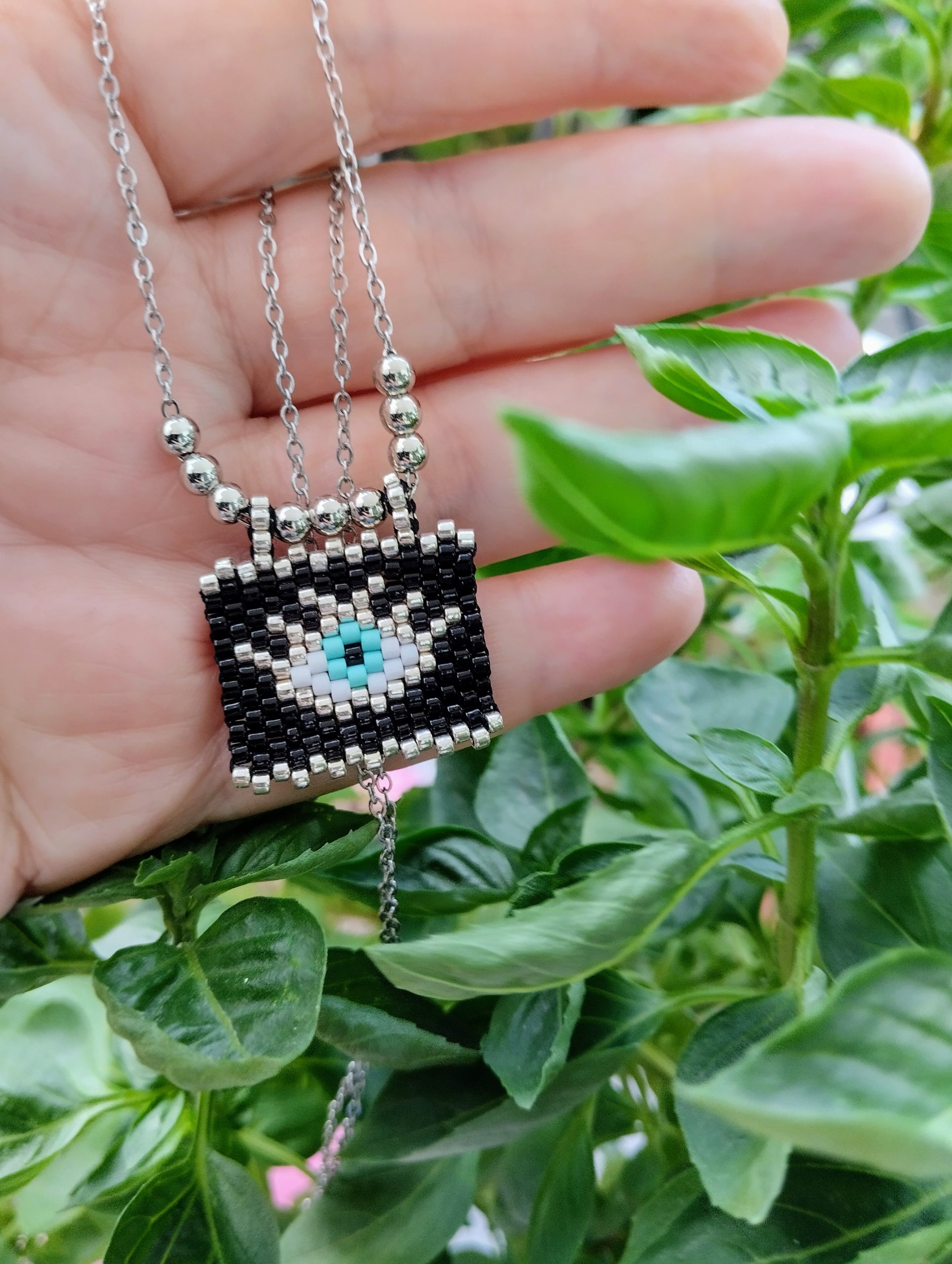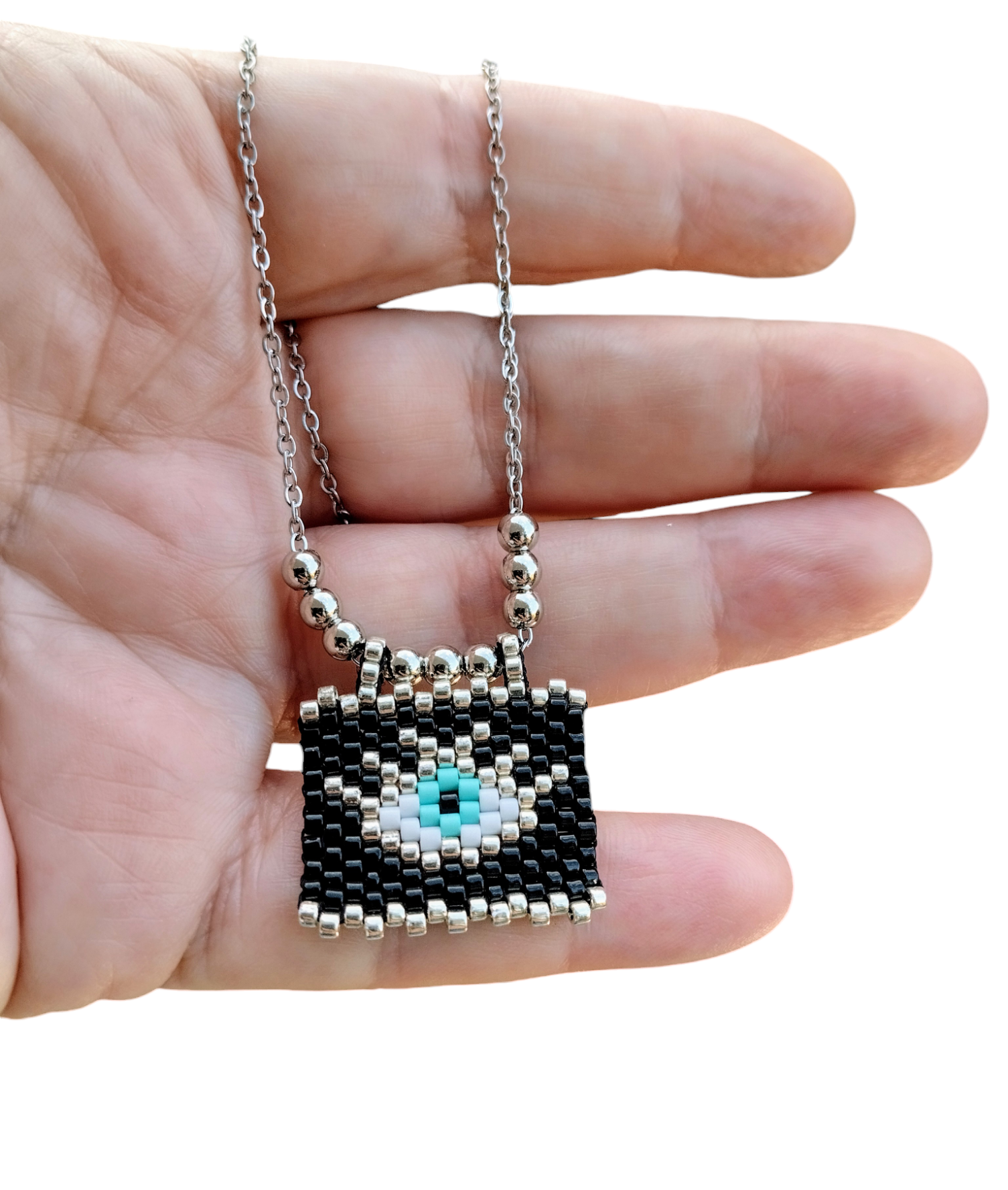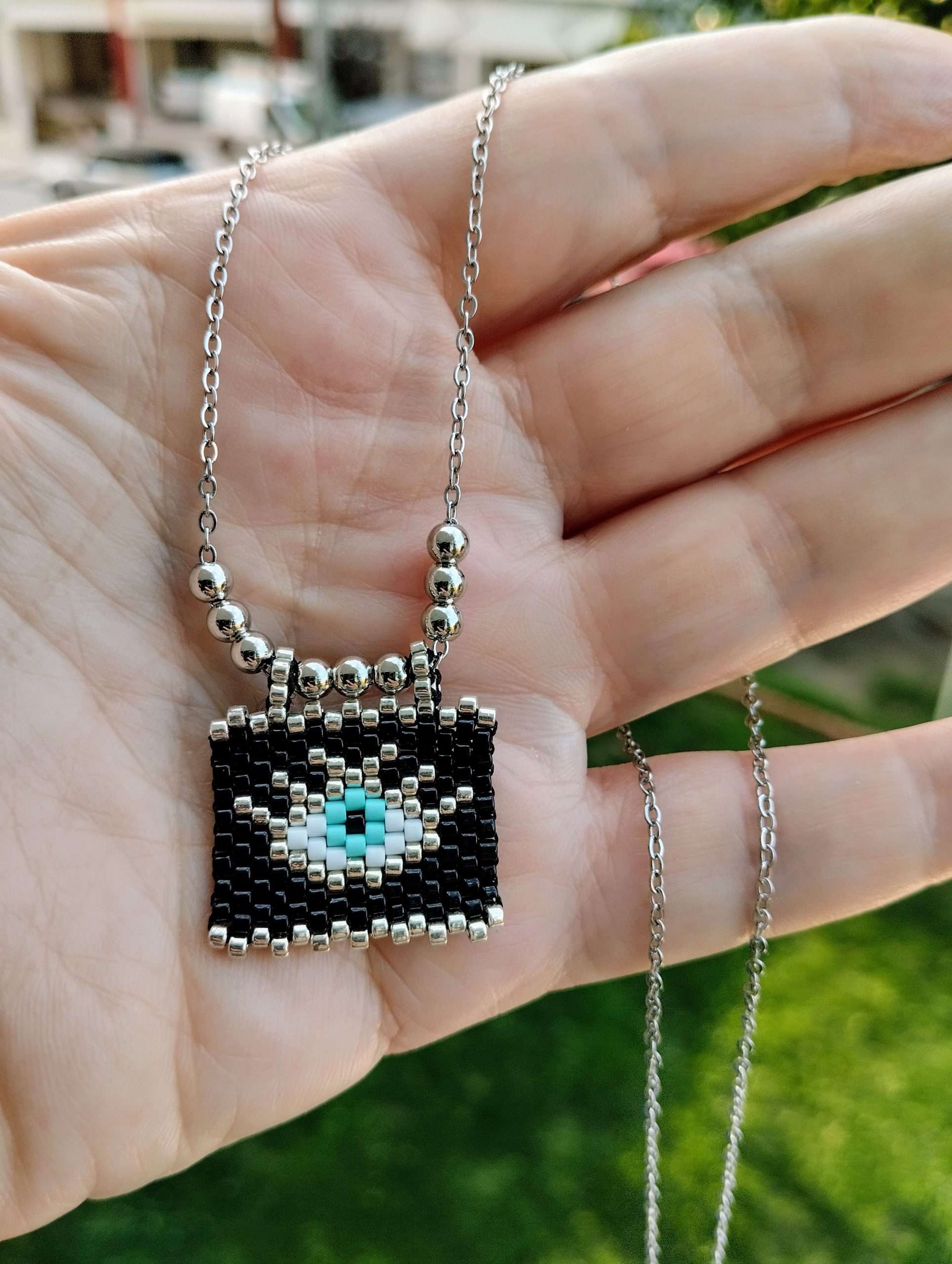 Είναι ένα υπέροχο ατσάλινο κολιέ μενταγιόν με ματάκι που είναι μέσα σε πλαίσιο…με χάντρες miyuki delica υψηλής ποιότητας στα χρώματα του μαύρου και του ασημί. Οι διαστάσεις του μενταγιόν είναι 2×2,5 εκ. Η αλυσίδα του είναι ατσάλινη. Διαθέτει κούμπωμα αυξομείωσης. Το μήκος της αλυσίδας είναι 40 +5 εκ η προέκταση της. Υπάρχει δυνατότητα να γίνει και σε χρυσό. Στα σχόλια της παραγγελίας σας σημειώστε το χρώμα που επιθυμείτε.
