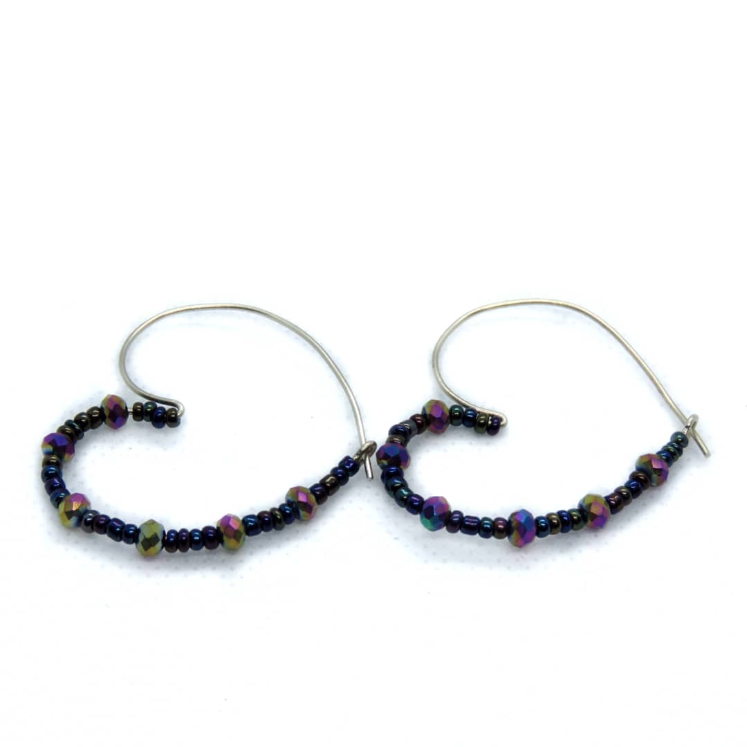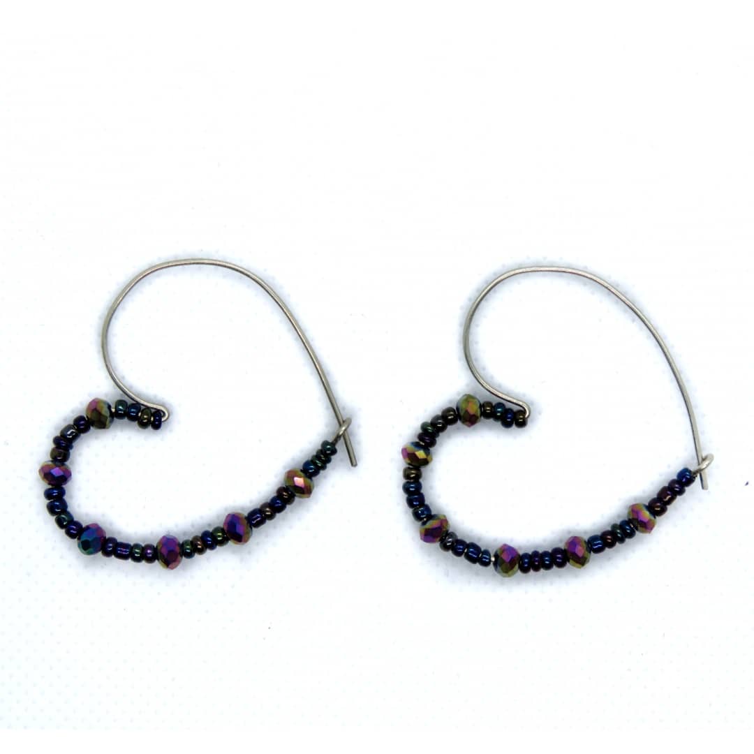 Σκουλαρίκια σε σχήμα καρδιάς από σύρμα αλπακά με γυάλινα χαντράκια και κρυσταλλάκια
