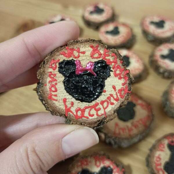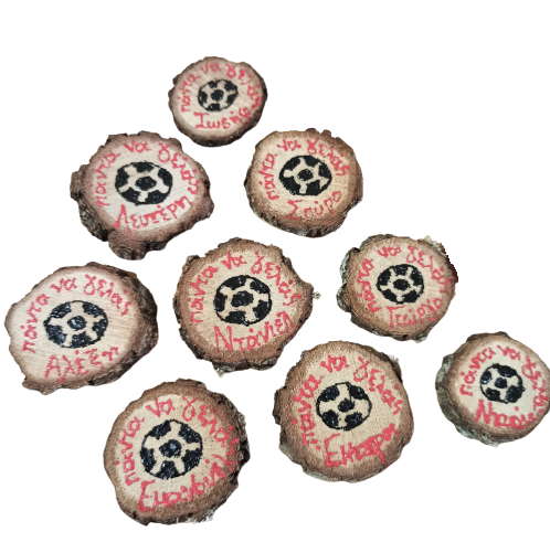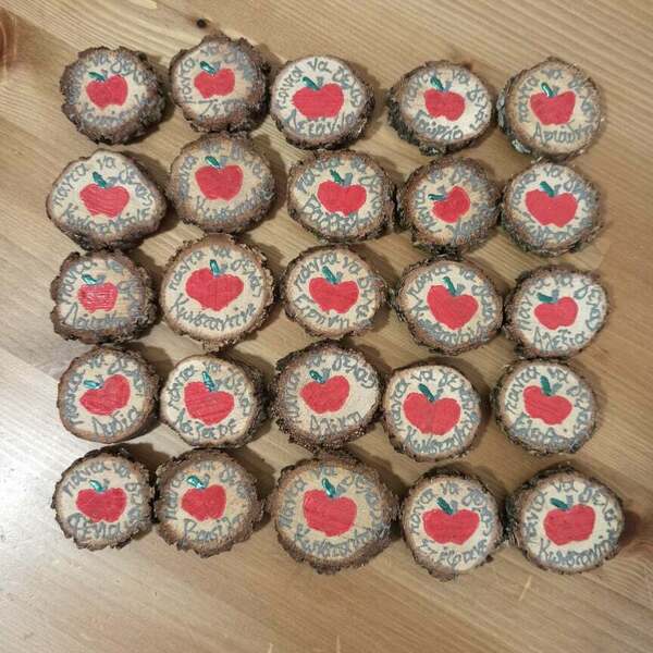 Η τιμή αφορά 12 τμχ μαγνητάκια σε φυσική φέτα ξύλου, ζωγραφισμένα στο χέρι σε ένα απλό σχέδιο, με όνομα παιδιού.