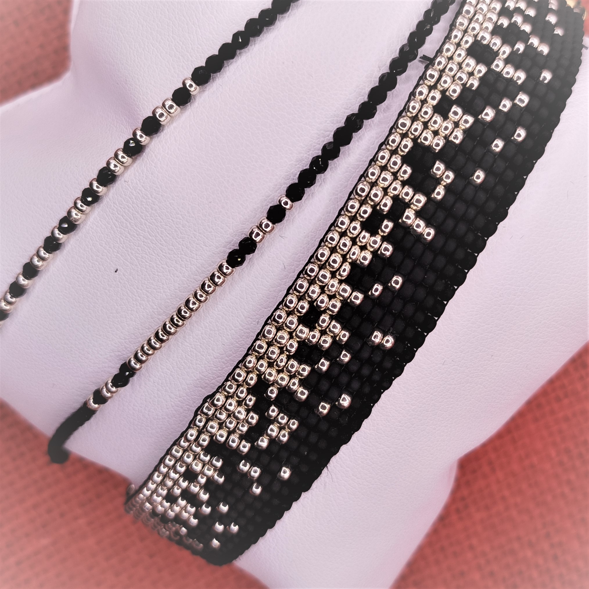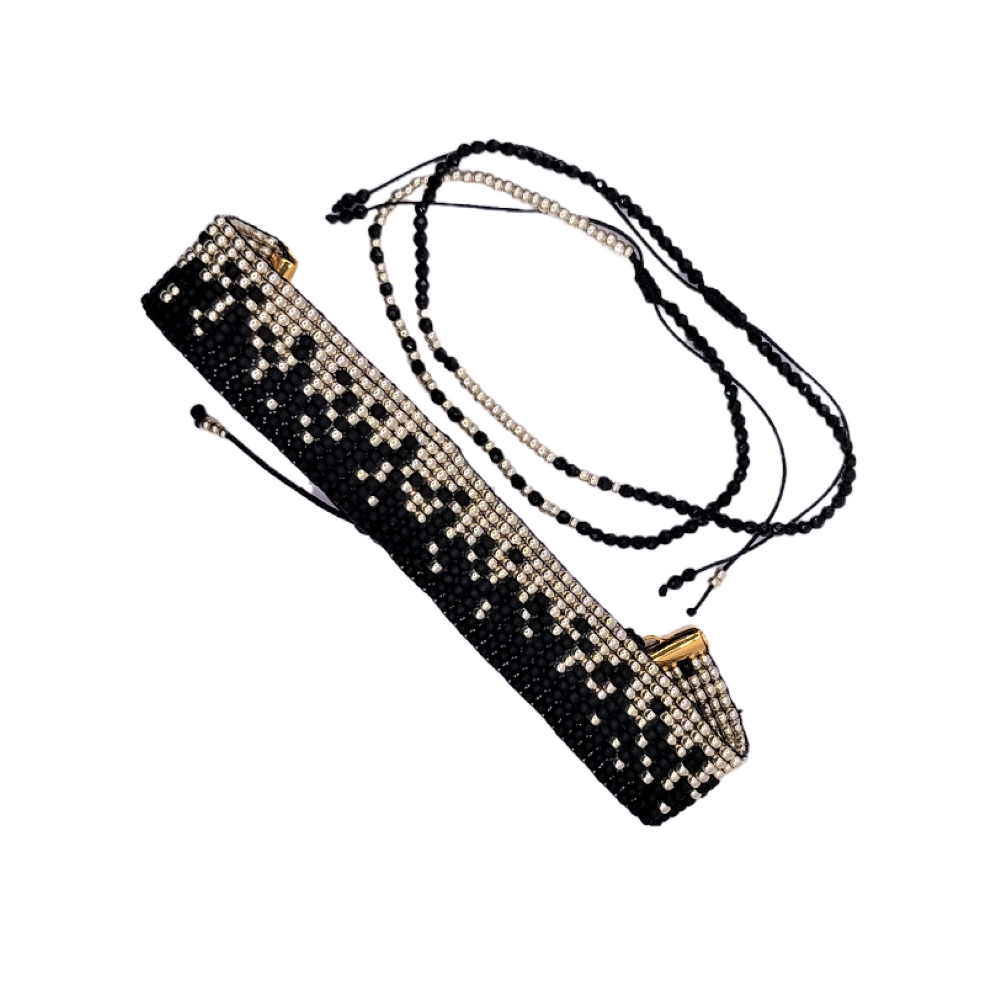 Κούμπωμα μεταλλικών ράβδων με κορδόνι ρυθμιζόμενου μήκους. Συνοδεύεται από μονόσειρα βραχιολάκια με κρυσταλλάκια μαύρα και επιμεταλλωμένες χάντρες σε χρυσό χρώμα.