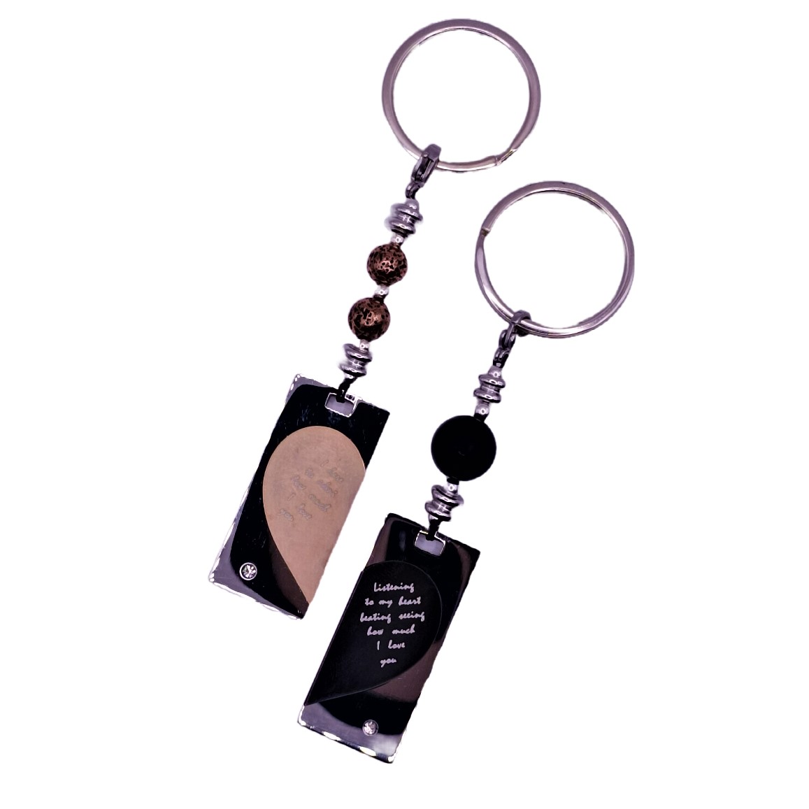 Σετ μπρελόκ με χαραγμένες καρδιές που η μία συμπληρώνει την άλλη, με ατσάλινες πλάκες, με λίθο Όνυχα και επιμεταλλωμένη Λάβας, ιδανικό για ζευγάρια.