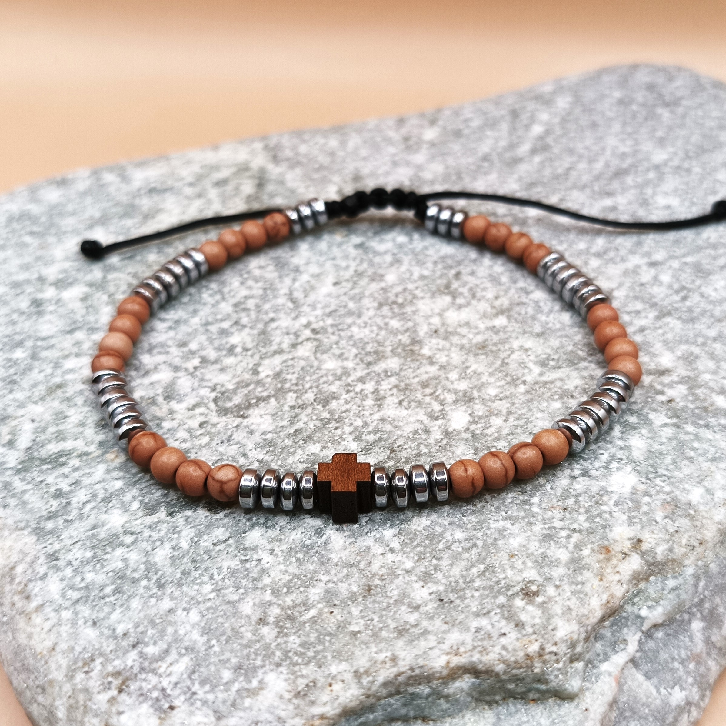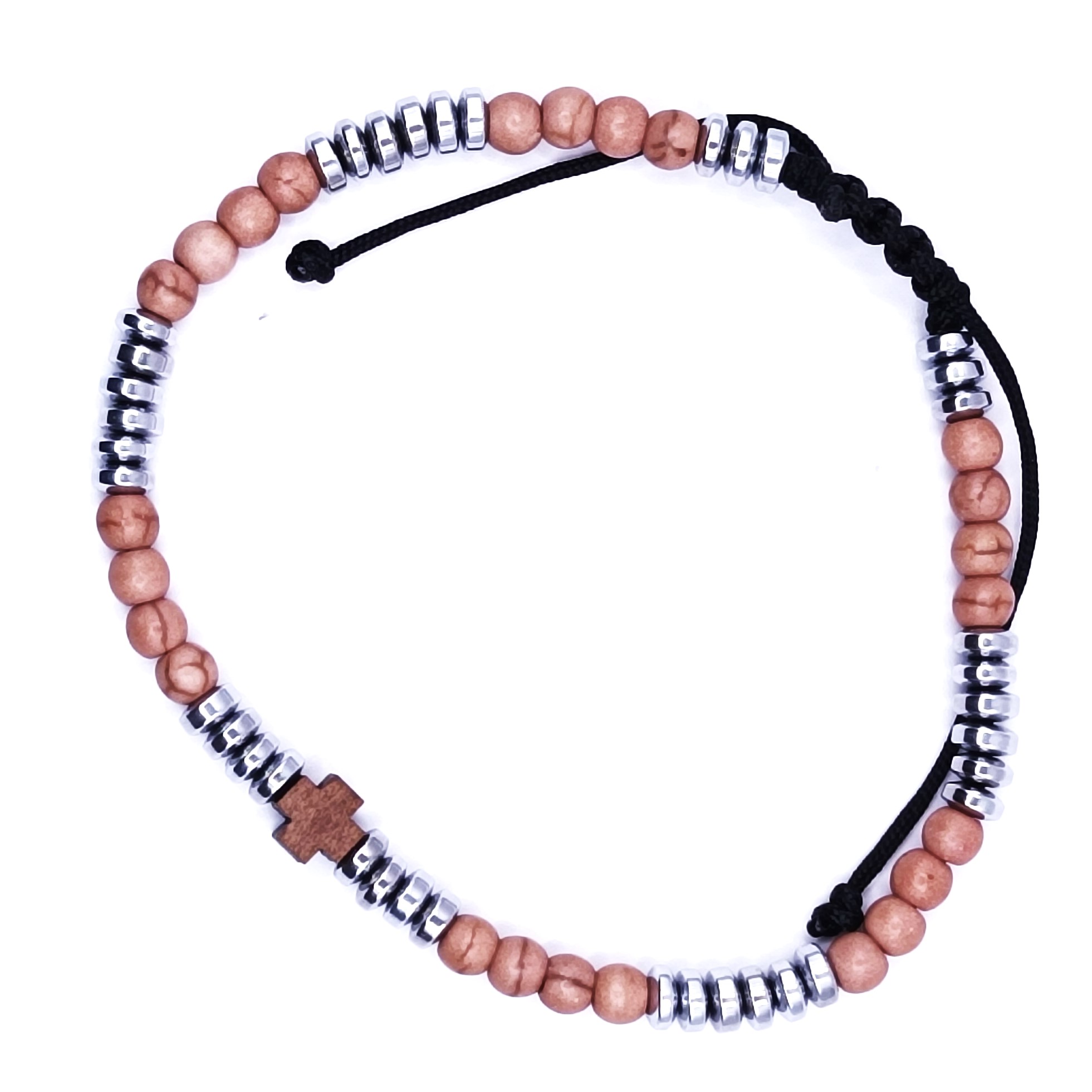 Σταυρουδάκι ξύλινο μικρό, ροδέλες αιματίτη σε ασημί και χαολίτης μπεζ σε ανδρικό βραχιόλι με ρυθμιζόμενο μήκος.