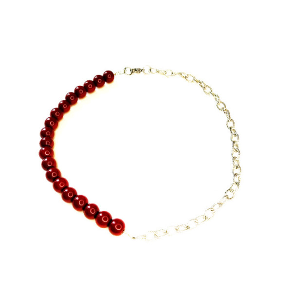 Κοντό κολιέ με ασημί ατσάλινη αλυσίδα και μπορντό χάντρες