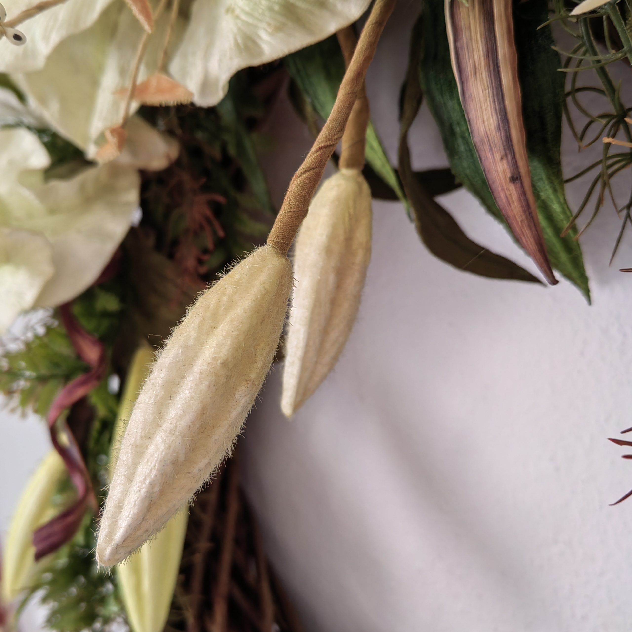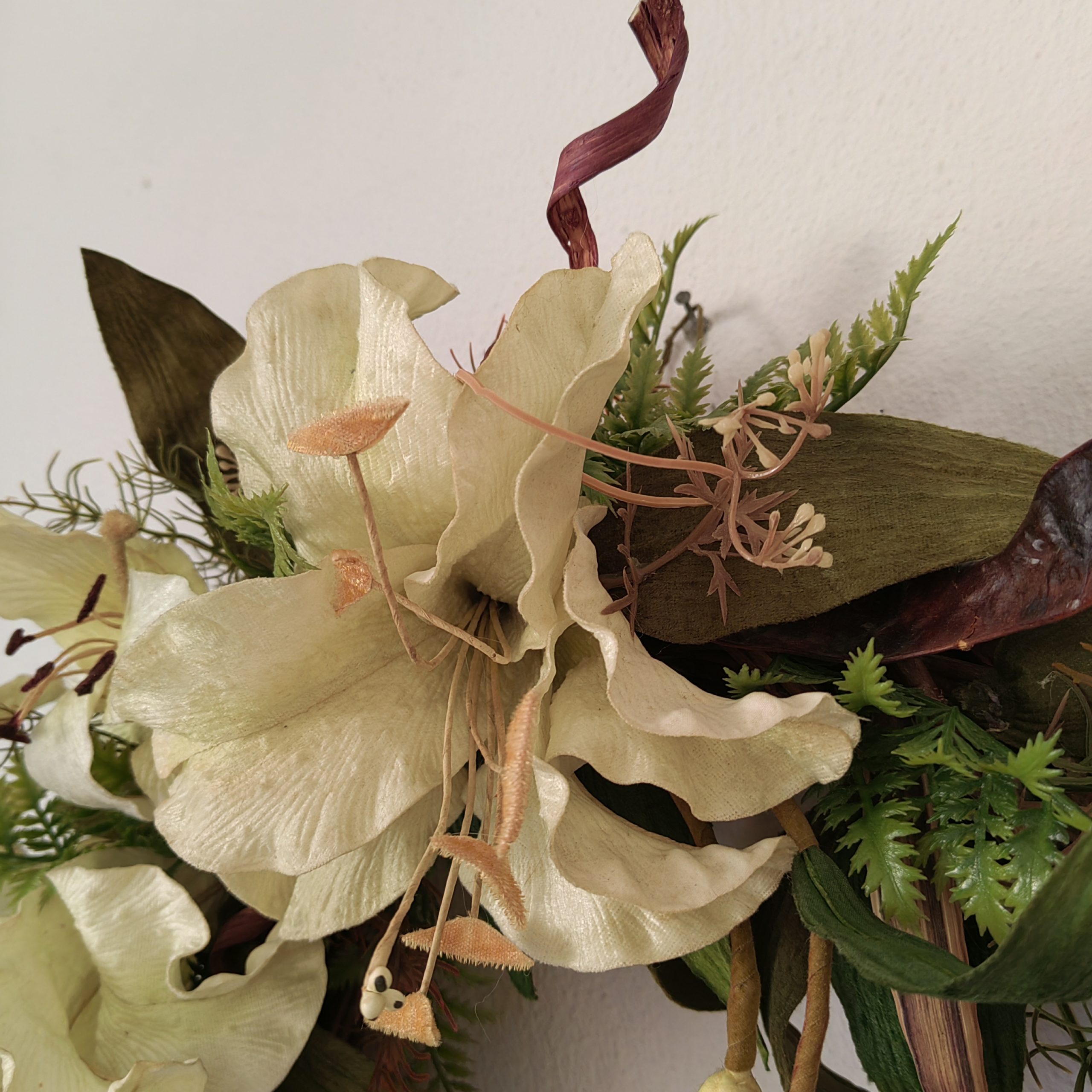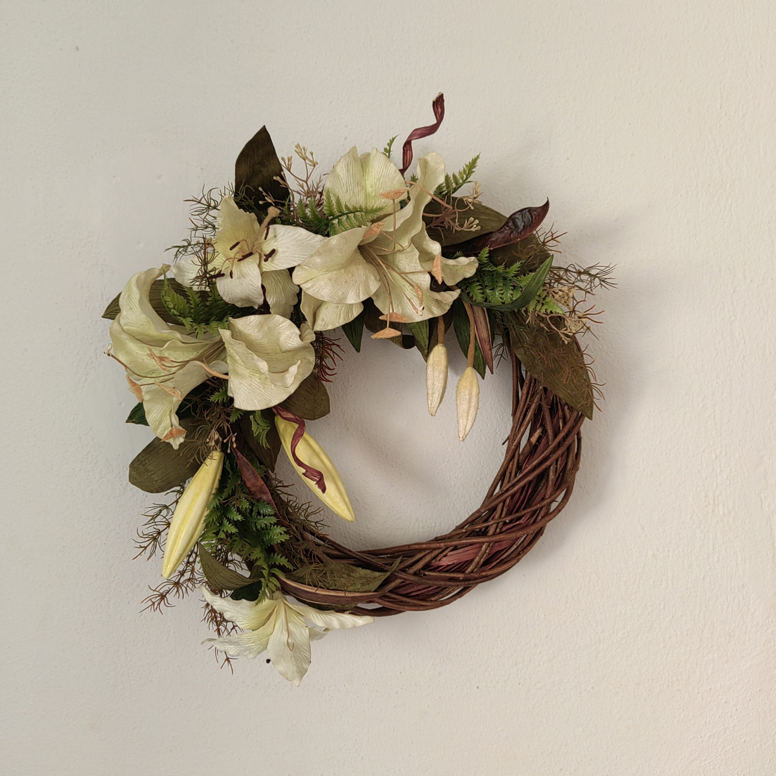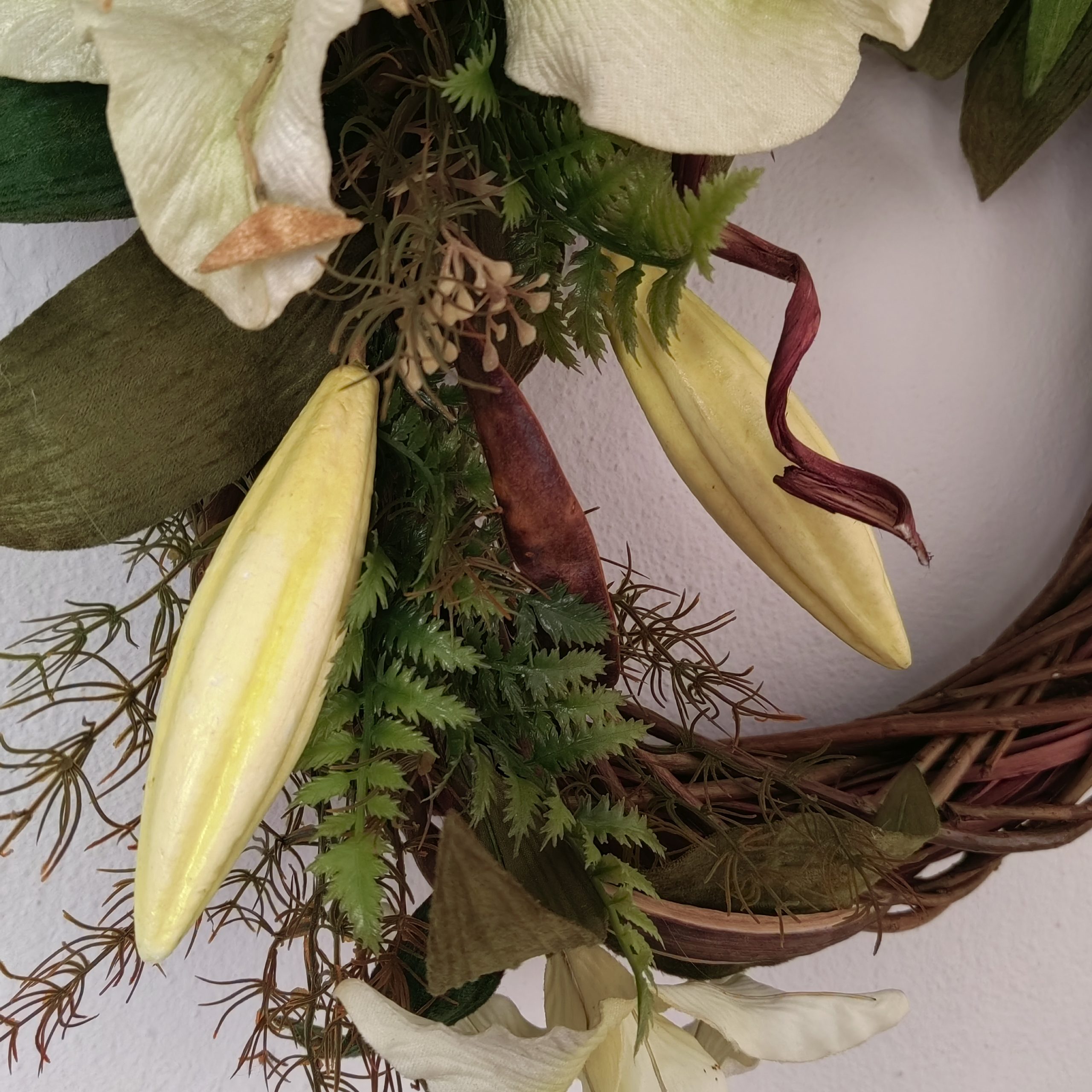 Ένα υπέροχο στεφάνι με βελούδινα λίλιουμ. Η διάμετρος του είναι 50 εκατοστά.