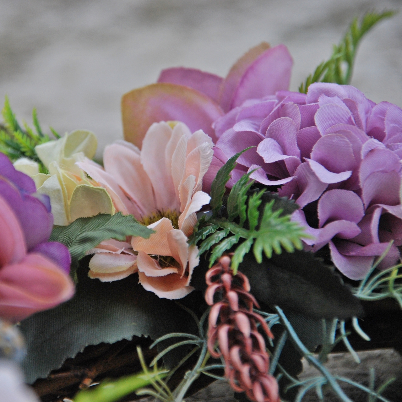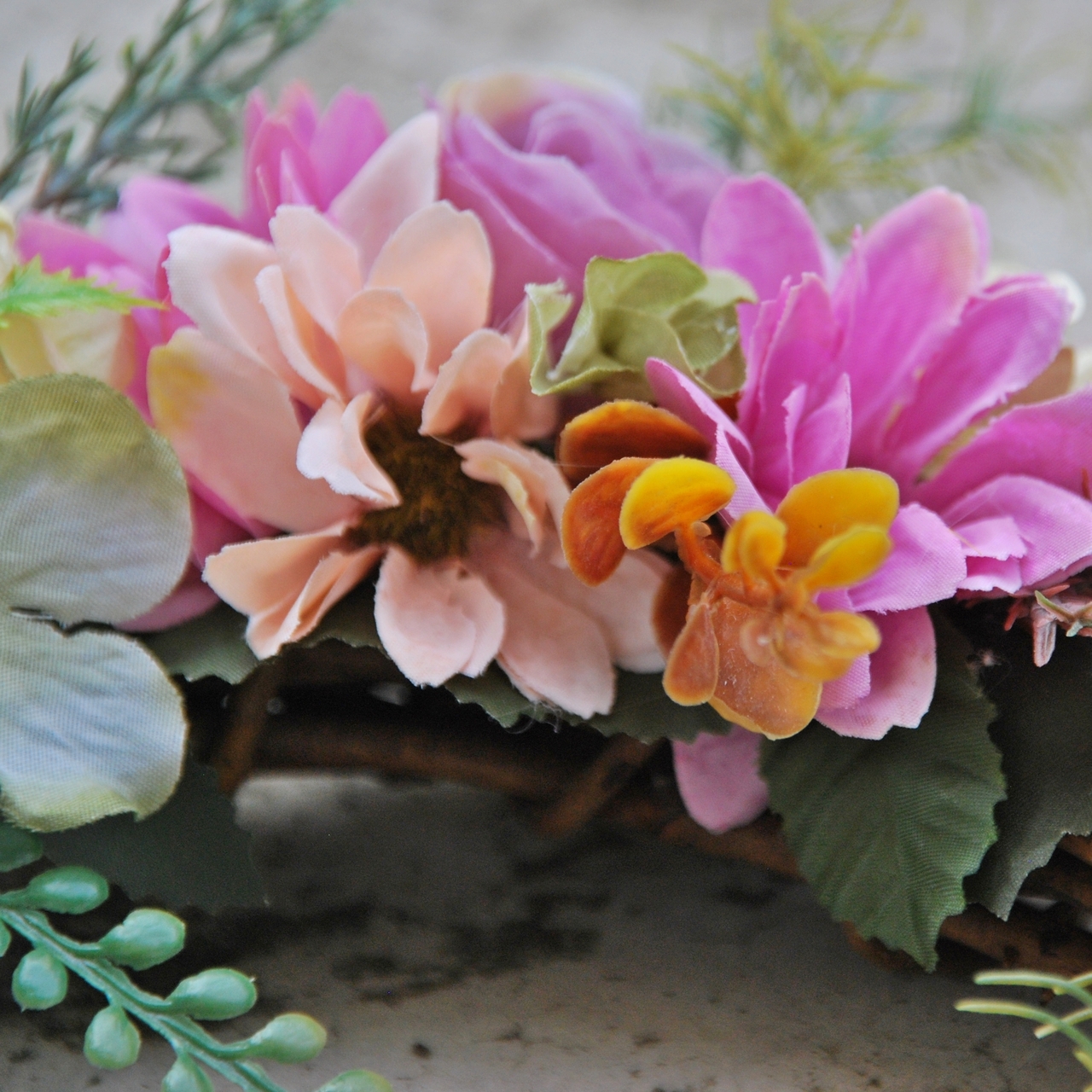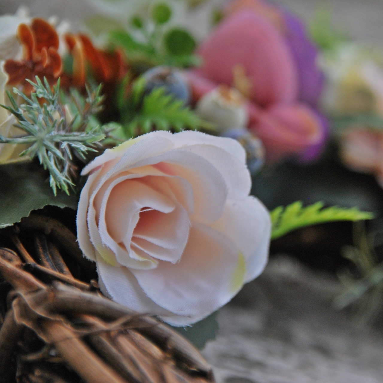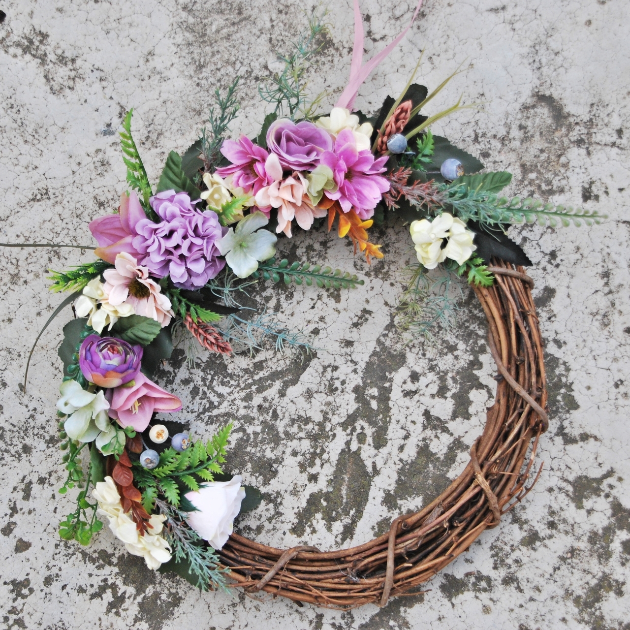 Διακοσμητικό στεφάνι με διάμετρο 30 εκατοστά. με όμορφα λουλούδια σε απαλούς τόνους.