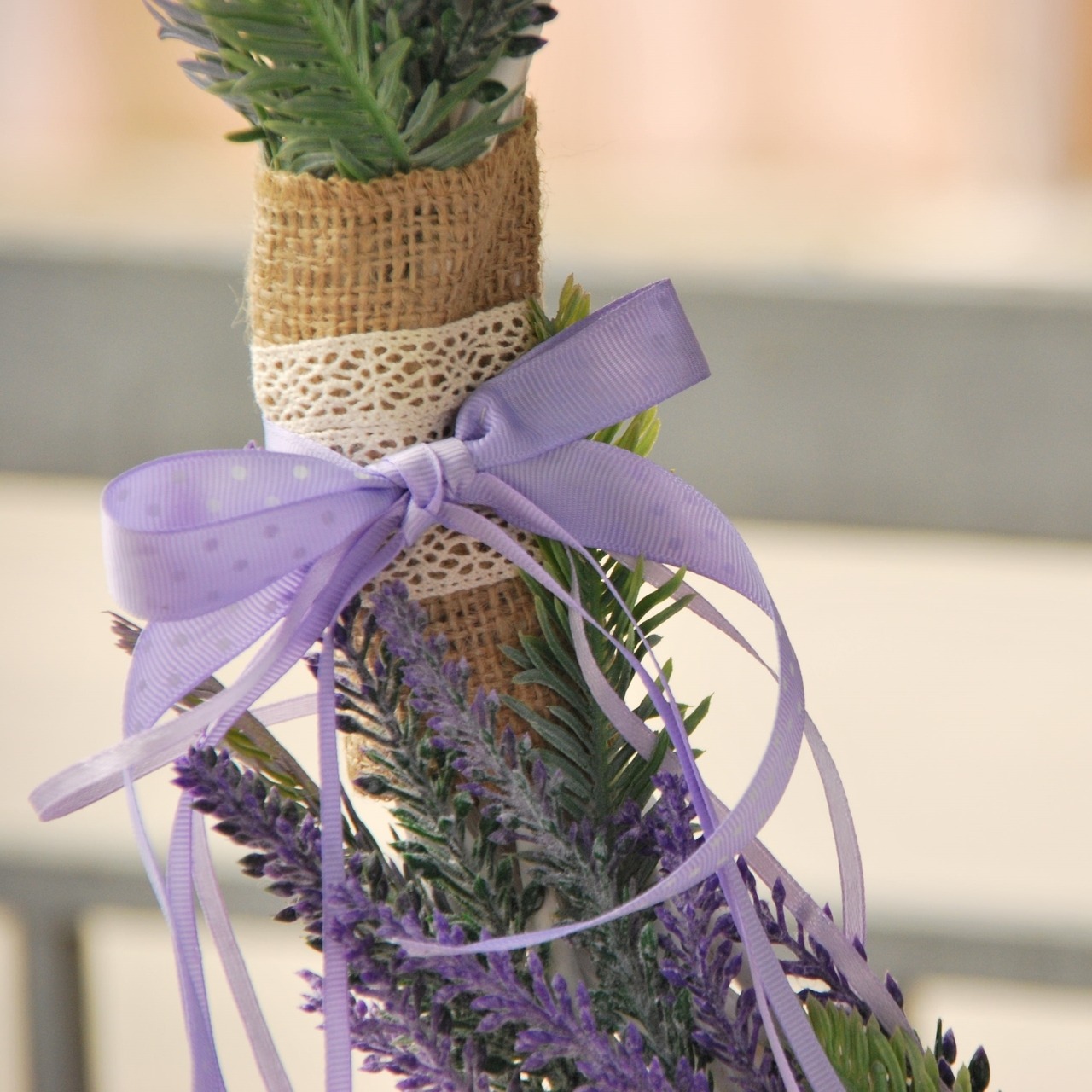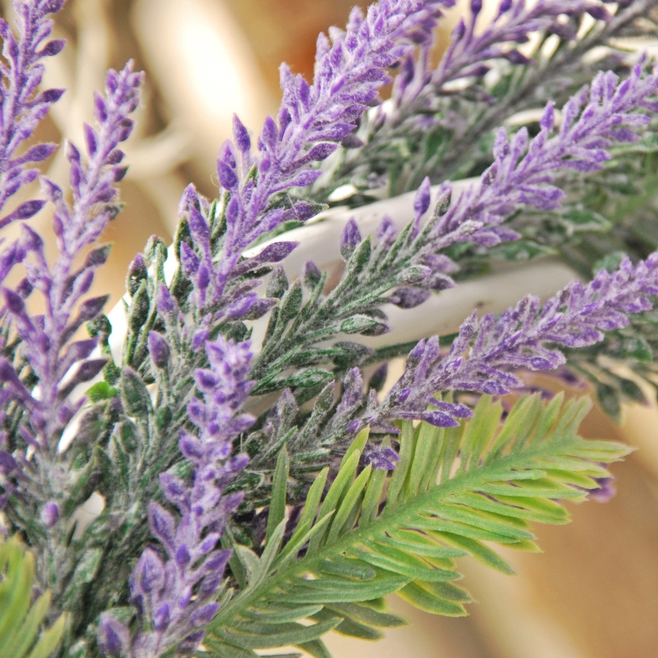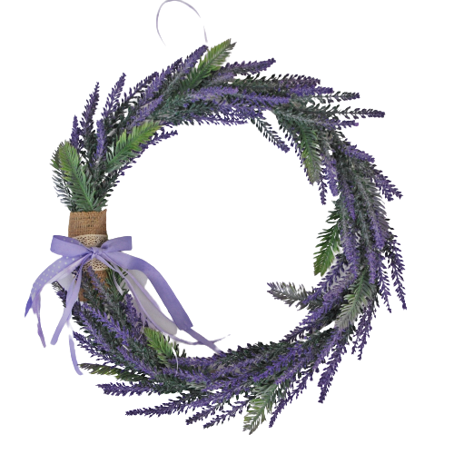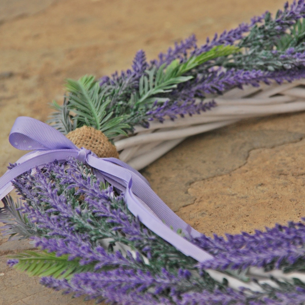 Ένα άσπρο στεφάνι με διάμετρο 35 εκατοστά, γεμάτο λεβάντες και κλαδάκια από φτέρες.