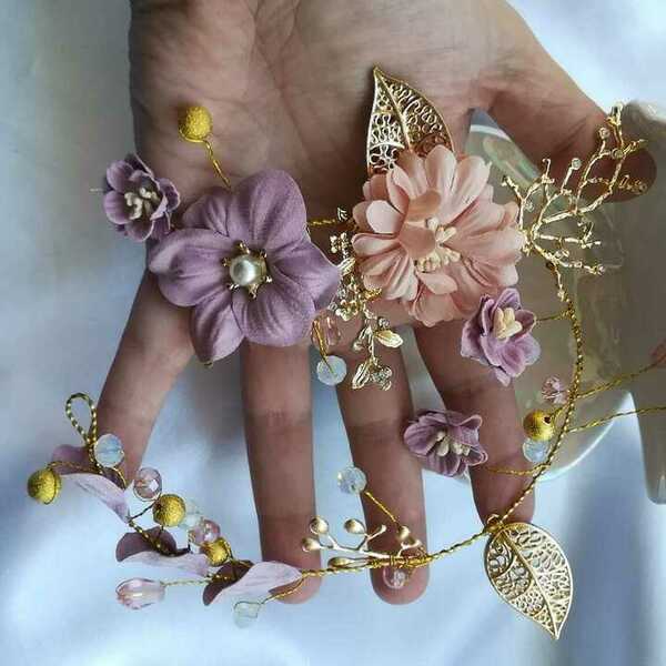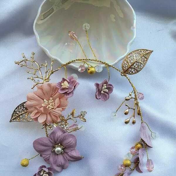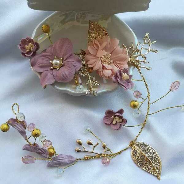Αυτό το ευέλικτο κόσμημα μαλλιών συνδυάζει την κομψότητα του χρυσού με την παιχνιδιάρικη γοητεία των μωβ και ροζ λουλουδιών. Κατασκευασμένο με ιδιαίτερη προσοχή στη λεπτομέρεια, το κόσμημα αυτό είναι αρκετά ευκαμπτο για να προσαρμόζεται εύκολα σε διάφορους τύπους χτενισμάτων. Τα λουλούδια, σε απαλά μωβ και ροζ αποχρώσεις, προσθέτουν μία ρομαντική και εντυπωσιακή αίσθηση, κάνοντάς το ιδανικό για γάμους, βαπτίσεις ή άλλες ειδικές περιστάσεις. Μια μοναδική επιλογή για να αναδείξετε τη φυσική σας ομορφιά με μια δόση χρυσής λάμψης και λουλουδένιας φινέτσας.