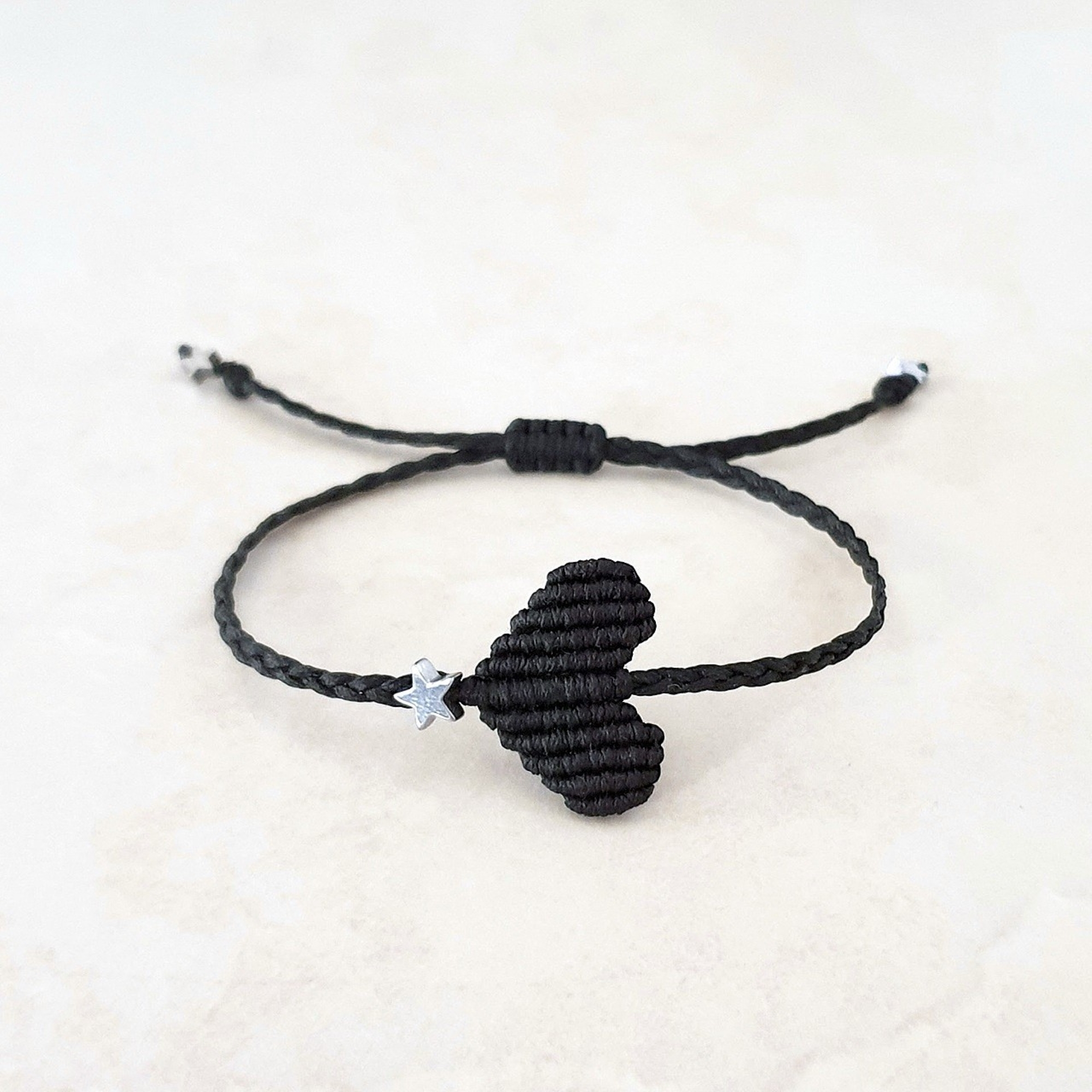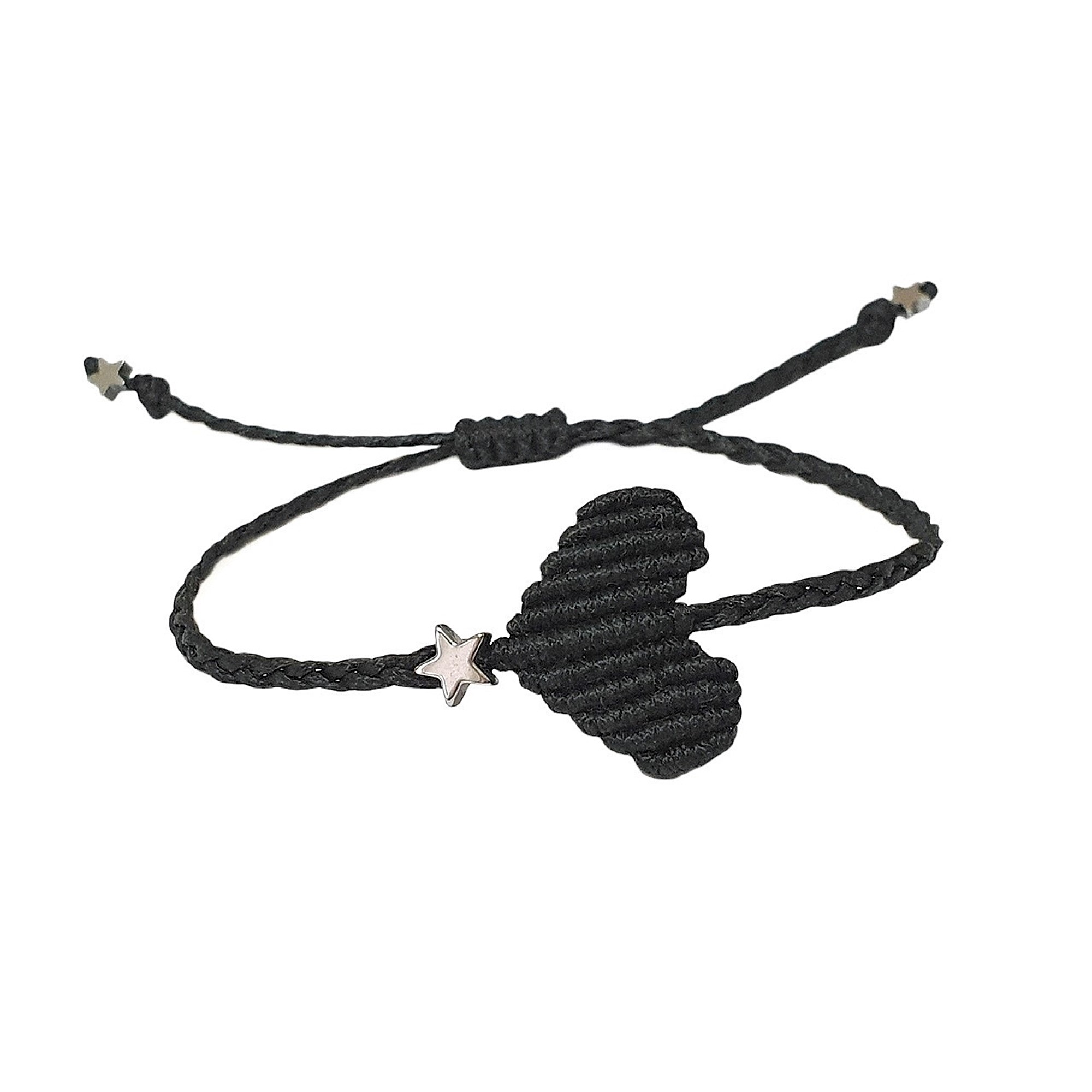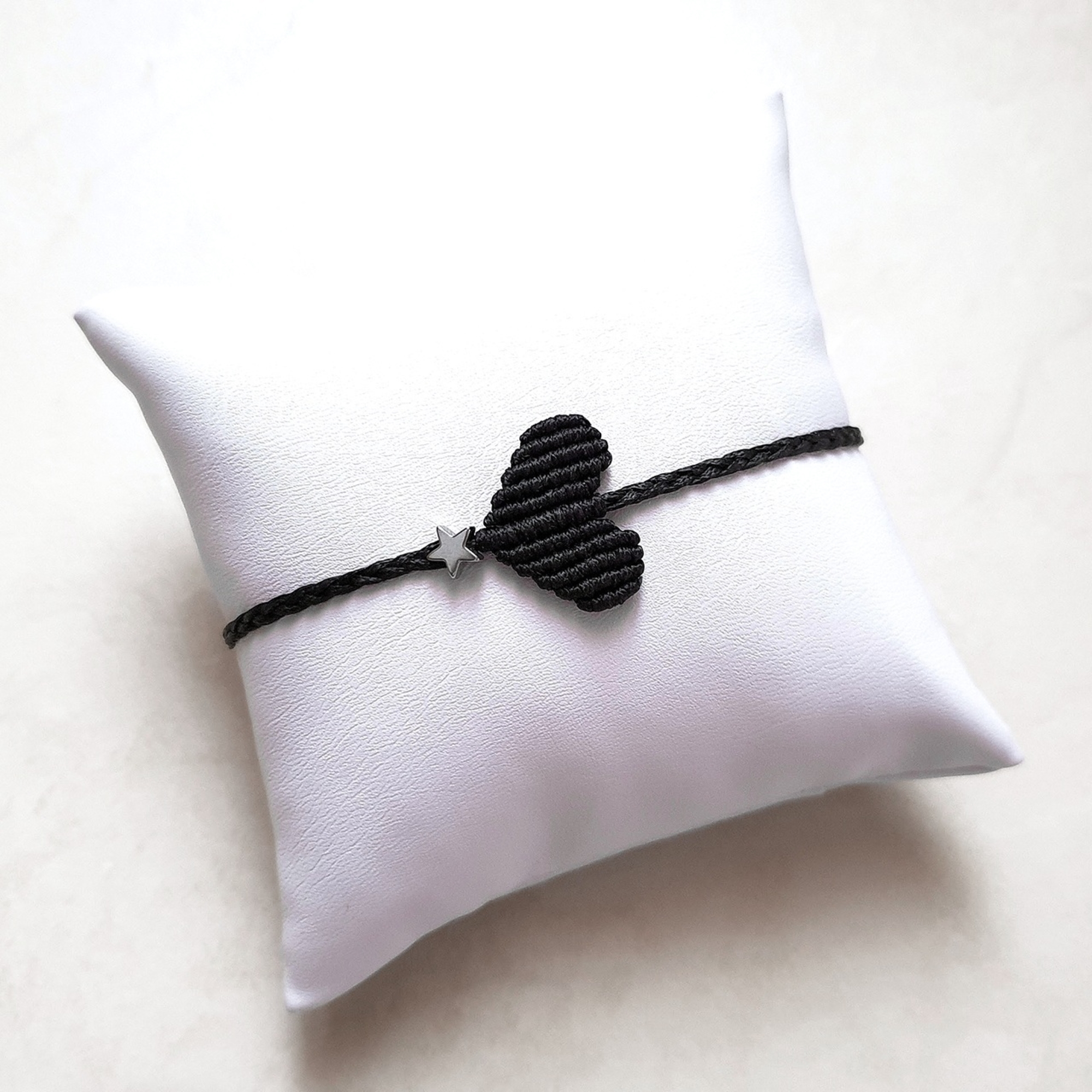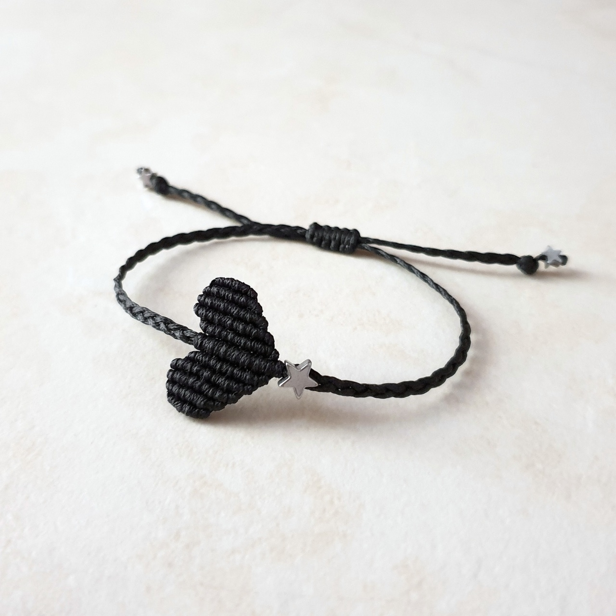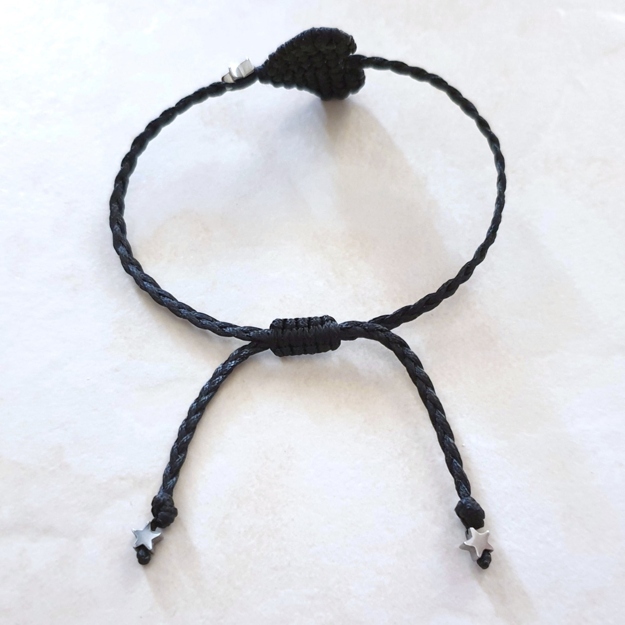 Βραχιόλι με καρδιά χειροποίητο μακραμέ όλο μαύρο στολισμένο με αστεράκια από αιματίτη σε ασημί χρώμα.