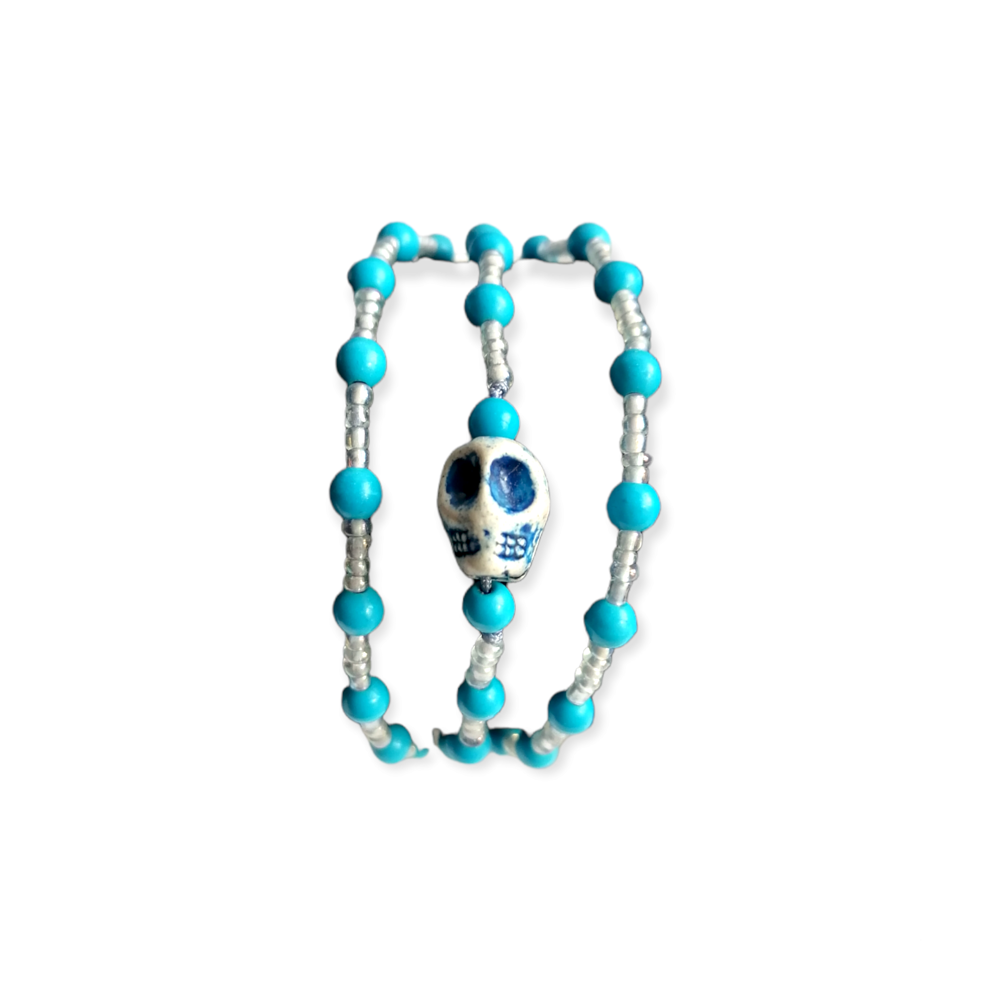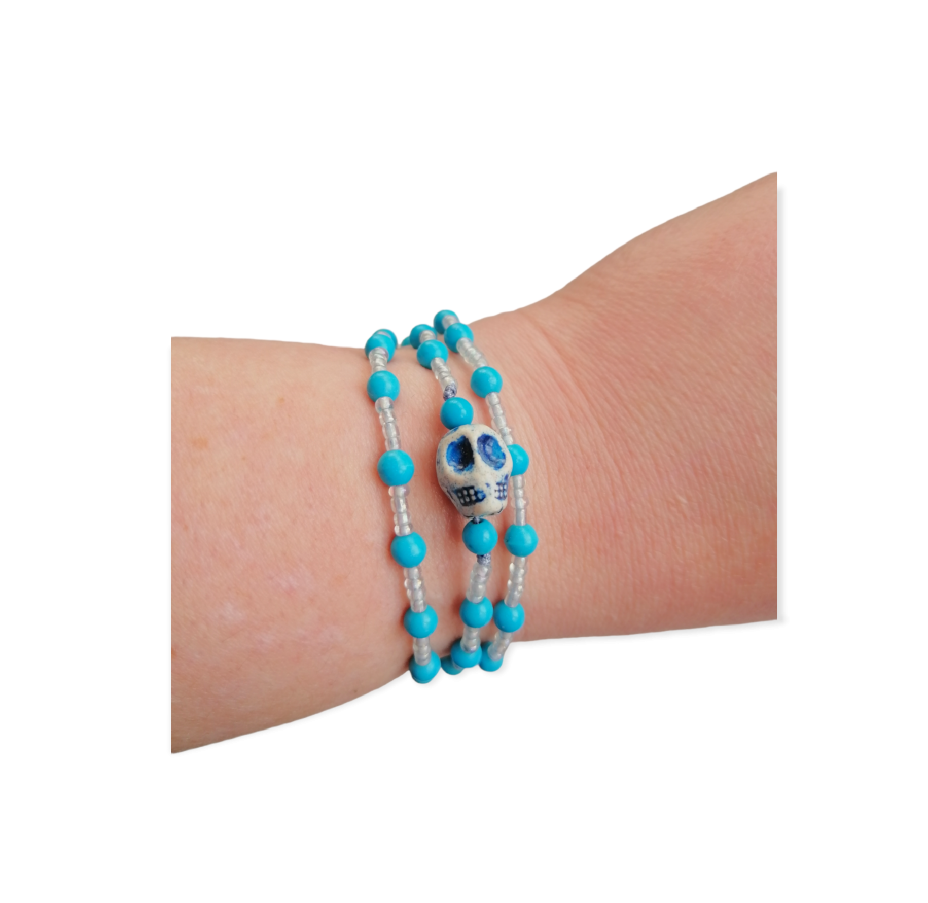 Βραχιόλι 3 σειρές γαλάζιο με χάντρες πάστα τιρκουάζ και νεκροκεφαλή σε κορδόνι ρυθμιζόμενο