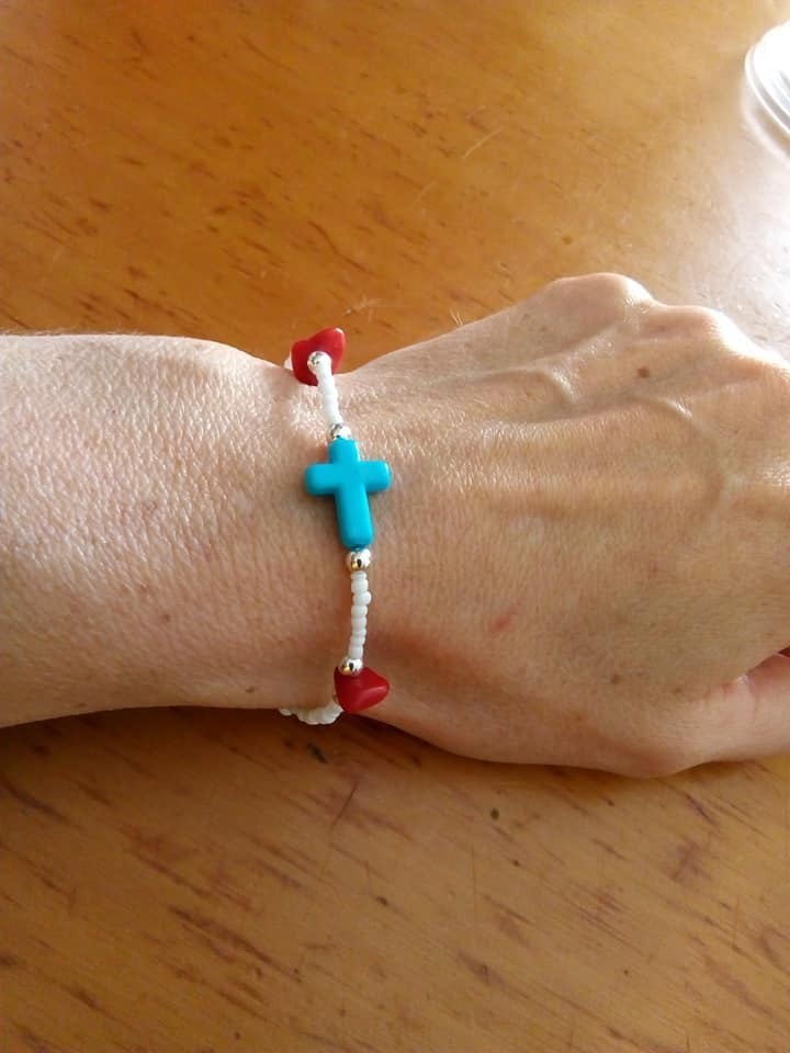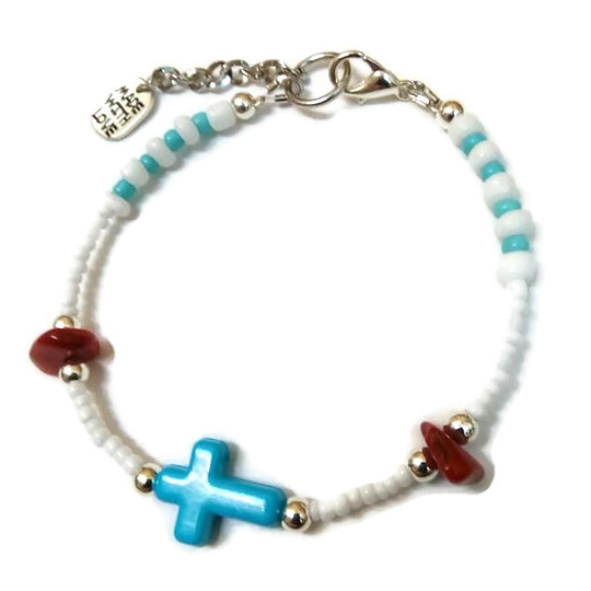 Χειροποίητο βραχιόλι σταυρός | Κοράλλια, μεταλλικά στοιχεία λευκές και γαλάζιες χάντρες