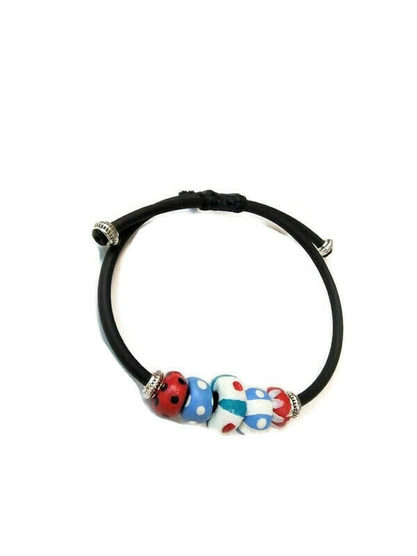 Χειροποίητο βραχιόλι με χειροποίητες χάντρες από πηλό με καουτσούκ μαύρο στρογγυλό κορδόνι. Κόμπος Αυξομείωσης. Είναι ένα κόσμημα που φοριέται όλες τις ώρες. Όχι επαφή με το νερό!