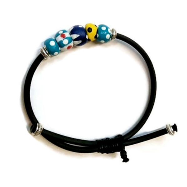 Βραχιόλι με χειροποίητες χάντρες από πηλό με Καουτσούκ μαύρο στρογγυλό κορδόνι . Μέγεθος-Κόμπος Αυξομείωσης. Είναι ένα κόσμημα που φοριέται όλες τις ώρες. Όχι επαφή με το νερό! Μοναδικό Κομμάτι.