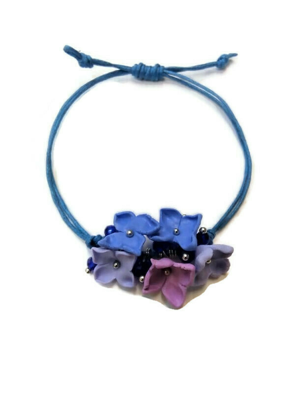 Βραχιόλι με λουλούδια από πολυμερικο πηλό με Kορδόνι Κερωμένο σε μπλε χρώμα+ χάντρες. Κόμπος Αυξομείωσης. Είναι ένα κόσμημα που φοριέται όλες τις ώρες. Μοναδικό Κομμάτι.
