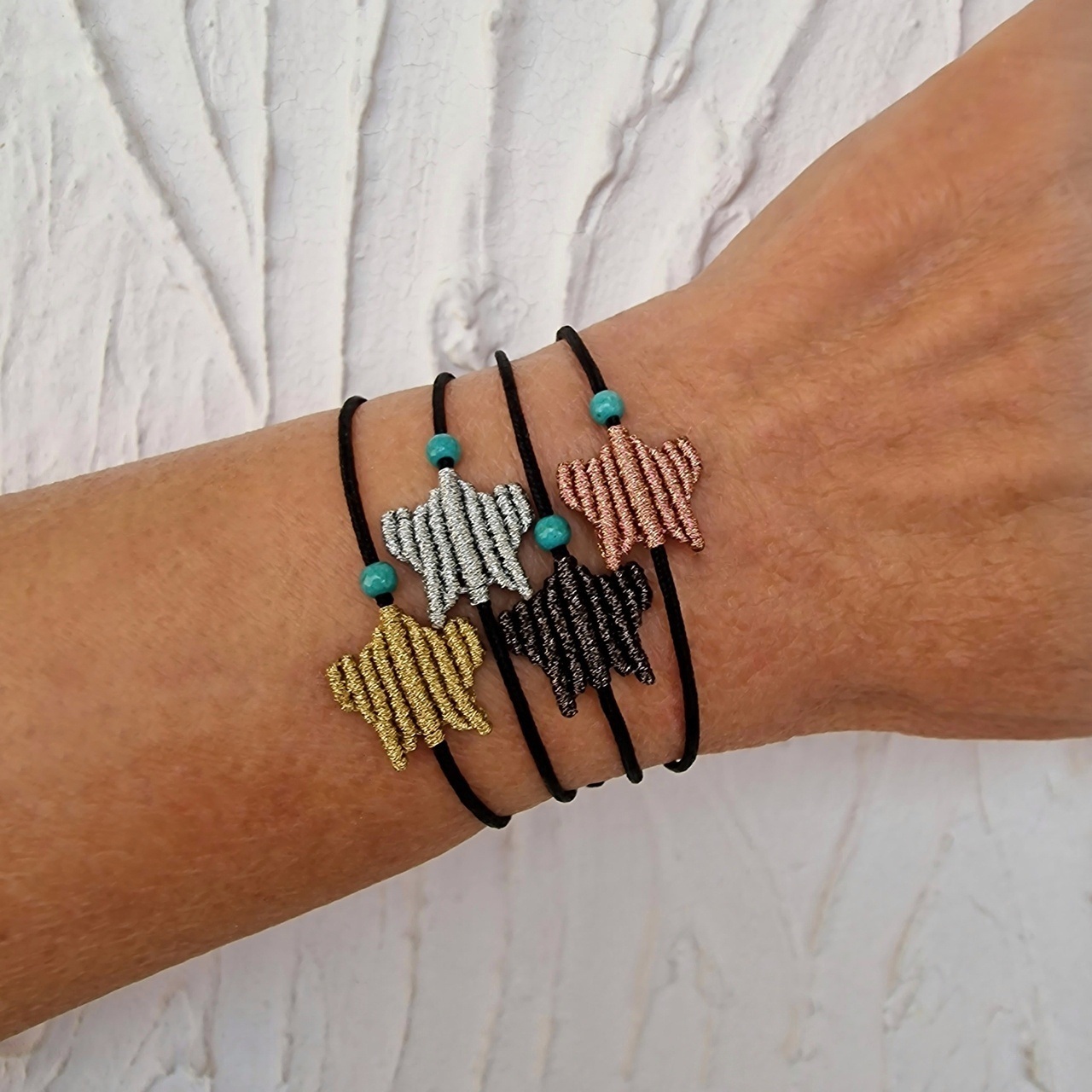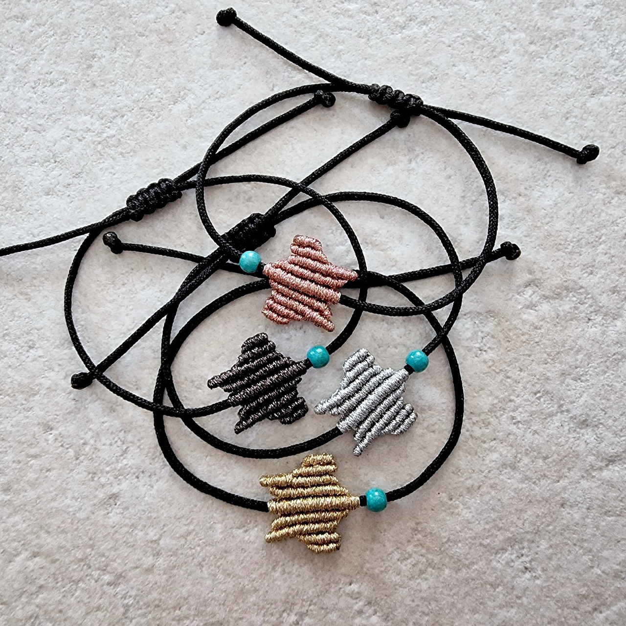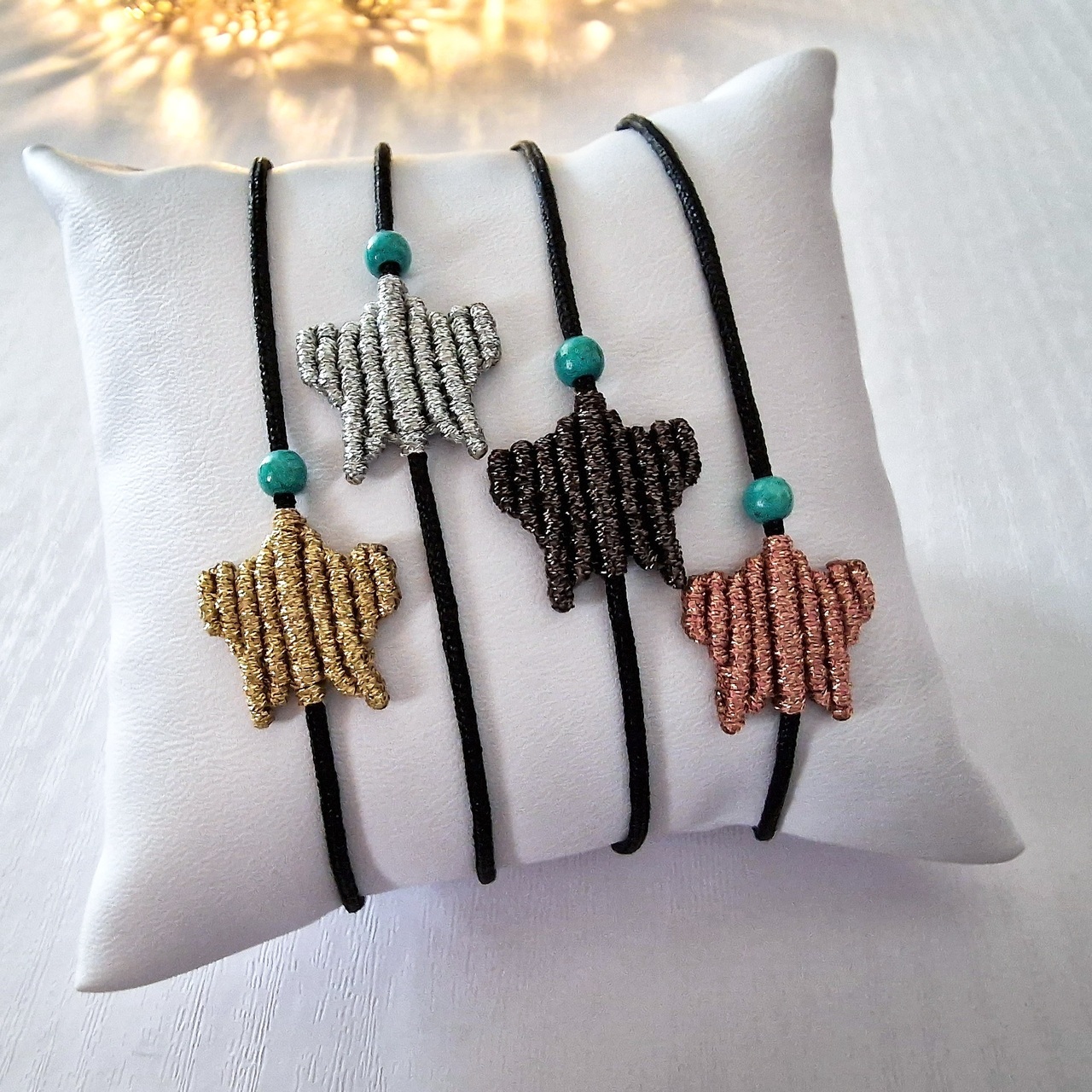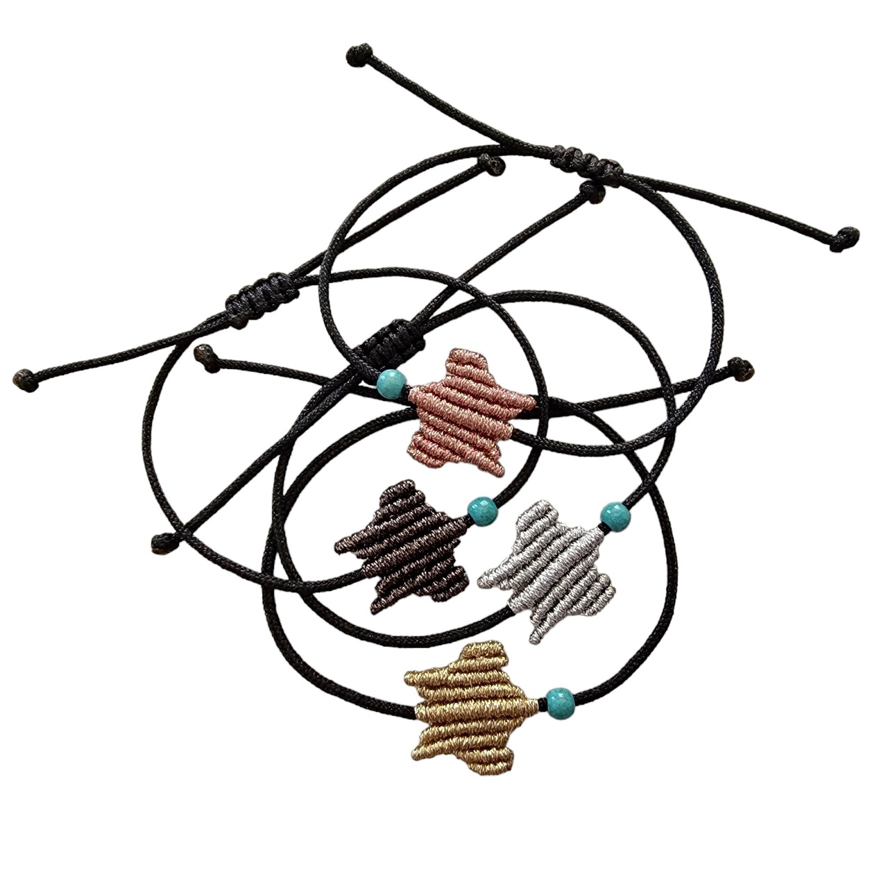 Βραχιόλι με αστεράκι μεταλιζέ χειροποίητο, τεχνικής μακραμέ, στολισμένο με χάντρα τυρκουάζ χαολίτη. Πλεγμένο με κορδόνια άριστης ποιότητας που δεν αλλοιώνονται στον ήλιο και στο νερό. Κλείνει με κούμπωμα αυξομείωσης για να ταιριάζει σε όλα τα μεγέθη.