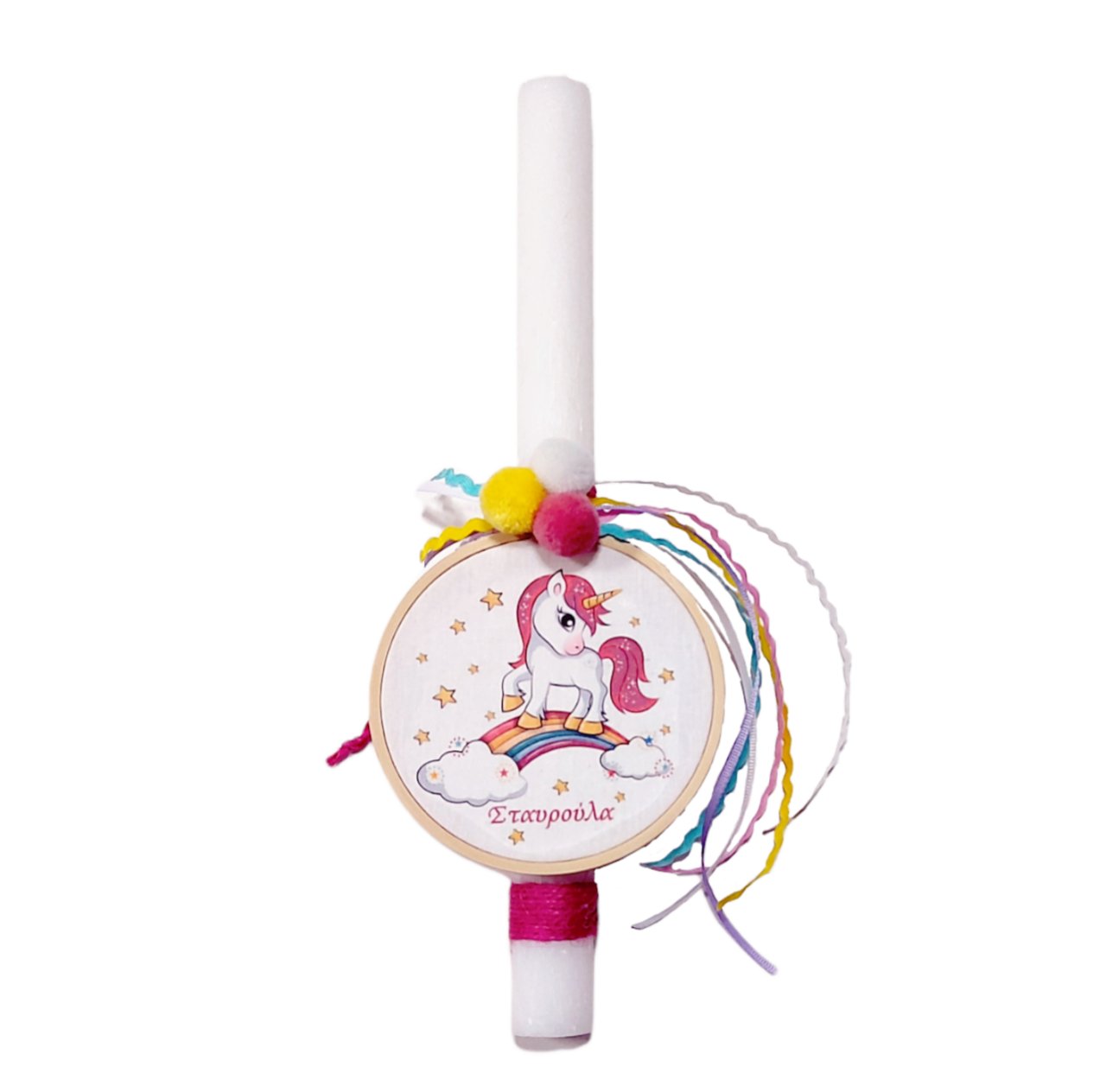 Προσωποποιημένη λαμπάδα 30εκ. για το πρώτο Πάσχα της γλυκιάς σας βαφτιστήρας με ξύλινο κρεμαστό διακοσμητικό τελάρο 10 εκ.