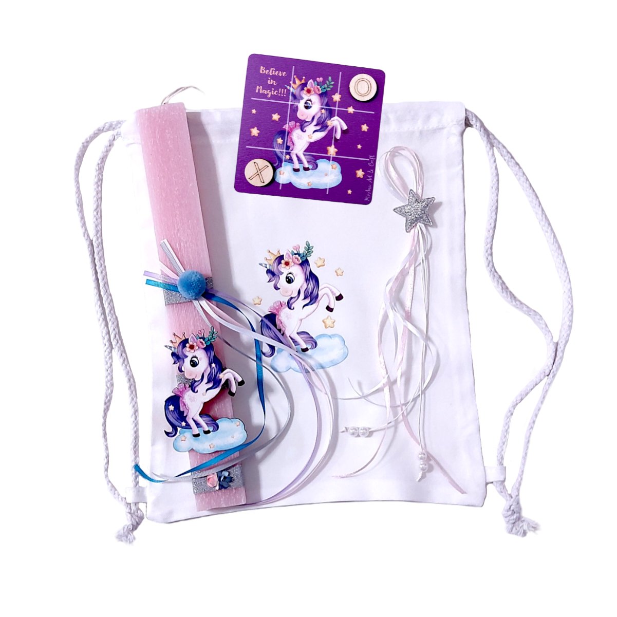 Λαμπάδα 30εκ. με ξύλινη φιγούρα μαγνητάκι μονόκερος 9 εκ, τρίλιζα 10 εκ και σακίδιο πλάτης 30×25εκ.