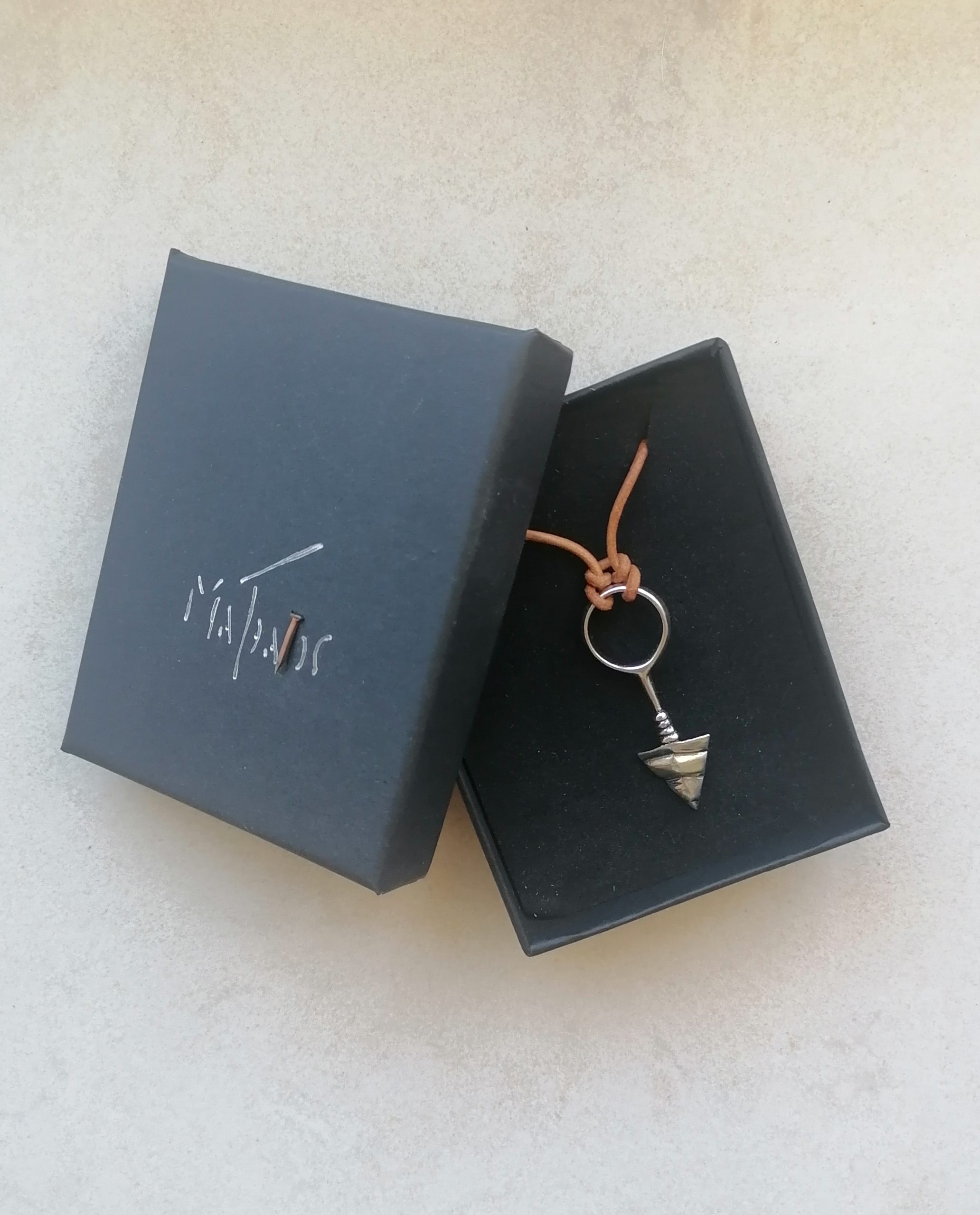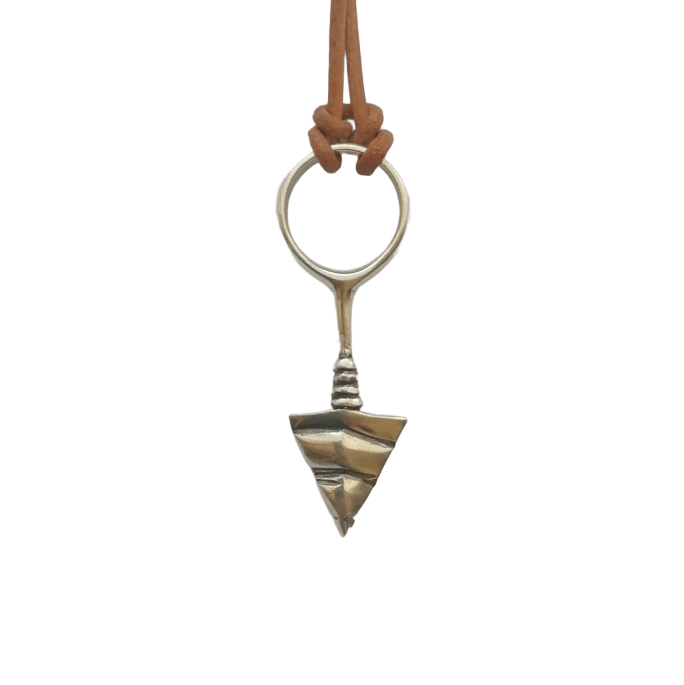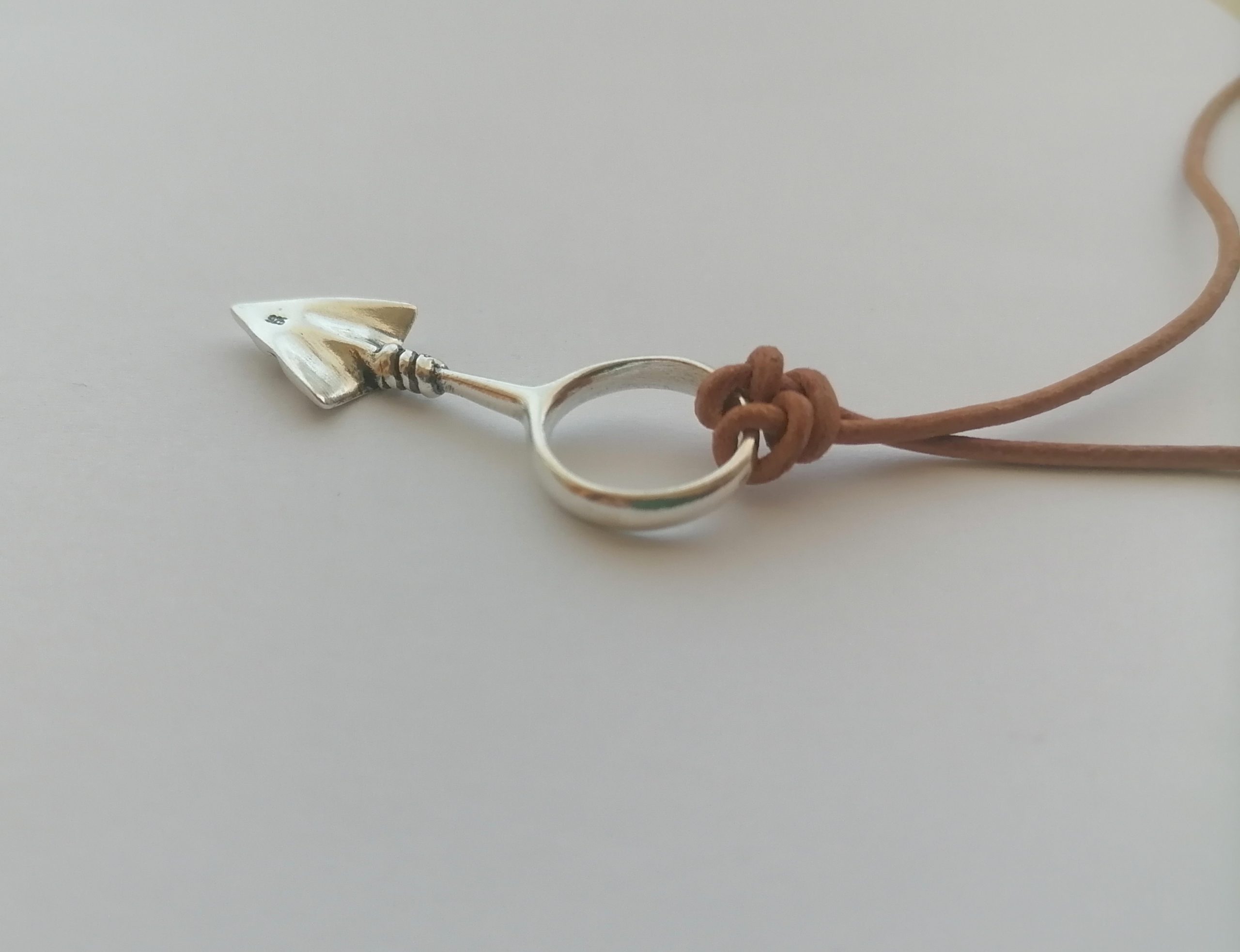 Βέλος από ασήμι 925, διαστάσεων περίπου: 4,3cm x 1,5cm x 3,2mm, με ρυθμιζόμενου μήκους δερμάτινο κορδόνι, σε χρώμα ανοικτό καφέ ή μαύρο, διατομής 1,5 mm.