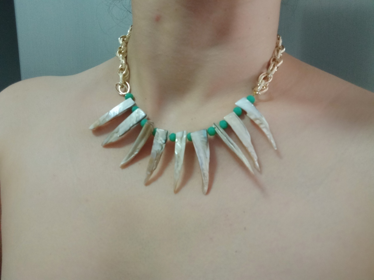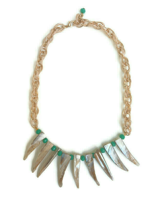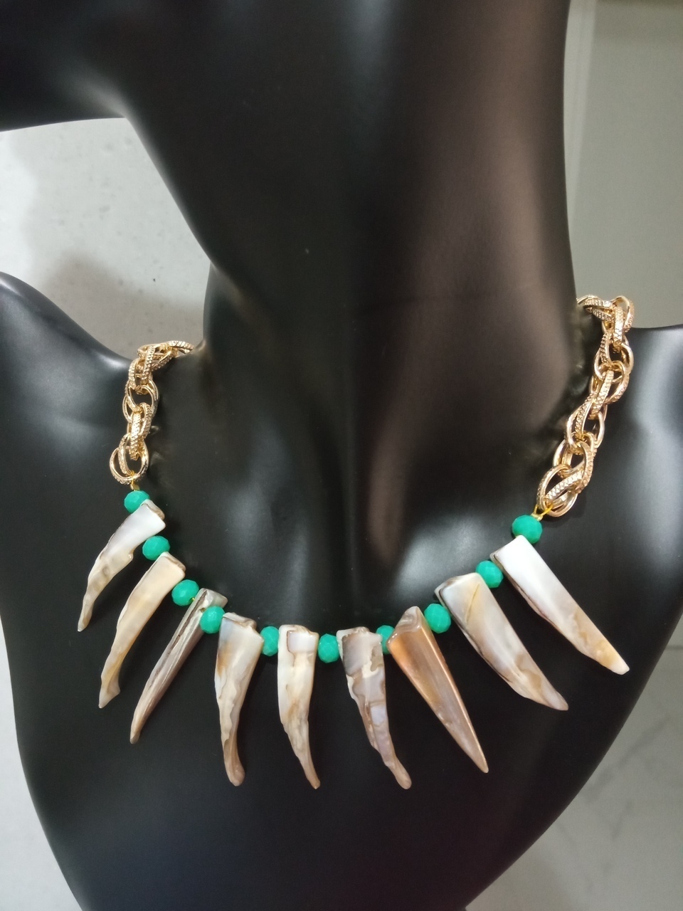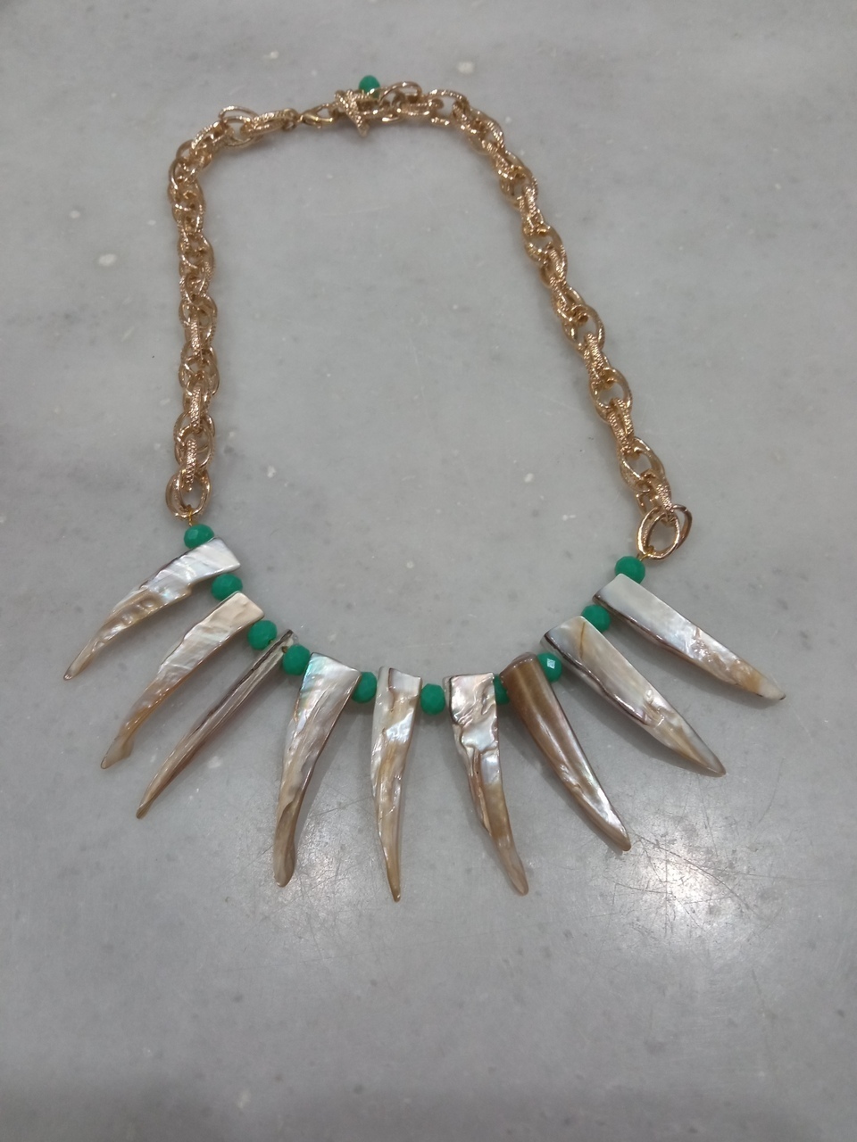 Κολιέ με χρυσή αλυσίδα αλουμινίου κρύσταλλα σε πράσινο χρώμα της θάλασσας και κοχύλι δόντι λευκό με μπεζ
