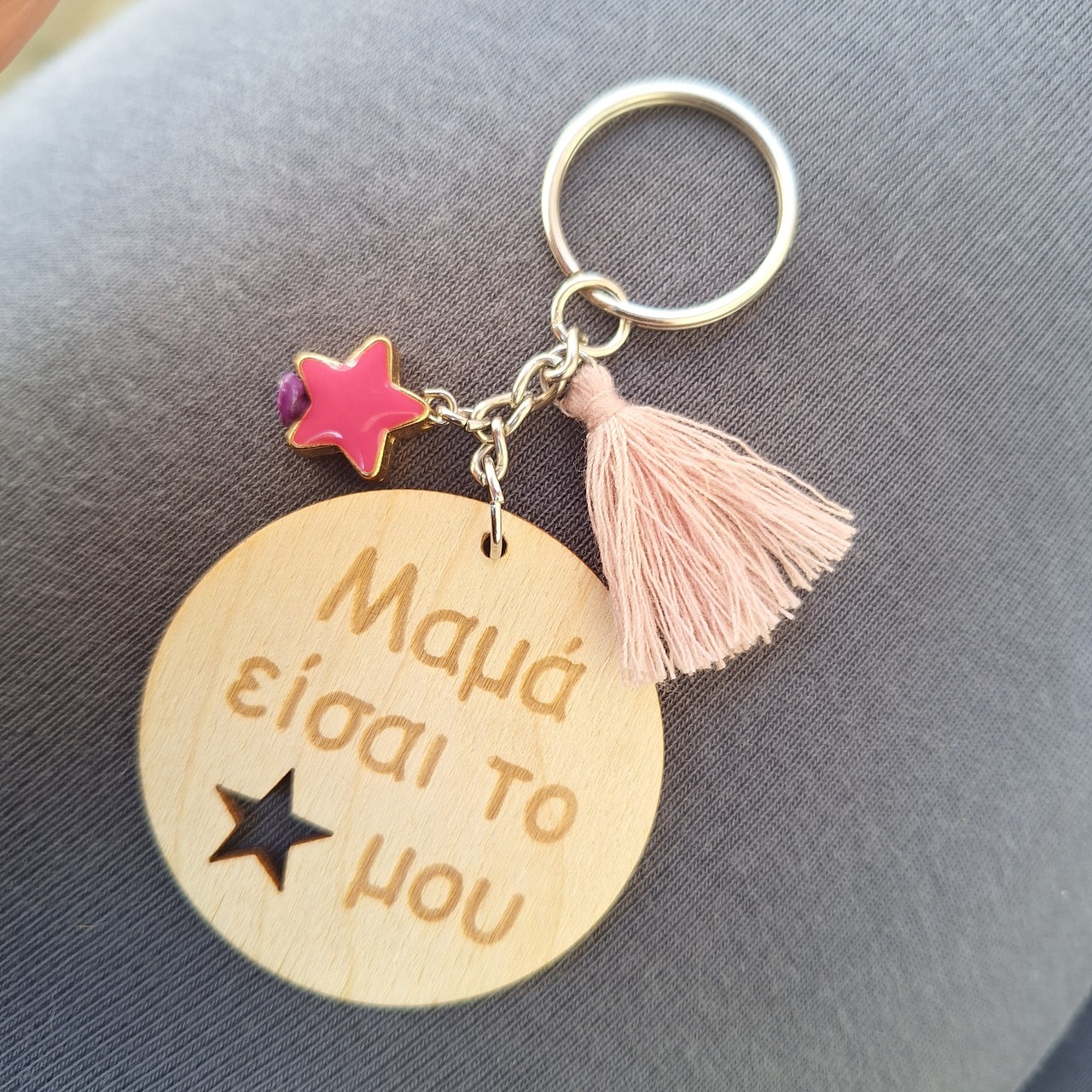 Ξύλινο μπρελόκ μαμα είσαι το αστέρι μου με φουντάκι και μεταλλικό αστέρι με σμάλτο