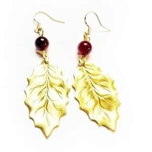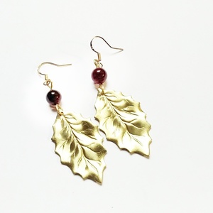 Σκουλαρίκια χρυσά ορειχάλκινα με φυλλαράκια και μπορντό χάντρα μάτι τίγρη